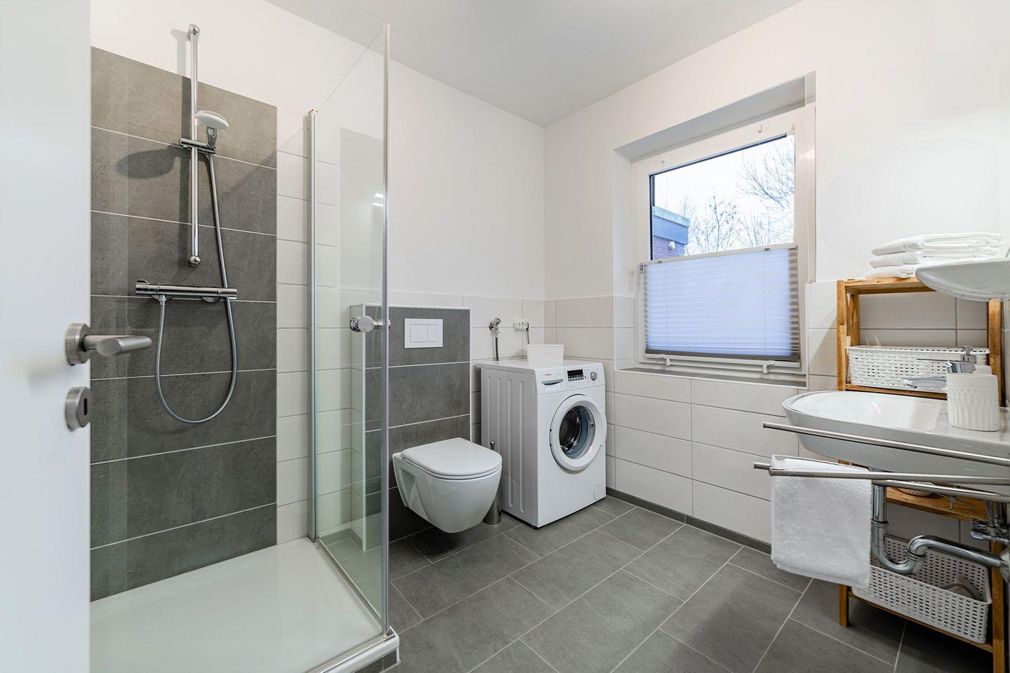 Ein modernes Badezimmer mit Dusche und Waschmaschine für zusätzlichen Komfort.