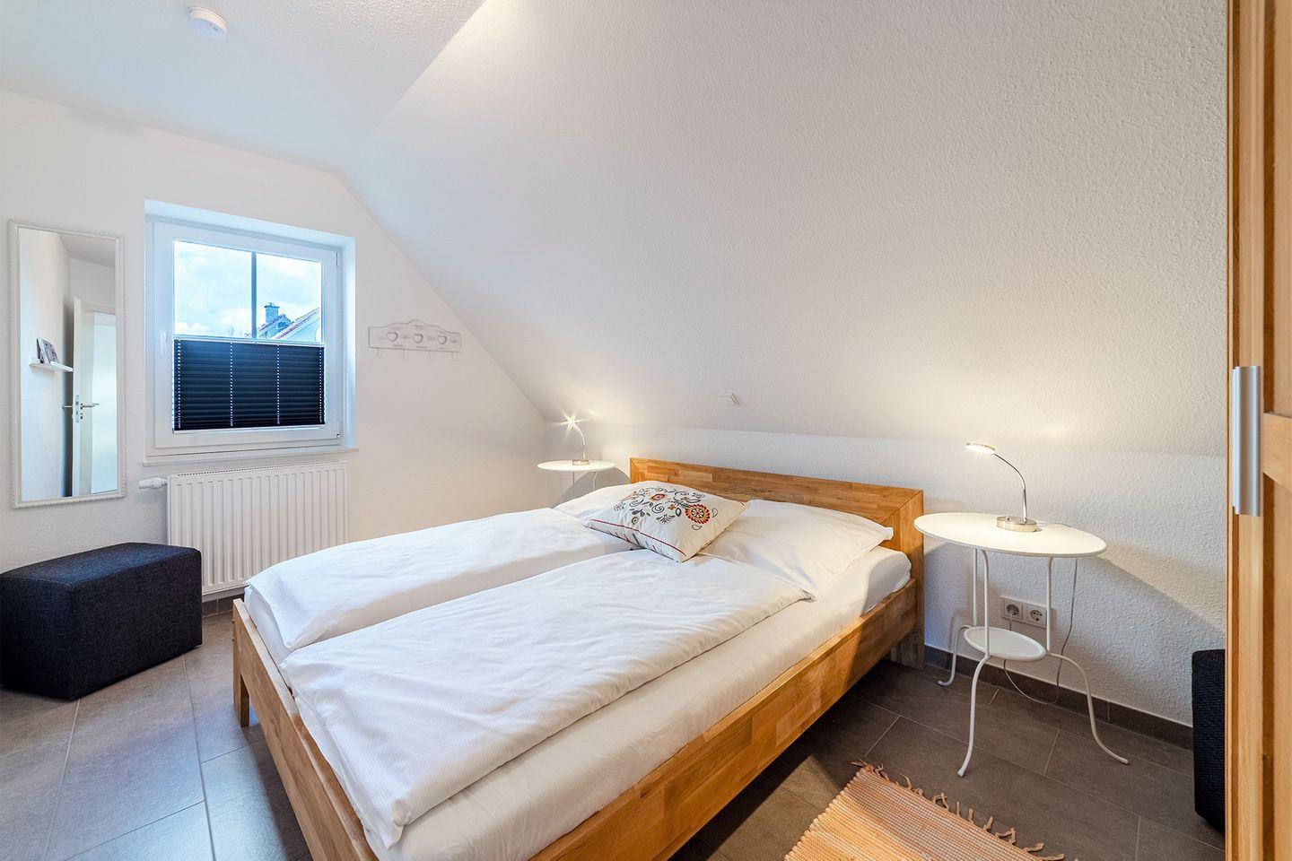 Das Schlafzimmer ist mit einem bequemen Doppelbett ausgestattet und bietet eine Verdunkelungsmöglichkeit.