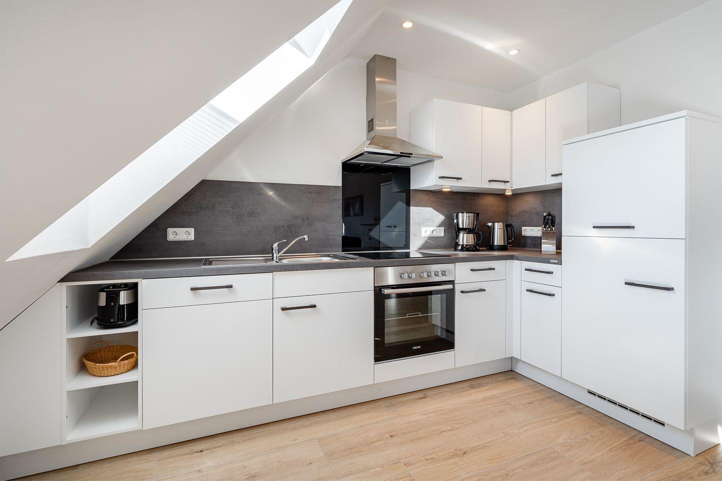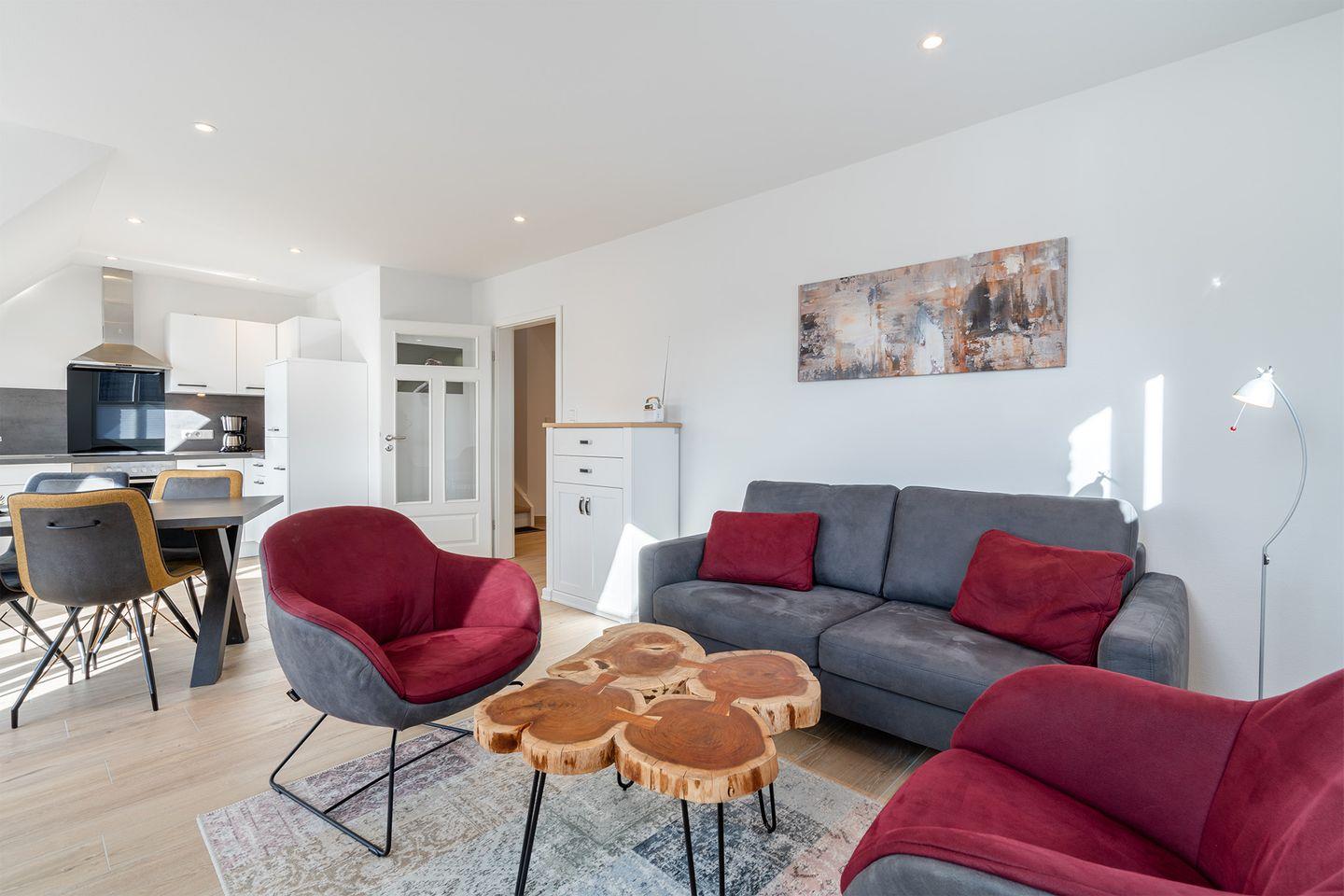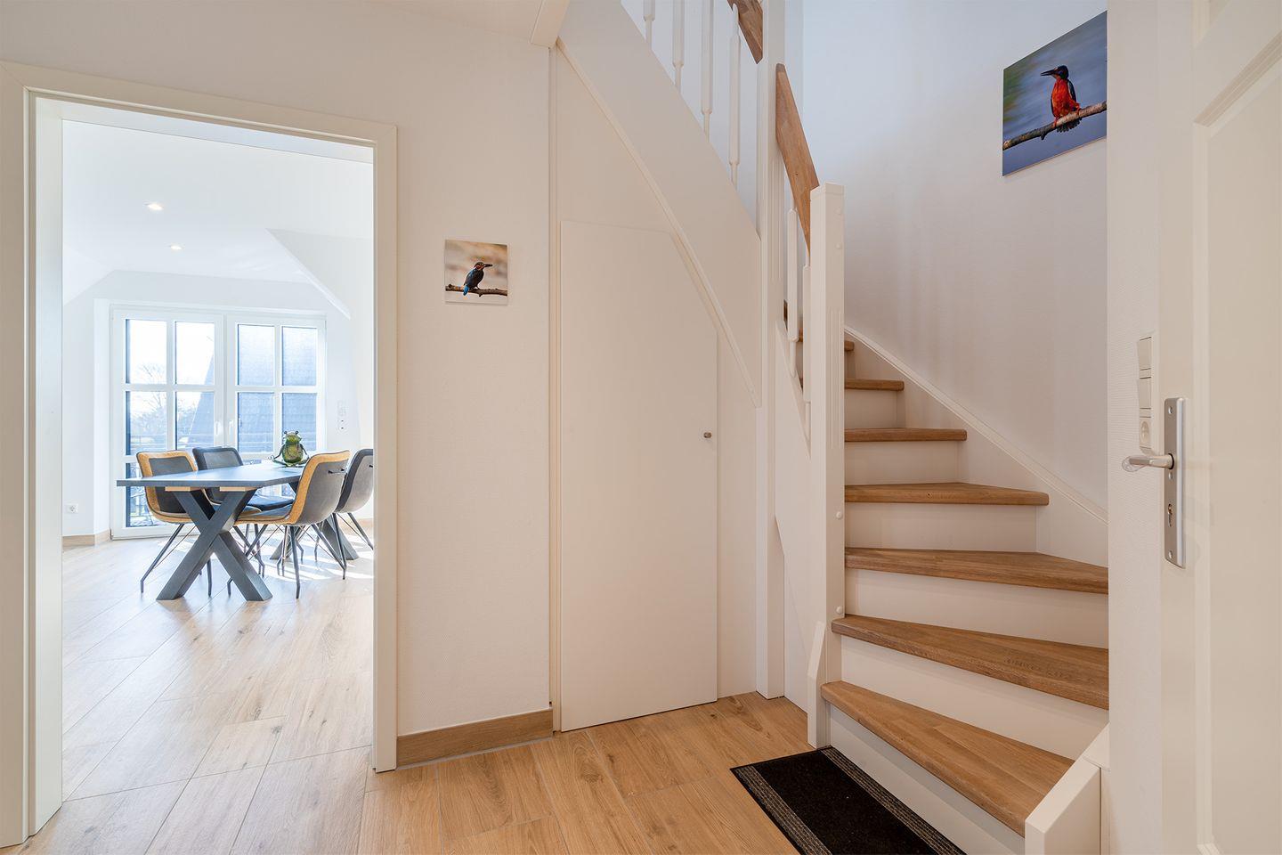 Die Ferienwohnung Eisvogel bietet modernen Komfort mit einem hellen Wohnbereich, voll ausgestatteter Küche, Schlafzimmer und stilvollem Badezimmer. Das Dachgeschoss mit zusätzlichem Fernseher und Funktionssofa bietet Platz für weitere Gäste. Genießen Sie die Nordseeluft auf dem Balkon mit elektrischer Markise. Ein PKW-Stellplatz, Fahrradraum und optionaler Wäschepaket-Service sorgen für einen sorglosen Aufenthalt. Ihr perfekter Urlaub an der Nordsee!