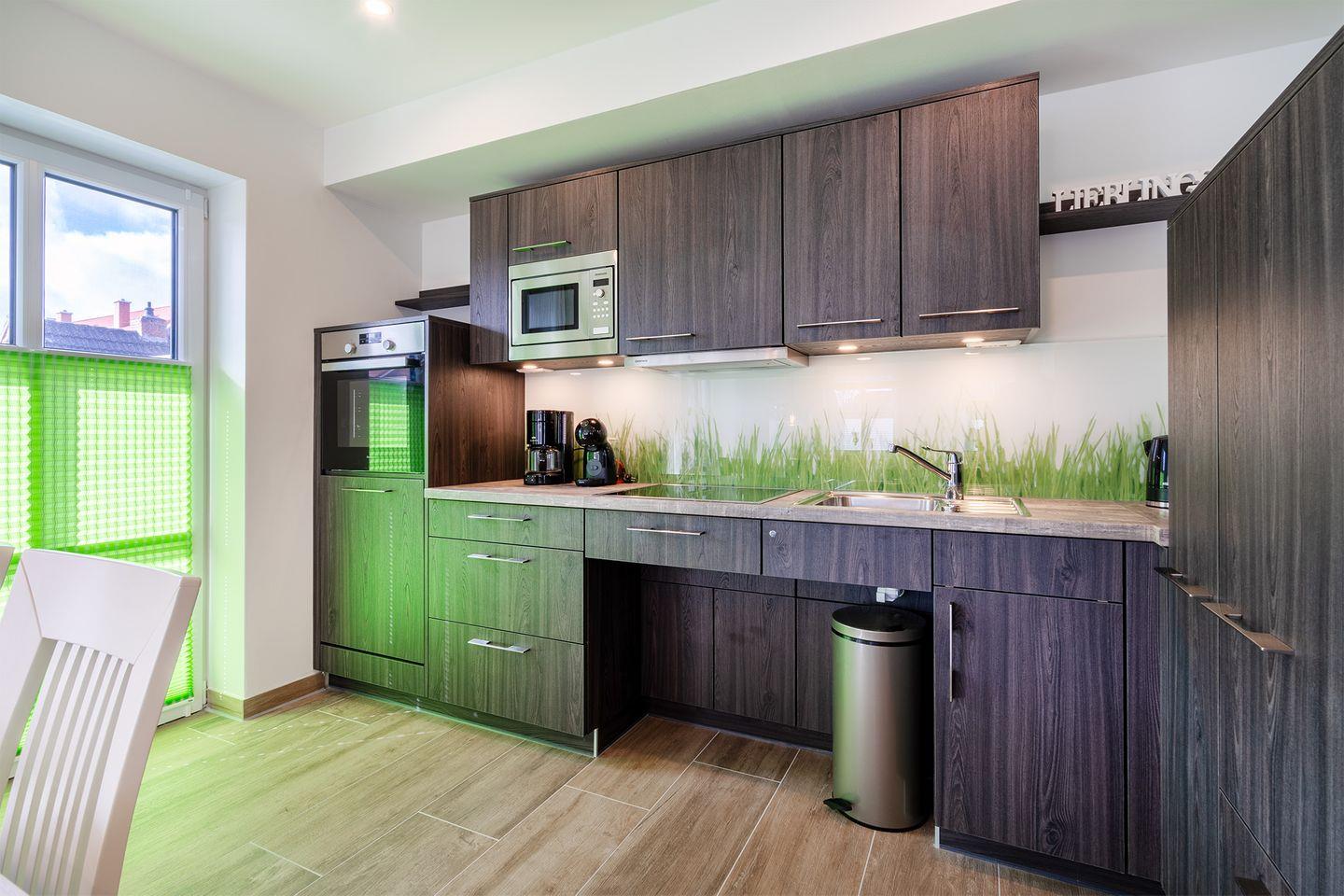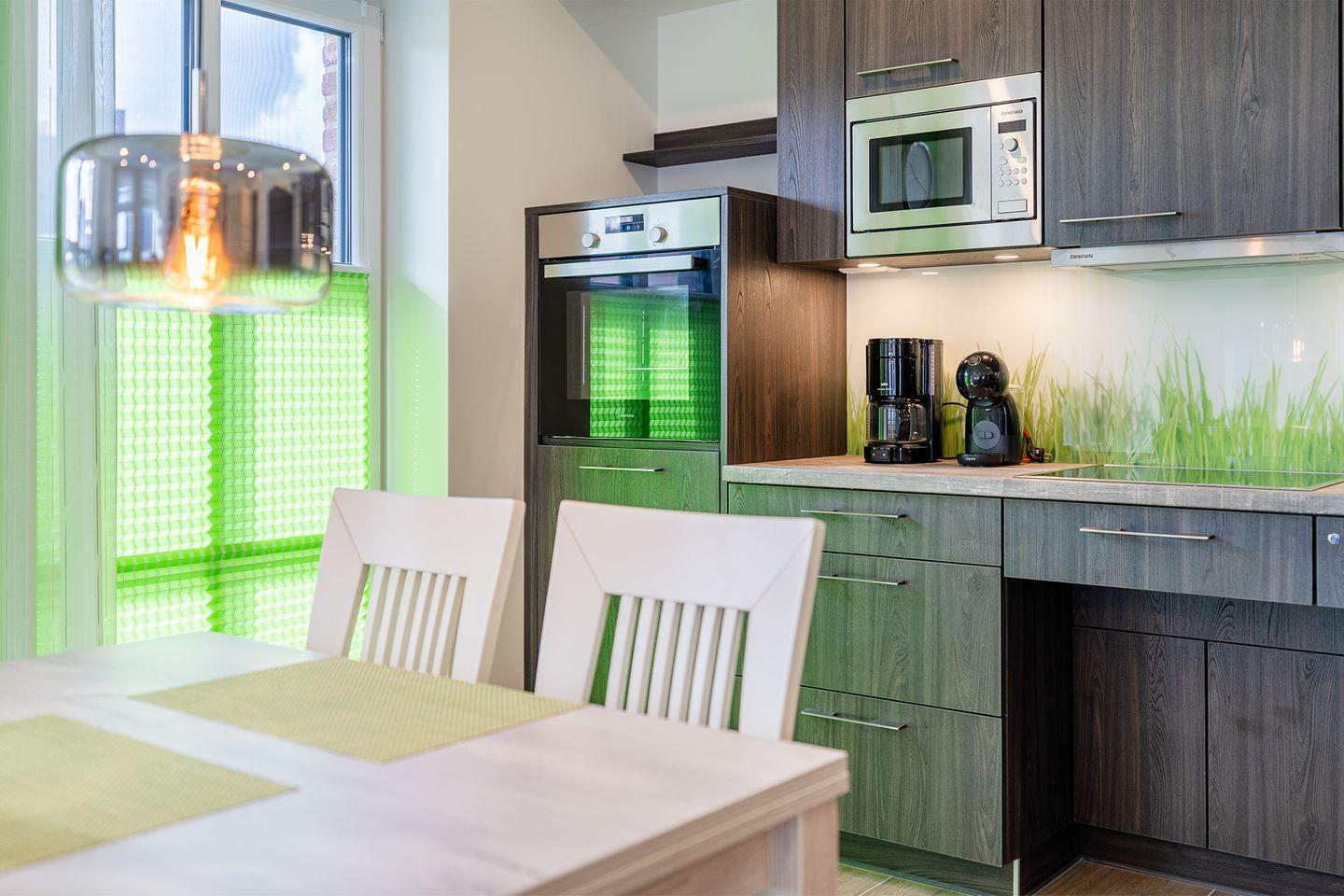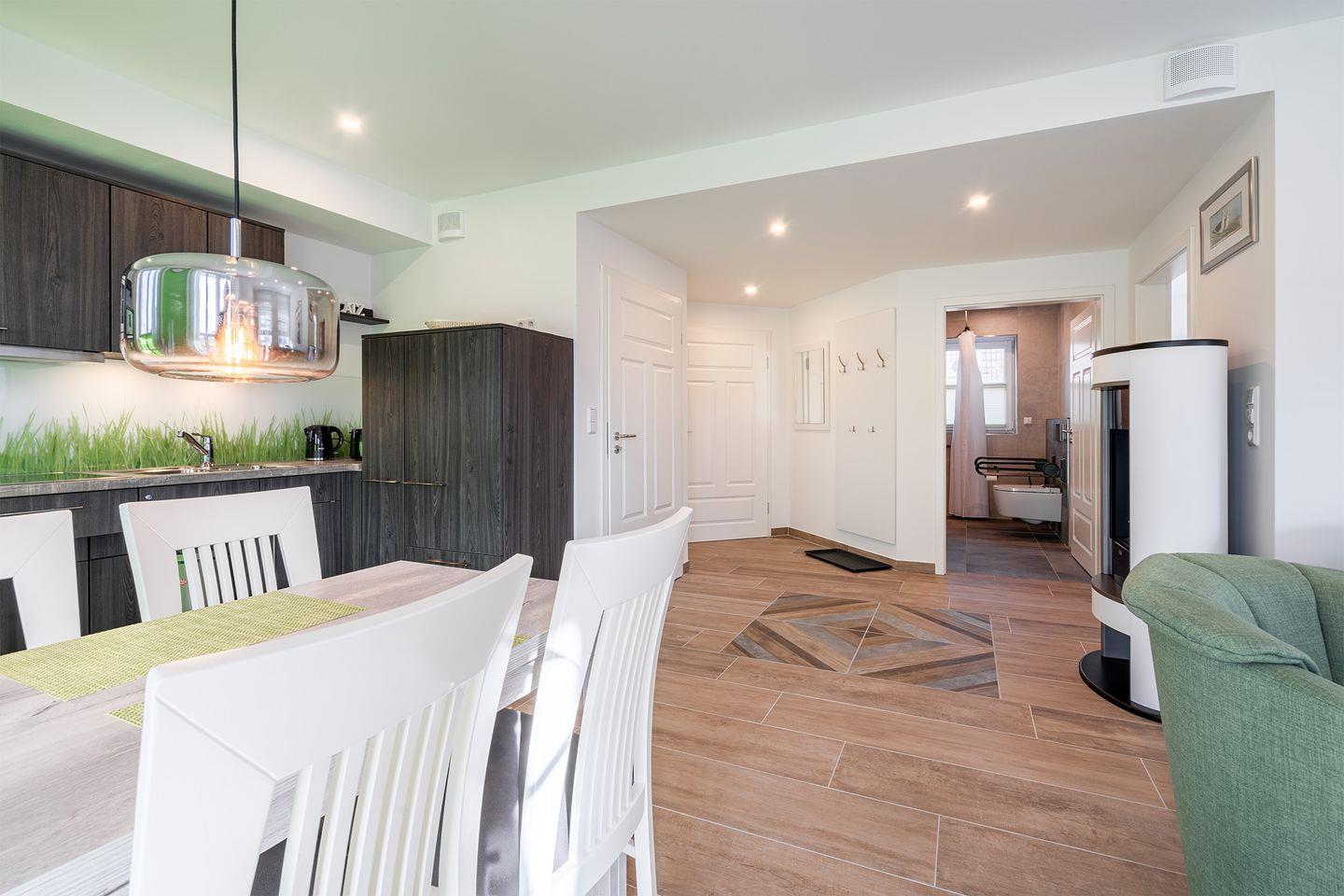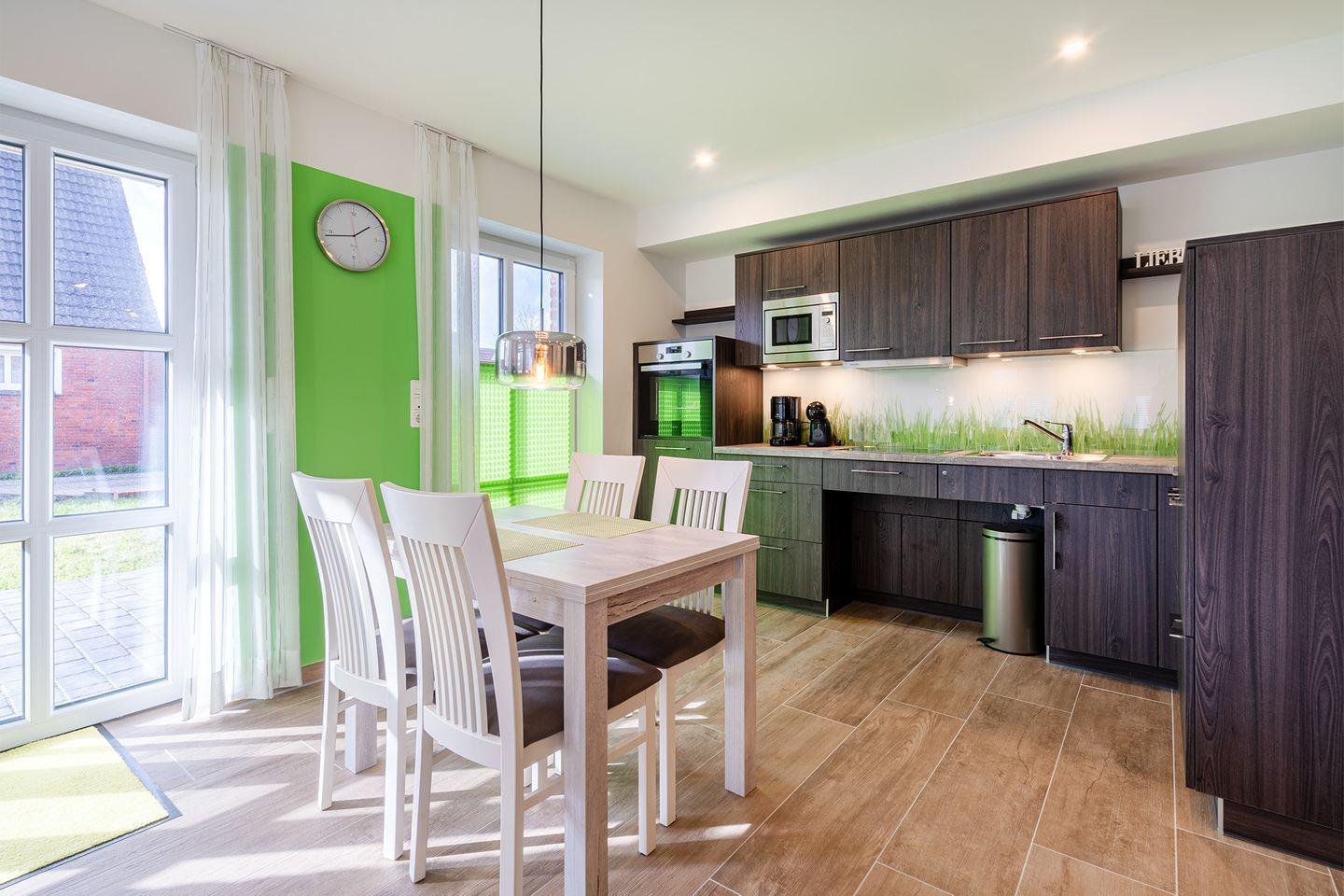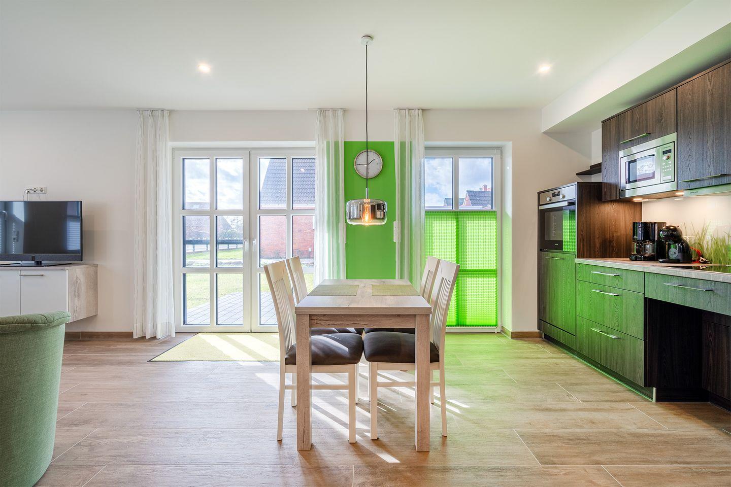 Wohnraum: Mit vollständig ausgestatteter Küche und einem hellen Essplatz. Gemütlicher Sitzbereich mit großem Fernseher.