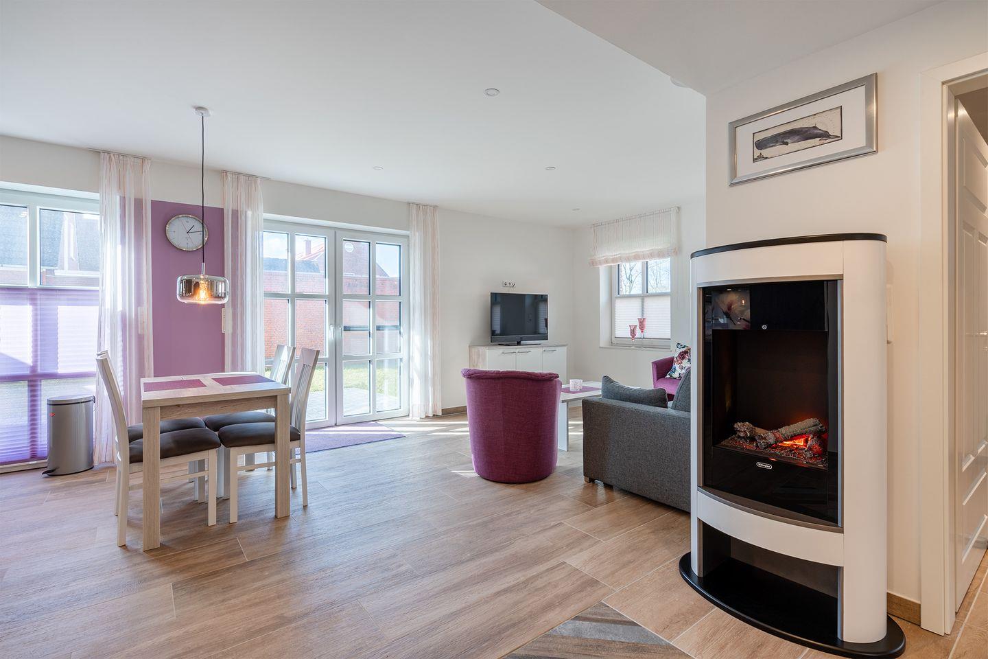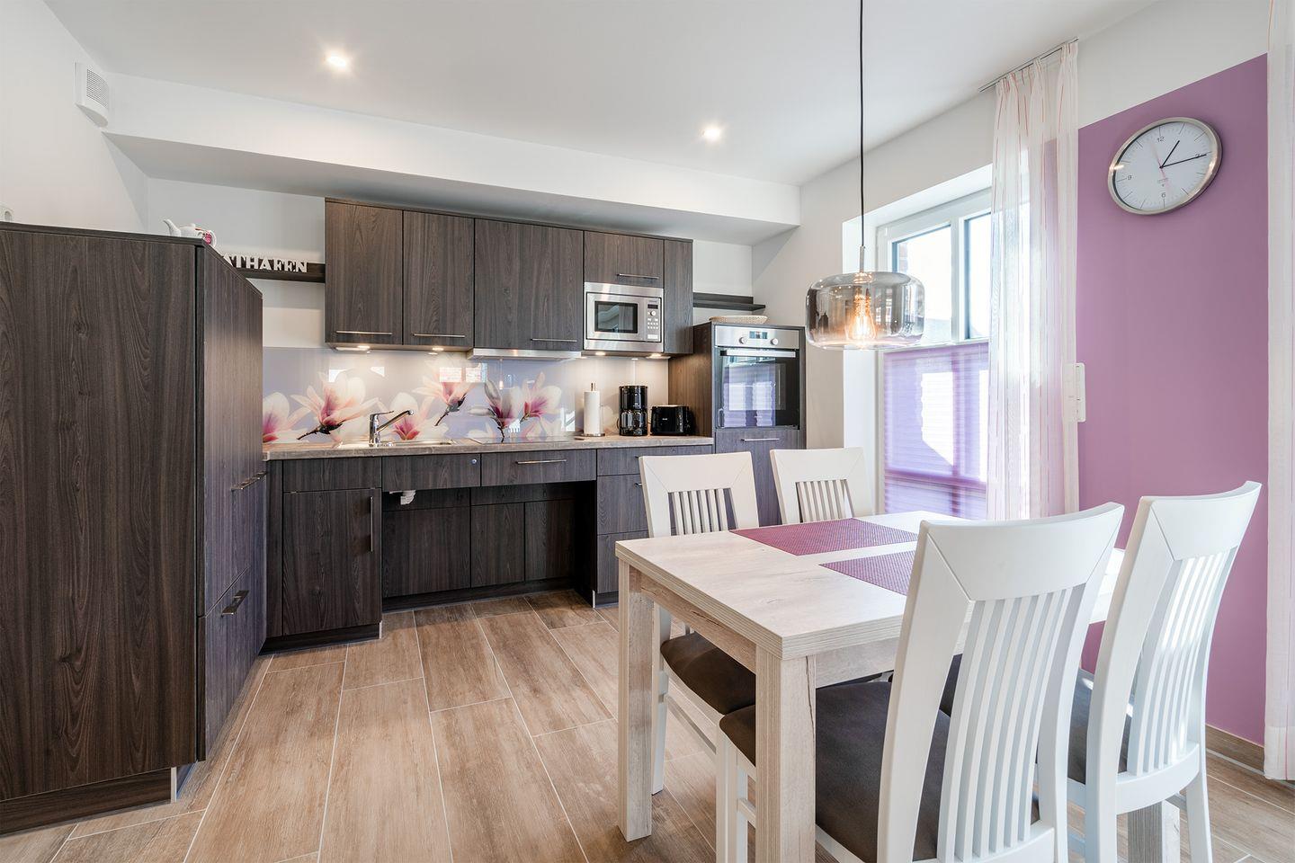 Wohnraum: Mit vollständig ausgestatteter Küche und einem hellen Essplatz.