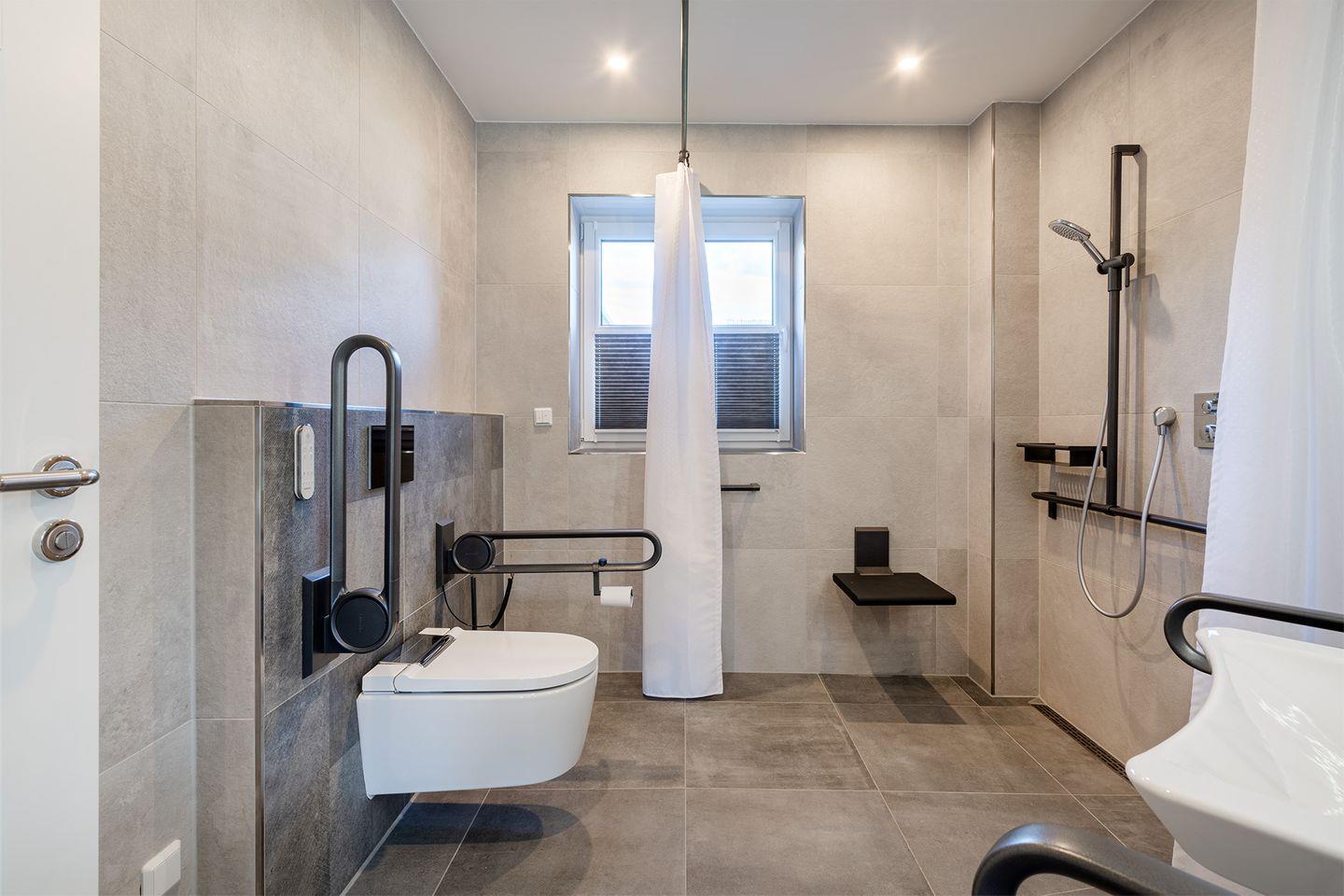 Duschbad: Behindertengerecht eingerichtet, mit einer vollautomatischen Toilette und Duschfunktion.