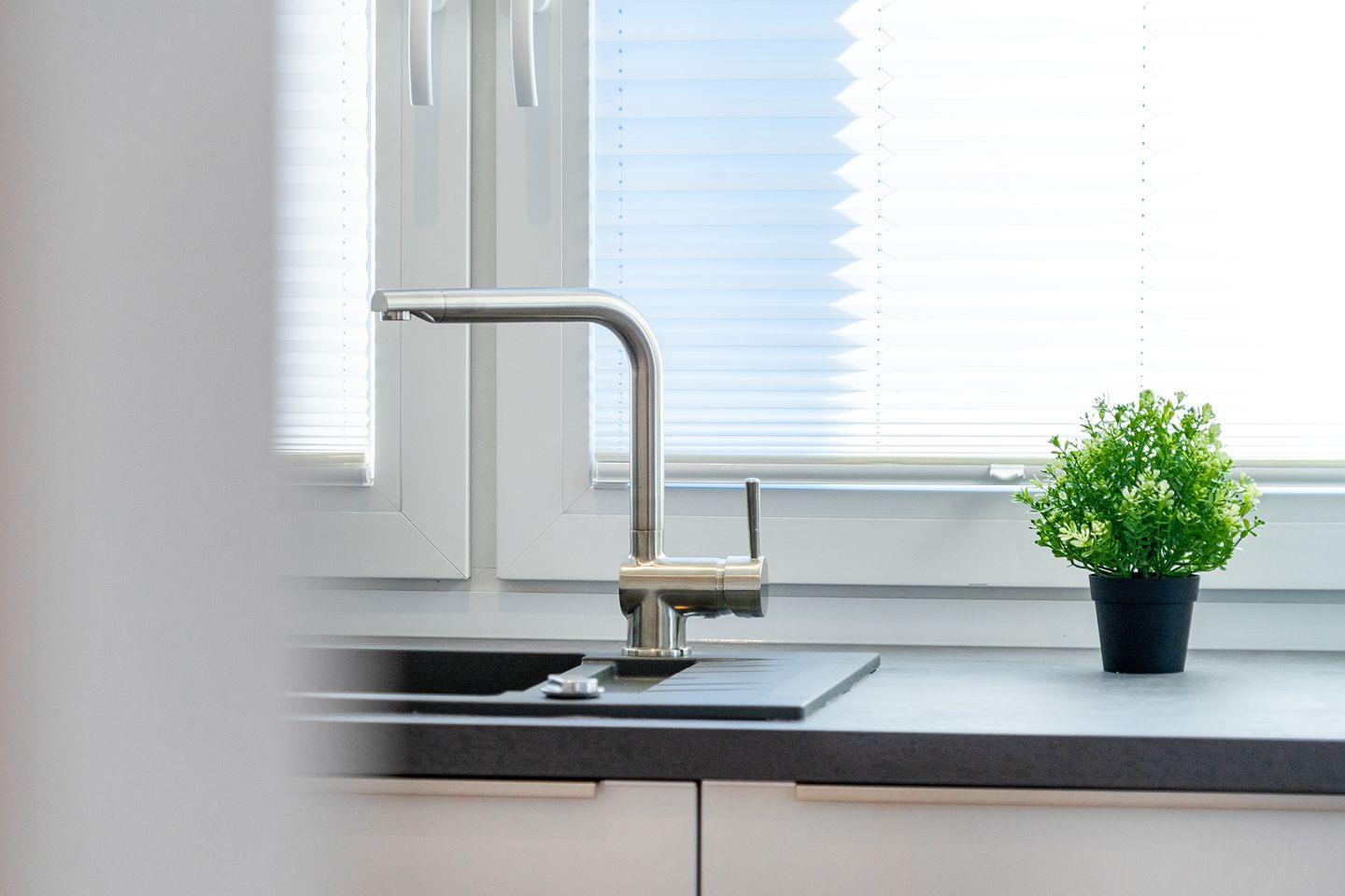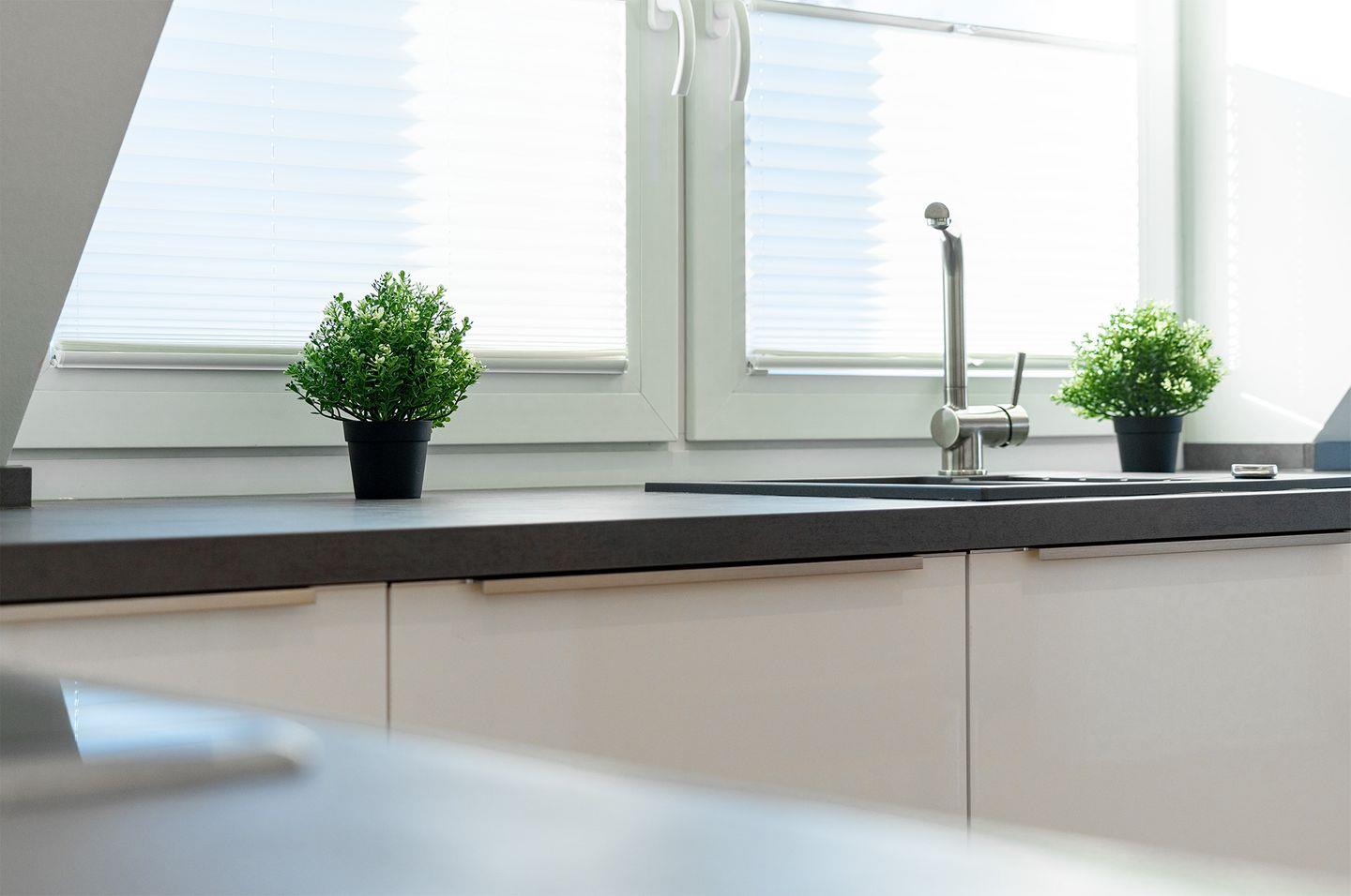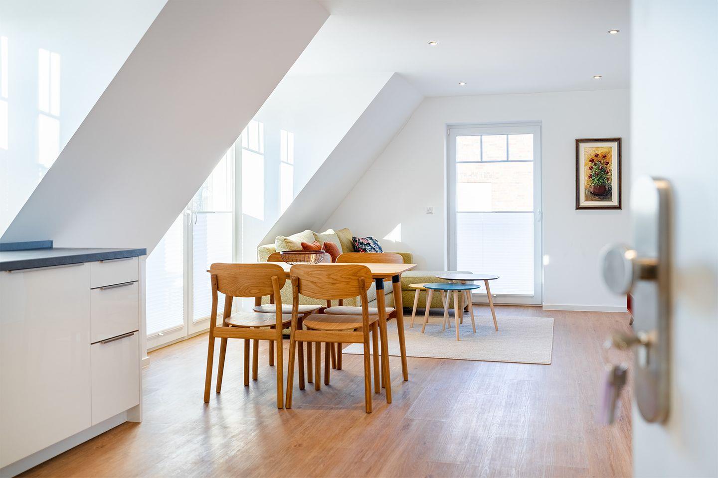Der großzügige, helle Wohn-Essbereich mit moderner Küche lädt zum gemeinsamen Kochen und Verweilen ein. Die Küche ist voll ausgestattet und bietet alles, was Sie für Ihre Mahlzeiten oder ein gemütliches Frühstück benötigen.
