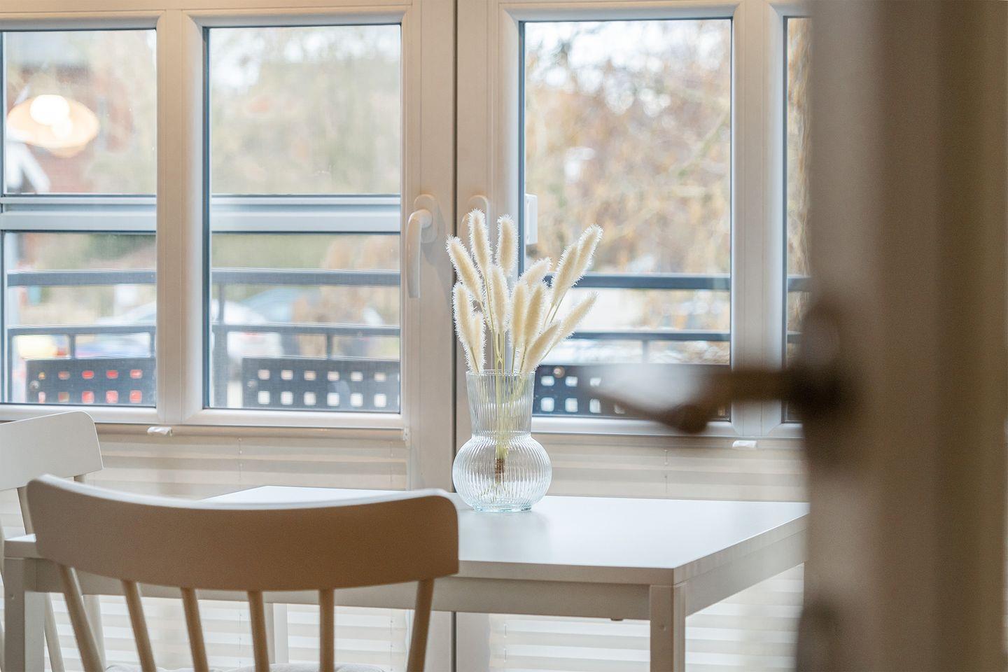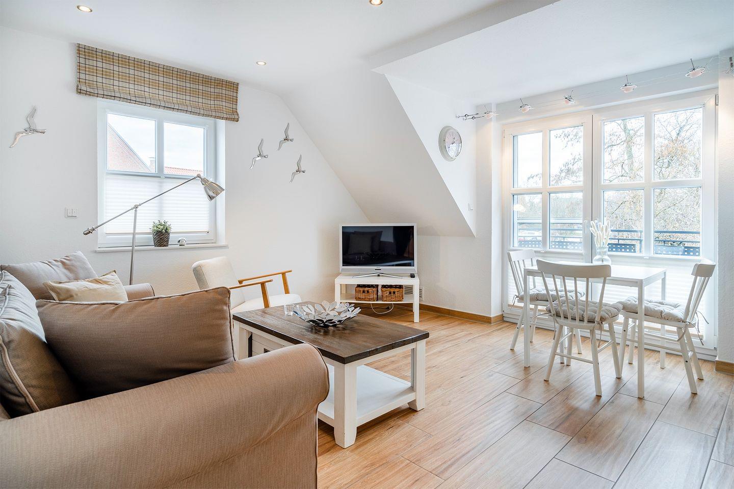 Der offene Wohn-Essbereich ist gemütlich eingerichtet und bietet mit einer modernen Küche und einem TV alles, was Sie für ein entspanntes Frühstück oder ein gemütliches Abendessen brauchen. Bodentiefe Fenster sorgen für eine helle und einladende Atmosphäre, und der Balkon lädt im Sommer zum Entspannen und Genießen der frischen Luft ein.
