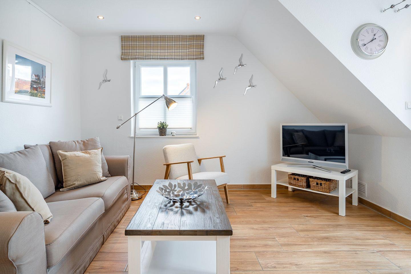 Die Wohnung liegt nur wenige Gehminuten vom Edeka-Markt und verschiedenen Restaurants, Bäckereien, Eisdielen und Kneipen entfernt. Der Hafen ist ebenfalls schnell erreicht, ideal für Spaziergänge und zum Genießen der maritimen Atmosphäre.