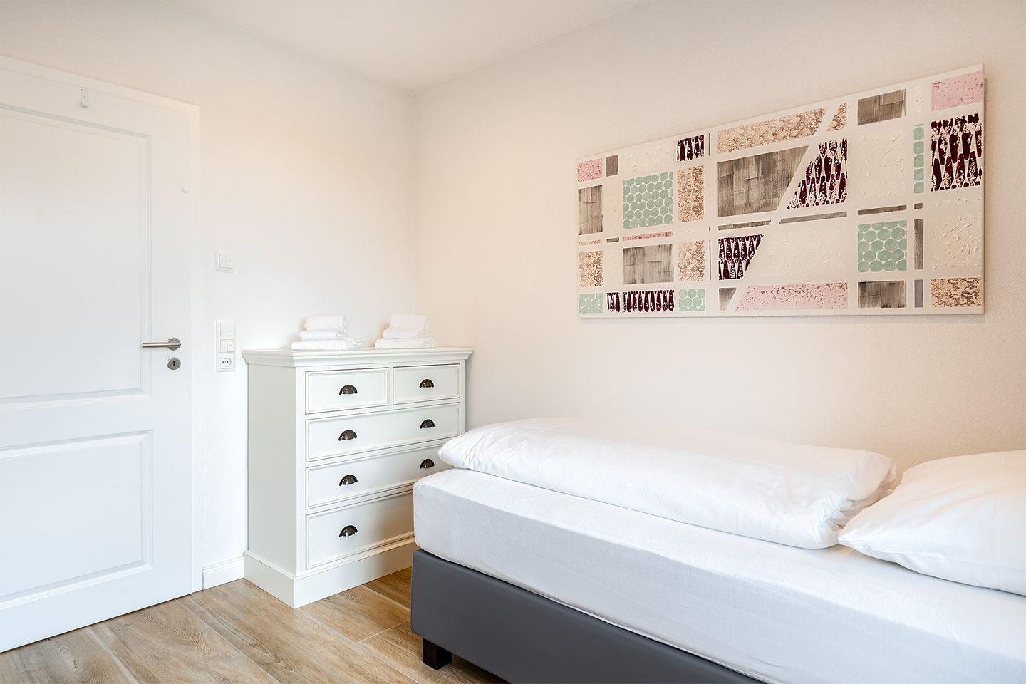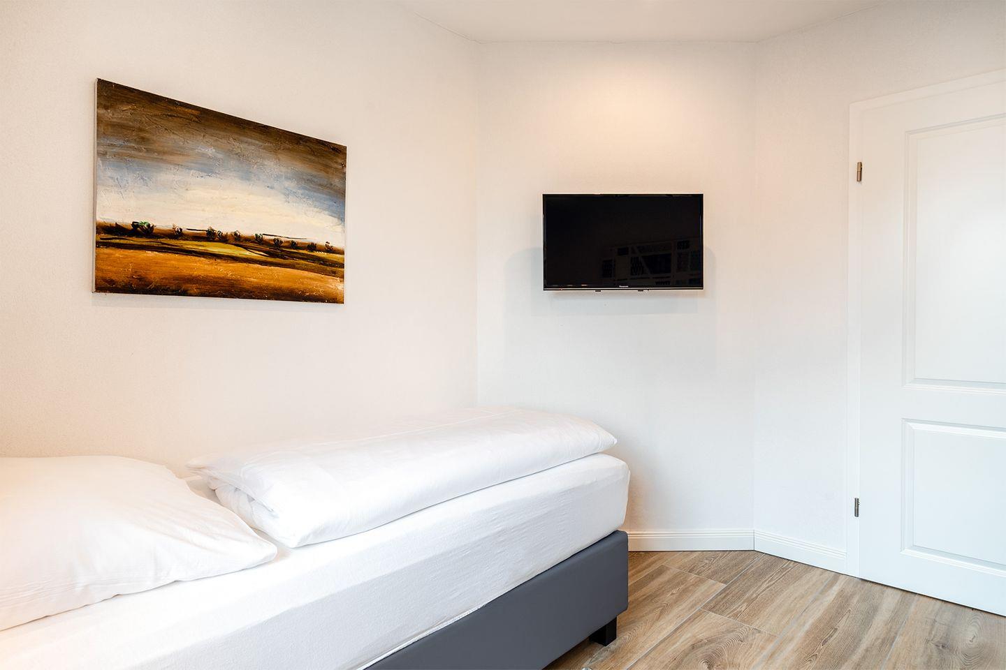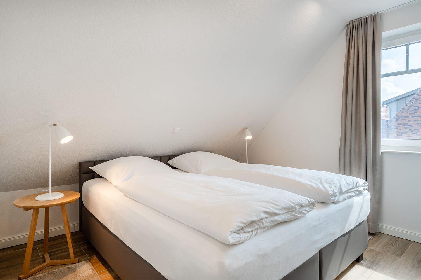 Das dritte Schlafzimmer im Dachgeschoss ist ebenfalls mit einem 180x200 cm Boxspringbett und einem Flachbild-SAT-TV ausgestattet.