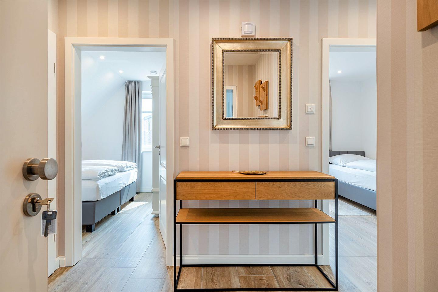 Moderne Obergeschosswohnung in Hafennähe mit offenem Wohn-Essbereich und moderner Küche. Schlafzimmer mit Boxspringbett, Bäder mit bodengleicher Dusche. Lichtdurchflutete Räume dank bodentiefer Fenster. PKW-Stellplatz und großer Abstellraum für Fahrräder, inklusive E-Bike-Ladestation. Sommerbalkon mit Gartenmöbeln ideal zum Entspannen.
