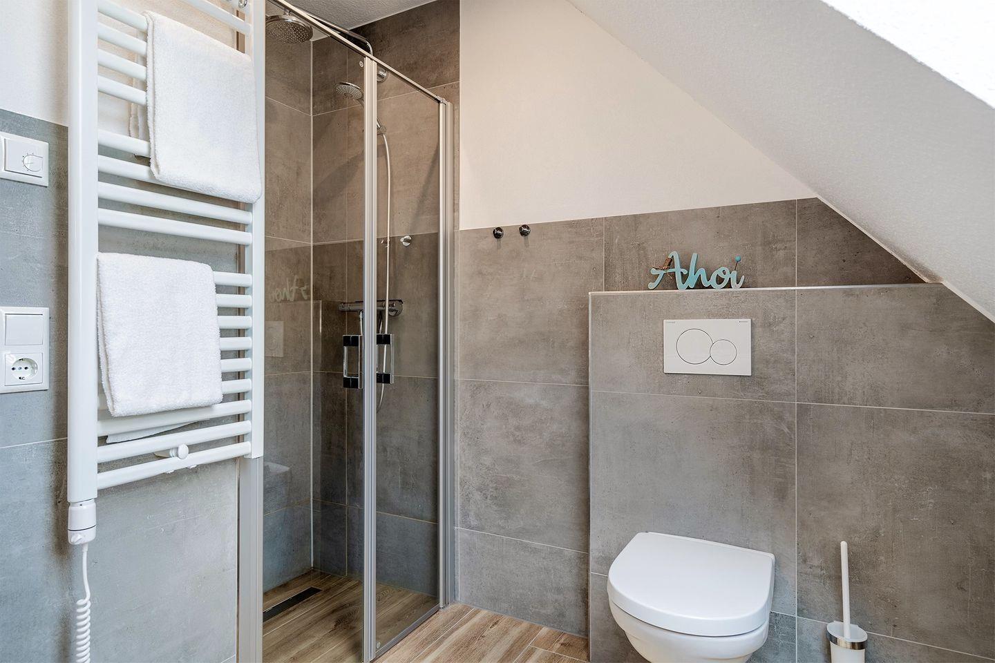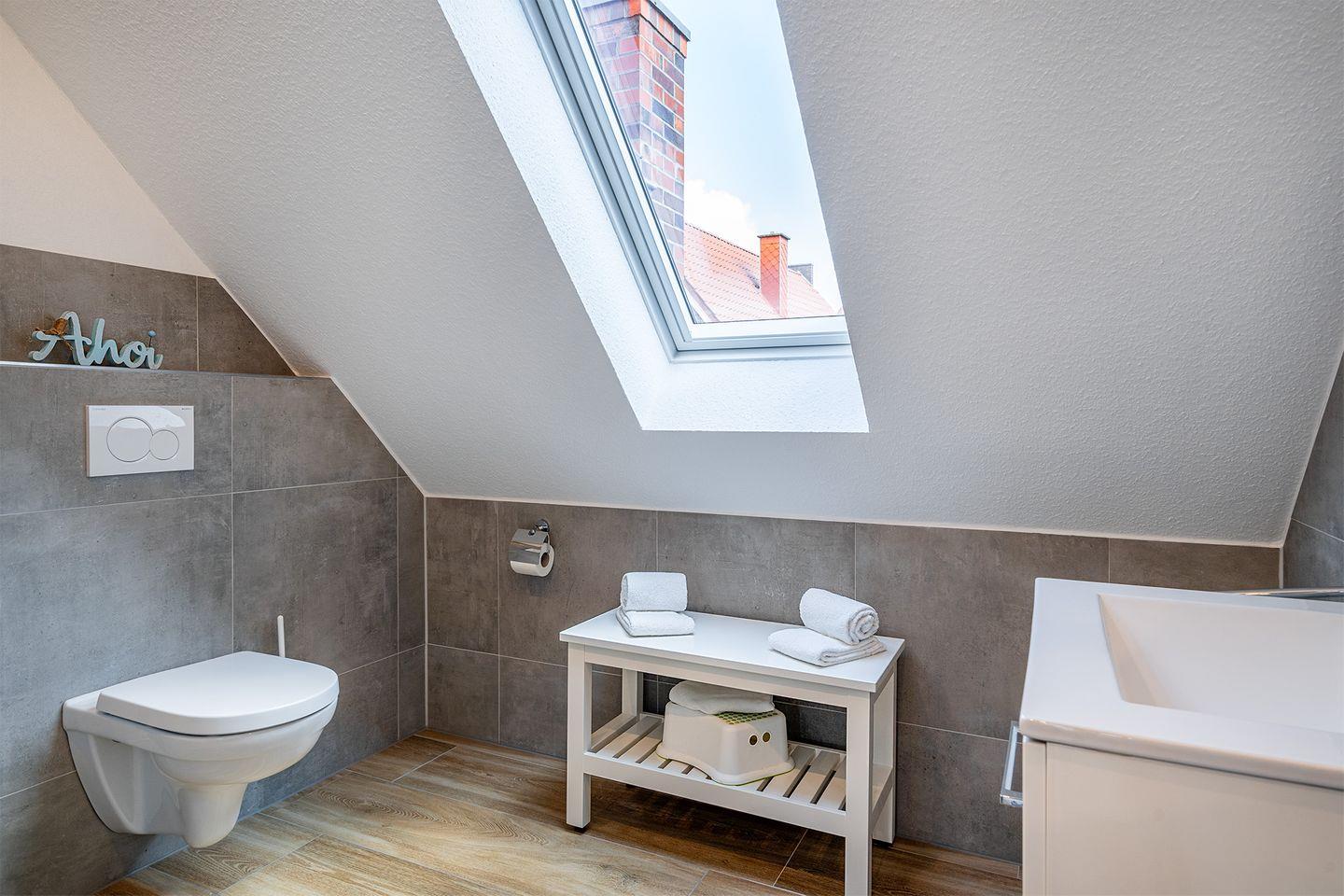 Im zweiten Bad im Dachgeschoss sind ein WC und eine Dusche vorhanden. Bitte beachten Sie, dass die Räume im Dachgeschoss nicht beheizt sind.