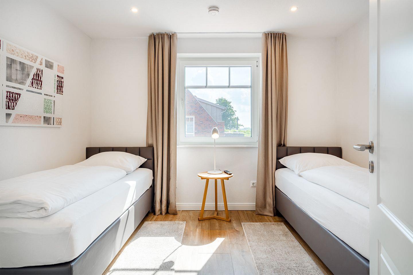 Das zweite Schlafzimmer verfügt über zwei einzelne Boxspringbetten (je 90x200 cm), die bei Bedarf zusammengeschoben werden können, und einen Flachbild-SAT-TV.