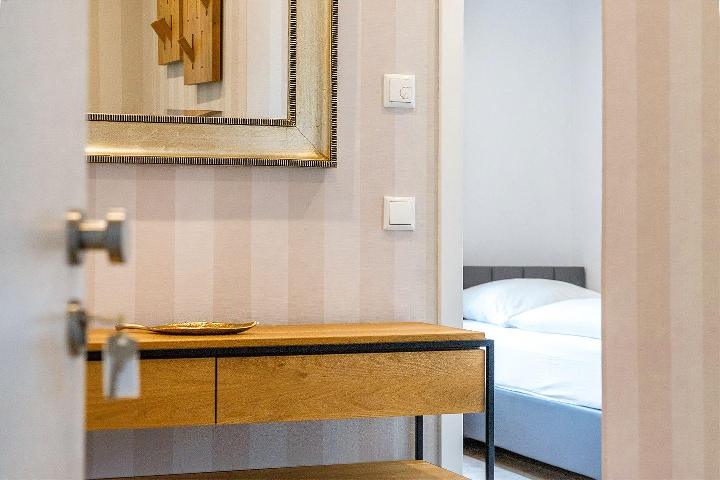 Das erste Schlafzimmer ist mit einem komfortablen 180x200 cm Boxspringbett ausgestattet.