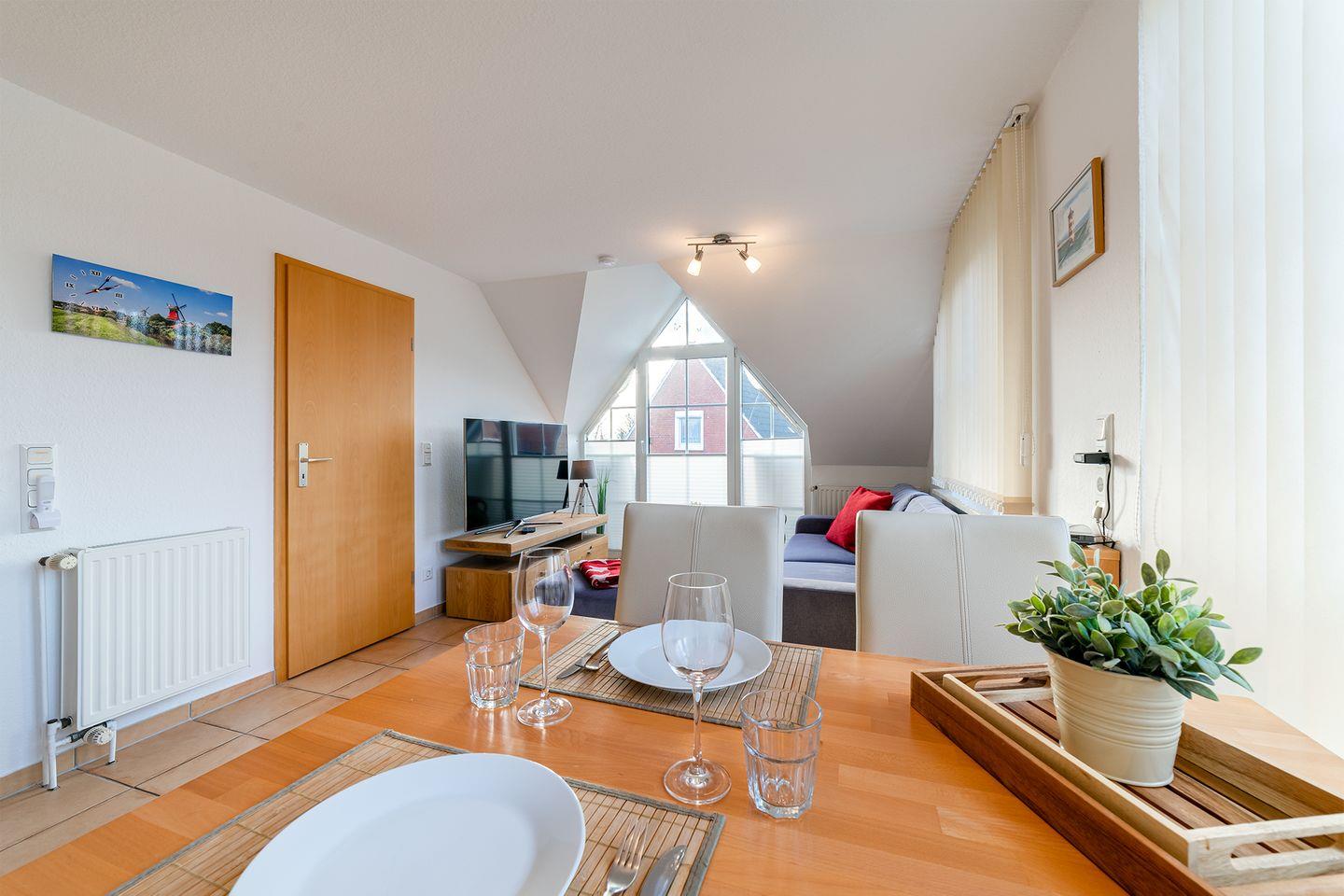 Die Ferienwohnung "Mühlenblick 05" in Greetsiel bietet einen großzügigen Wohn- und Essbereich, zwei Schlafzimmer für insgesamt vier Personen, ein Badezimmer mit Dusche und WC sowie ein gemütliches Dachgeschoss zum Entspannen. Die Wohnung ist hochwertig möbliert und bietet einen Balkon mit Blick auf eine der Zwillingsmühlen. Ein PKW-Stellplatz und ein abschließbarer Fahrradraum stehen zur Verfügung. Genießen Sie einen erholsamen Urlaub in dieser komfortablen und ruhigen Ferienwohnung.