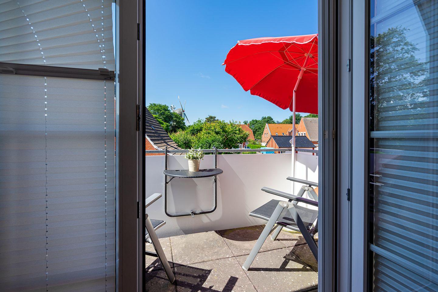 Genießen Sie die ruhige Atmosphäre auf Ihrem Balkon mit direktem Blick auf eine der beiden Zwillingsmühlen – der ideale Ort, um den Tag ausklingen zu lassen.