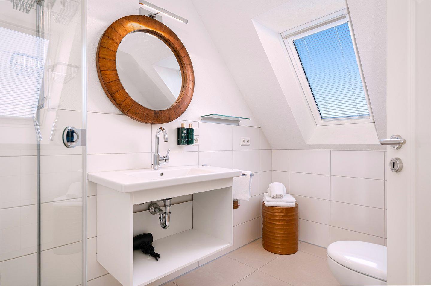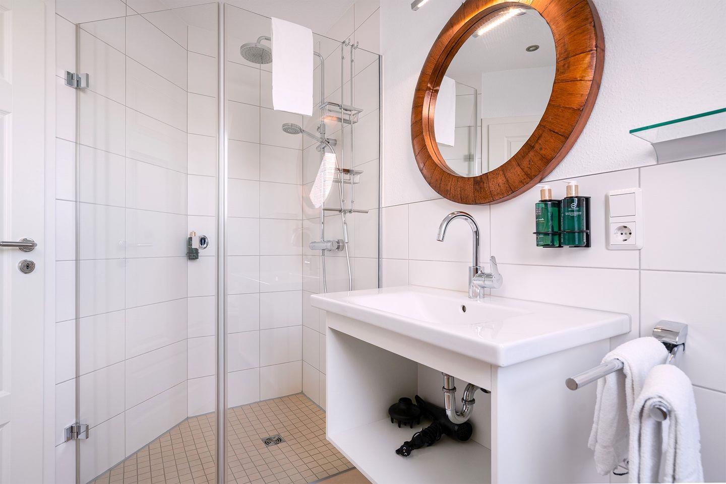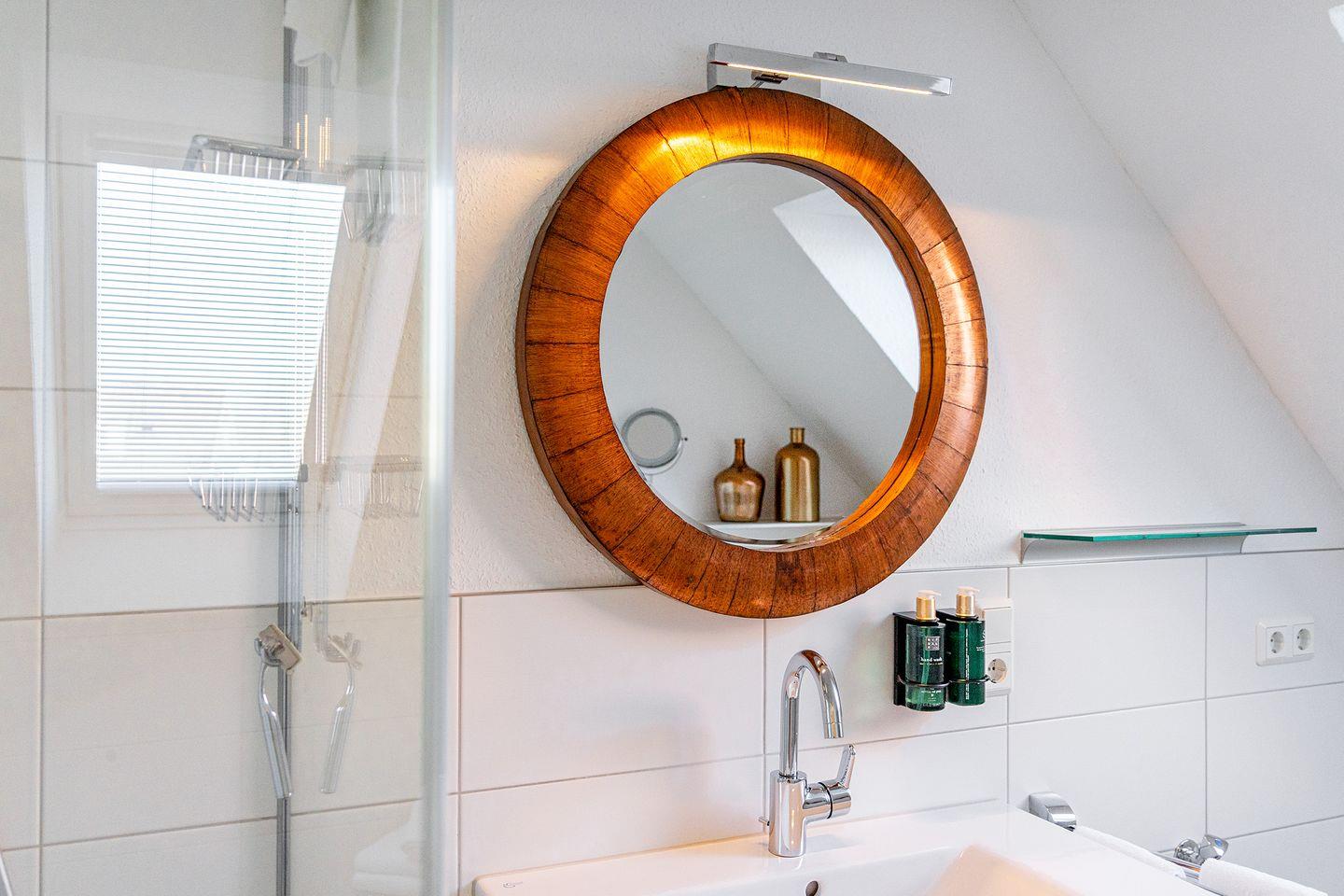 Badezimmer: Das Badezimmer verfügt über eine elegante bodengleiche Dusche, die mit einem "Raindancer"-Duschkopf ausgestattet ist, um Ihnen ein luxuriöses Duscherlebnis zu bieten.