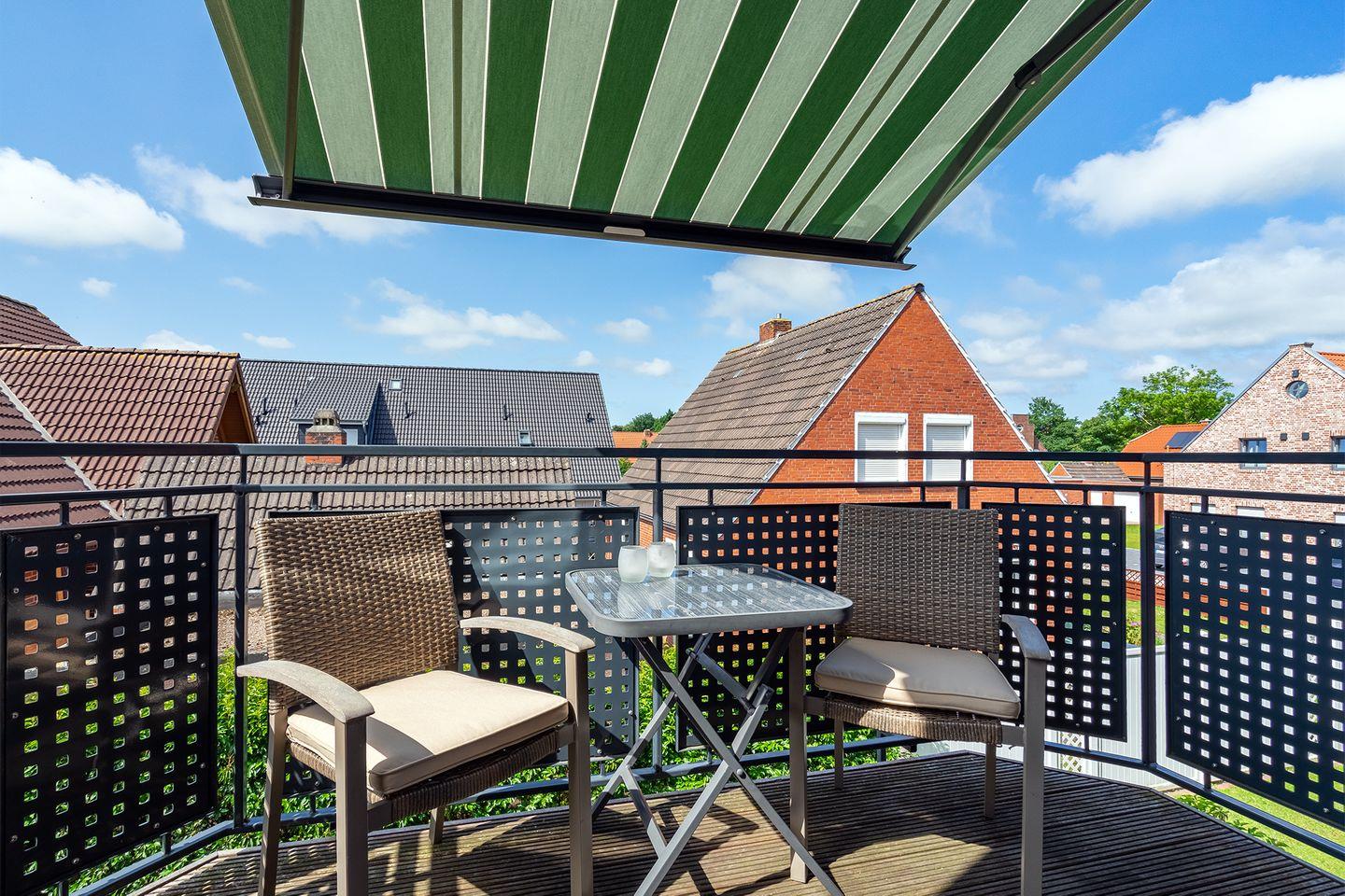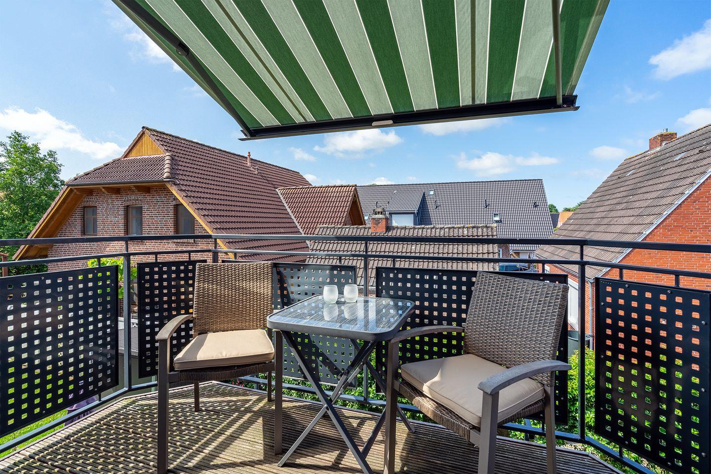 Die 64 qm große Wohnung verfügt über einen großzügigen Wohnraum mit vollständig ausgestatteter Küche, hellem Essbereich und gemütlicher Fernsehecke. Auf einem geschützten Balkon mit ruhiger Südwestlage können Sie einen schönen Urlaubstag an der Nordsee ausklingen lassen. Vor zu viel Sonne am Tag schützt eine elektrisch ausfahrbare Markise, die auch im Wohnbereich ein angenehmes Licht gibt.??