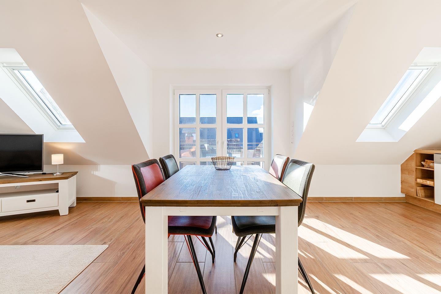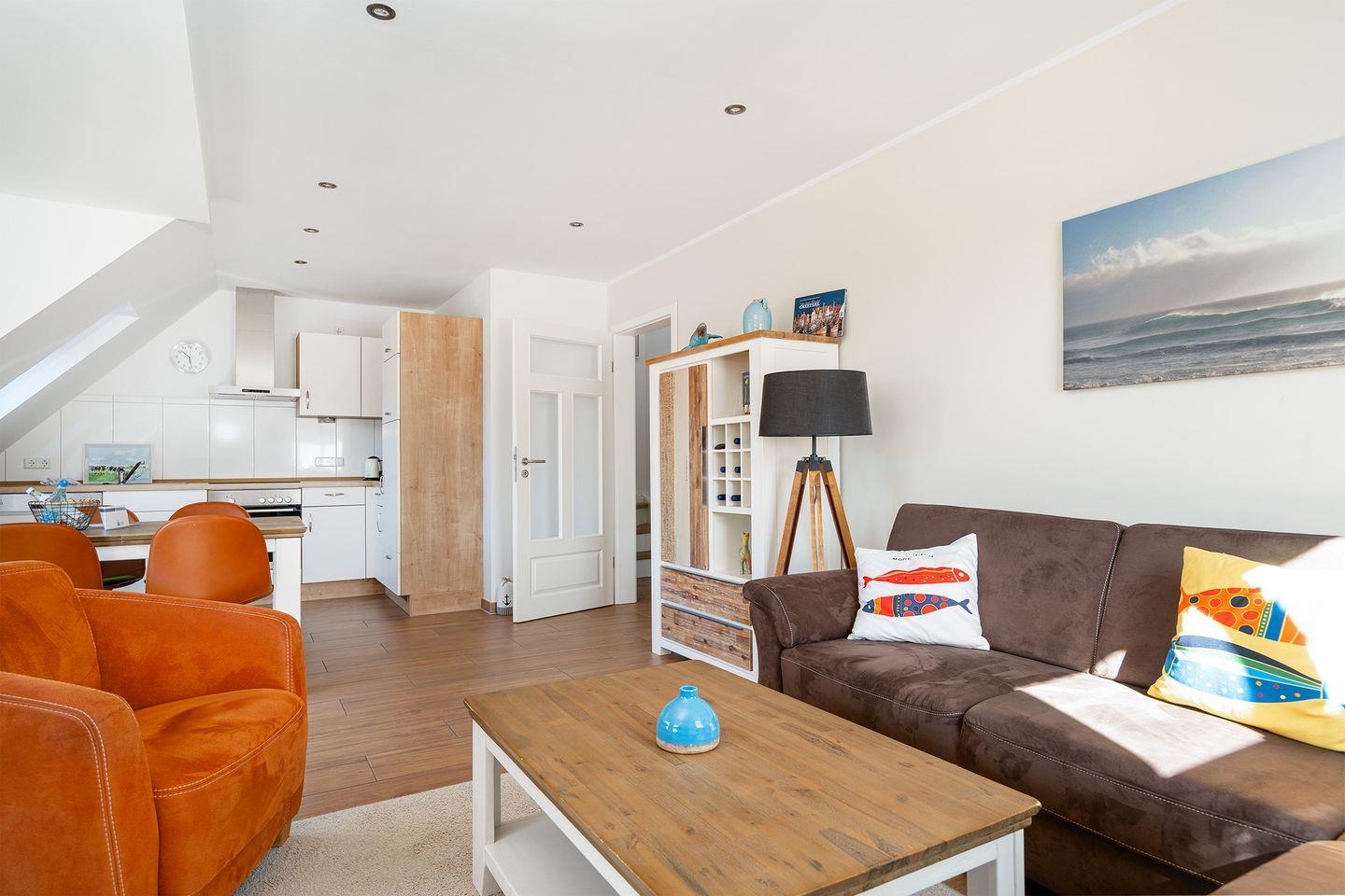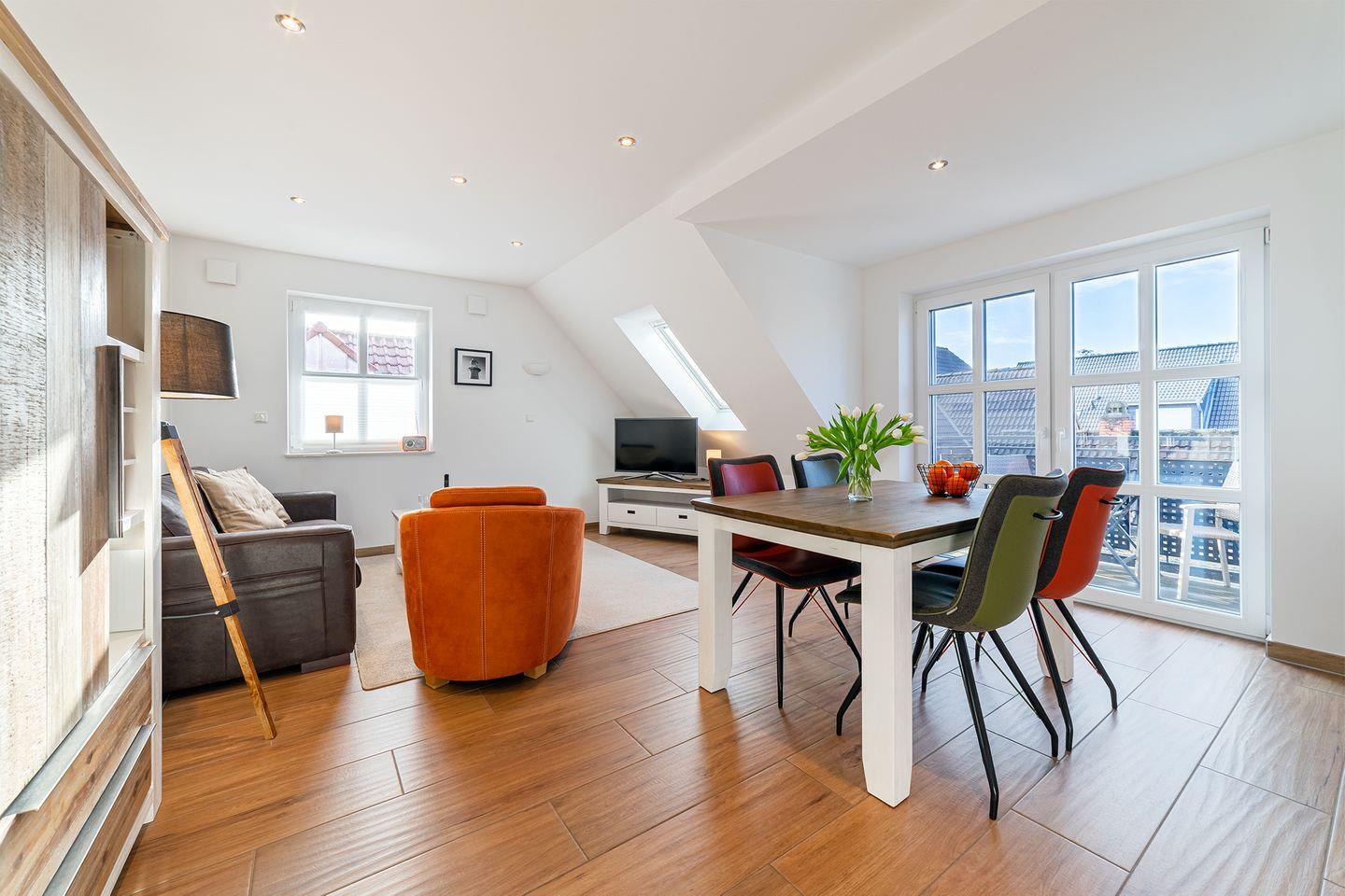 Die Ferienwohnung bietet einen Wohnraum mit voll ausgestatteter Küche, gemütlichem Essplatz und einem hellen Sitzbereich. Das geschmackvoll eingerichtete Duschbad und der geschützte Balkon mit Südwestlage laden zum Verweilen ein. Im Dachgeschoss befindet sich ein Studio mit Panoramafenster und zwei gemütlichen Kojen als zusätzliche Schlafmöglichkeit. Fußbodenheizung im gesamten Wohnbereich, Fliegengitter, ein PKW Stellplatz und eine abschließbare Fahrradbox machen es vollständig.