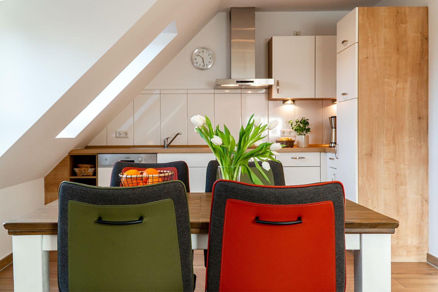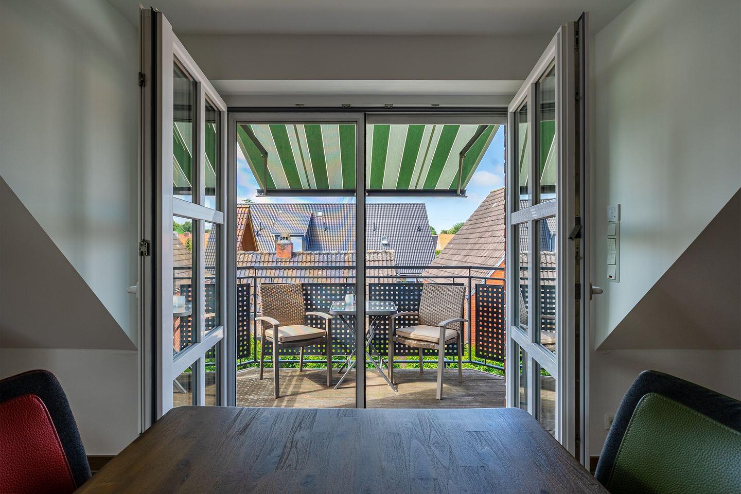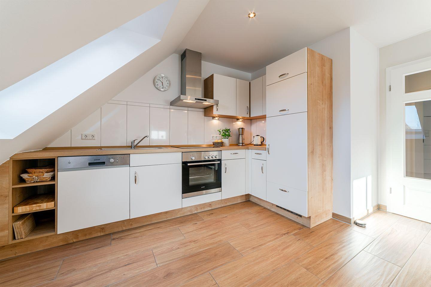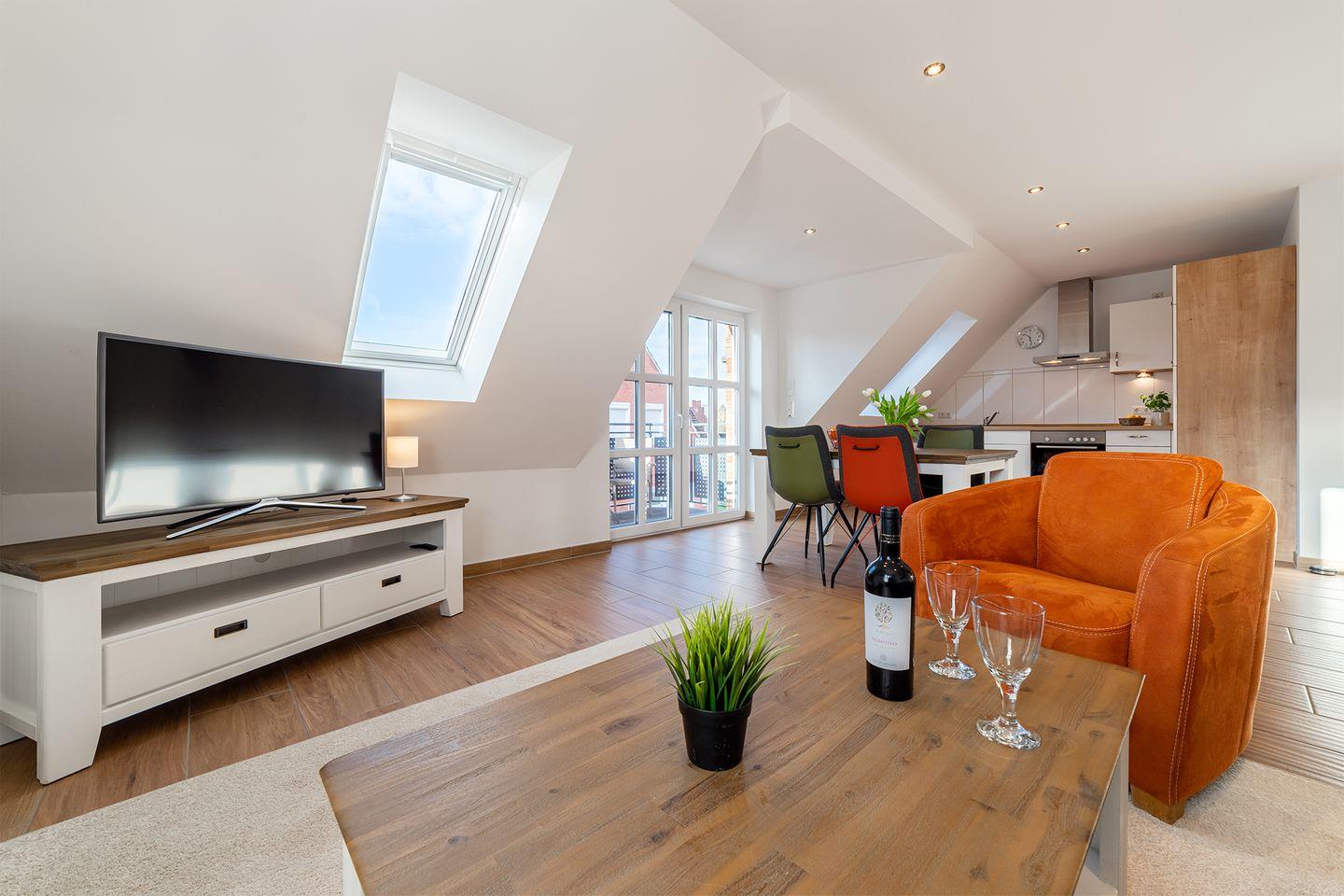 Die Ferienwohnung bietet einen Wohnraum mit voll ausgestatteter Küche, gemütlichem Essplatz und einem hellen Sitzbereich. Das geschmackvoll eingerichtete Duschbad und der geschützte Balkon mit Südwestlage laden zum Verweilen ein. Im Dachgeschoss befindet sich ein Studio mit Panoramafenster und zwei gemütlichen Kojen als zusätzliche Schlafmöglichkeit. Fußbodenheizung im gesamten Wohnbereich, Fliegengitter, ein PKW Stellplatz und eine abschließbare Fahrradbox machen es vollständig.