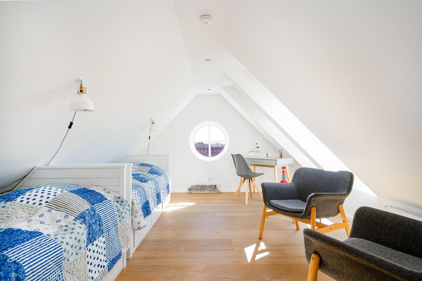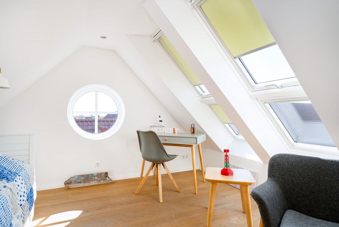 Das „Studio“ im Dachgeschoss mit einem großen Panoramafenster und Blick auf die Greetsieler Mühlen erreichen Sie über eine Holztreppe. Zwei gemütliche Kojen bieten eine 3. und 4. Schlafmöglichkeit.