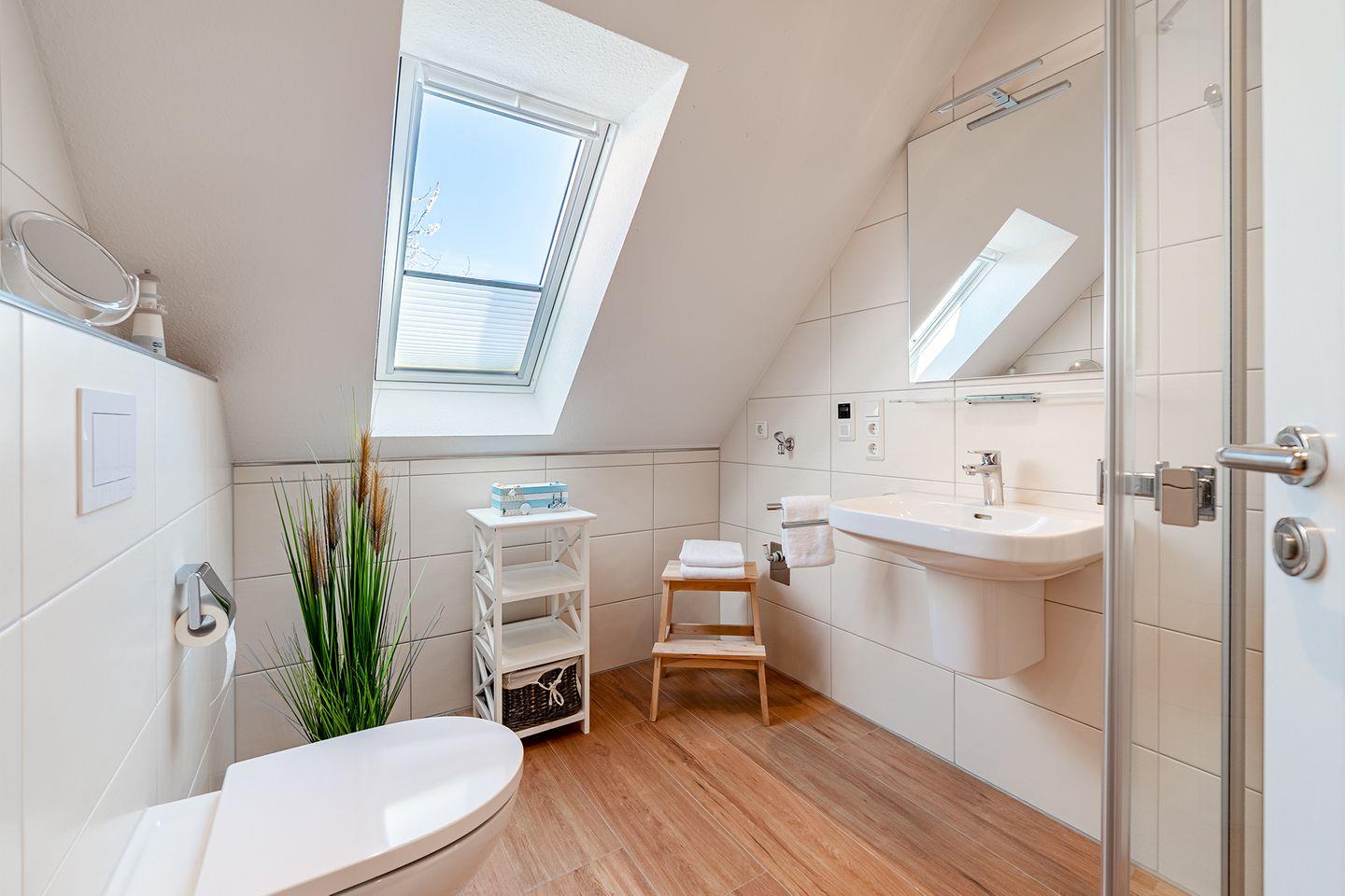 Das Bad bietet eine bodengleiche Dusche mit "Raindancer", WC, ein Fenster für ausreichend Tageslicht und ein festinstalliertes Radio