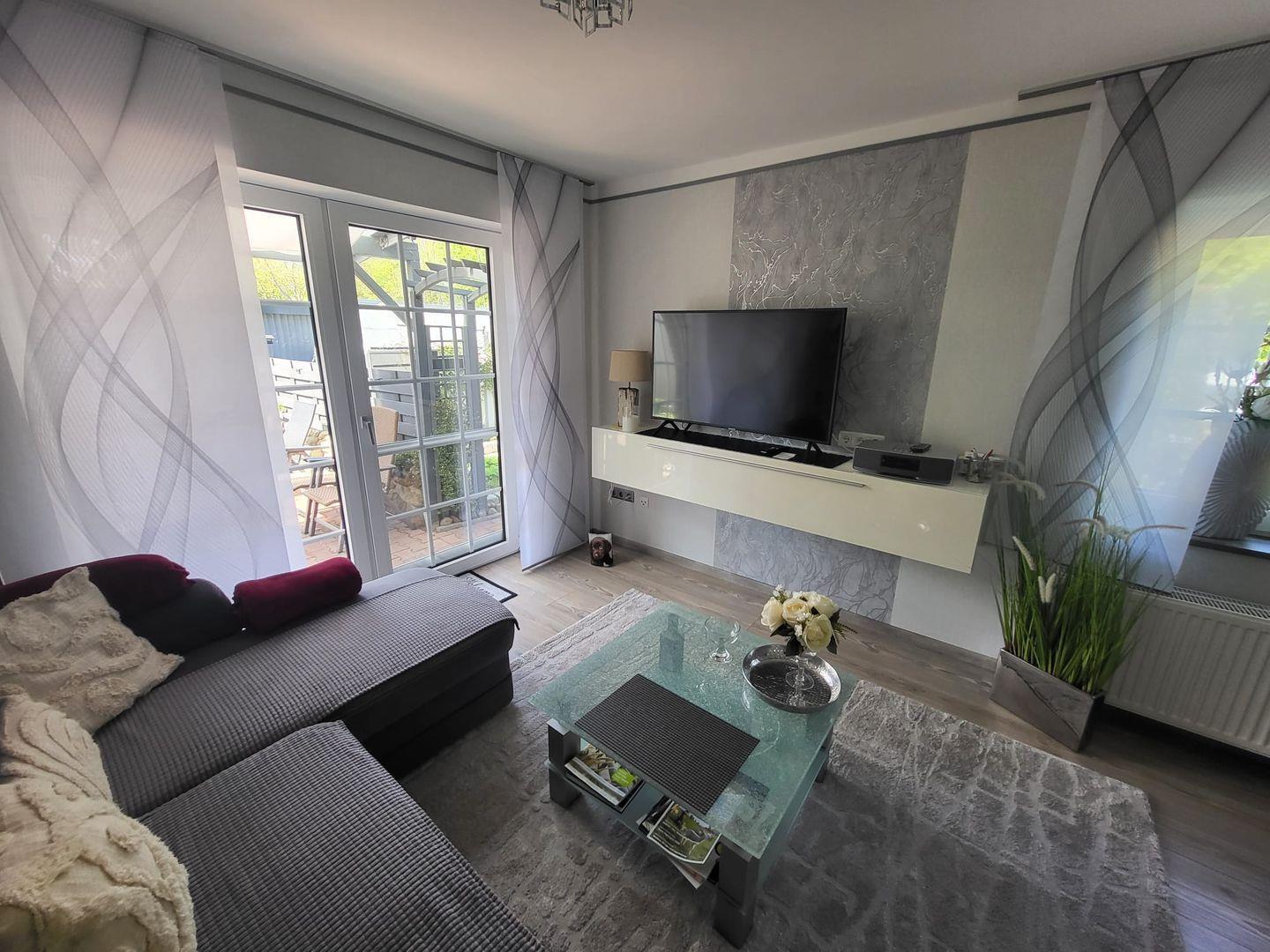 Kommen Sie herein! Vom Flur gelangen Sie in den großzügigen Wohn-/Essbereich. Genießen Sie entspannte Stunden auf dem gemütlichen Sofa mit einem Gläschen Wein und schauen einen schönen Film. Am Esstisch können zubereitete Speisen serviert werden. Die moderne helle Küche ist voll ausgestattet. Hier hat der Hobbykoch seine Freude. Ein Gäste-WC befindet sich ebenfalls im Erdgeschoss. In der oberen Etage erwarten Sie 2 helle Schlafzimmer, eines mit einem Doppelbett und eines mit 2 Einzelbetten. Die Eigentümer vermieten das Objekte nur an max. 2 Gäste! Das Bad ist eine kleine Wellnessoase. Mit heller Ausstattung überzeugt das Bad u. a. mit einer begehbaren großen Dusche und 2 Fenstern.