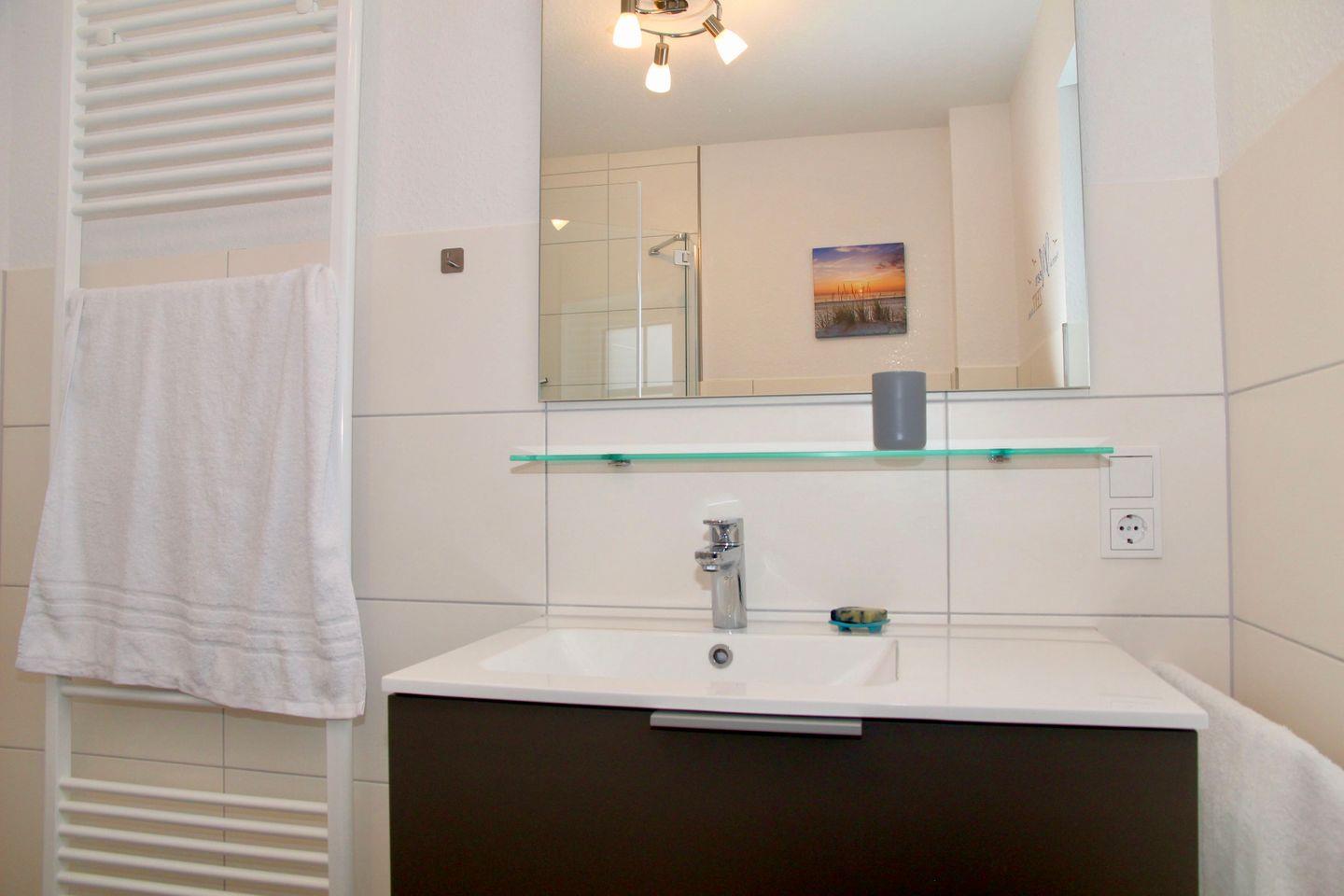 Das große Schlafzimmer ist mit Doppelbett (1,80m x 2 m, einzelne Matratzen), Kleiderschrank, Schreibtisch, Kofferablage und Steamer ausgestattet, Verdunklungsvorhänge sind vorhanden. Das helle Badezimmer verfügt über ebenerdige Dusche, Waschtisch, WC, Föhn und Handtuchheizkörper. Im Abstellraum finden Sie weiterhin Waschmaschine und Wäscheständer.