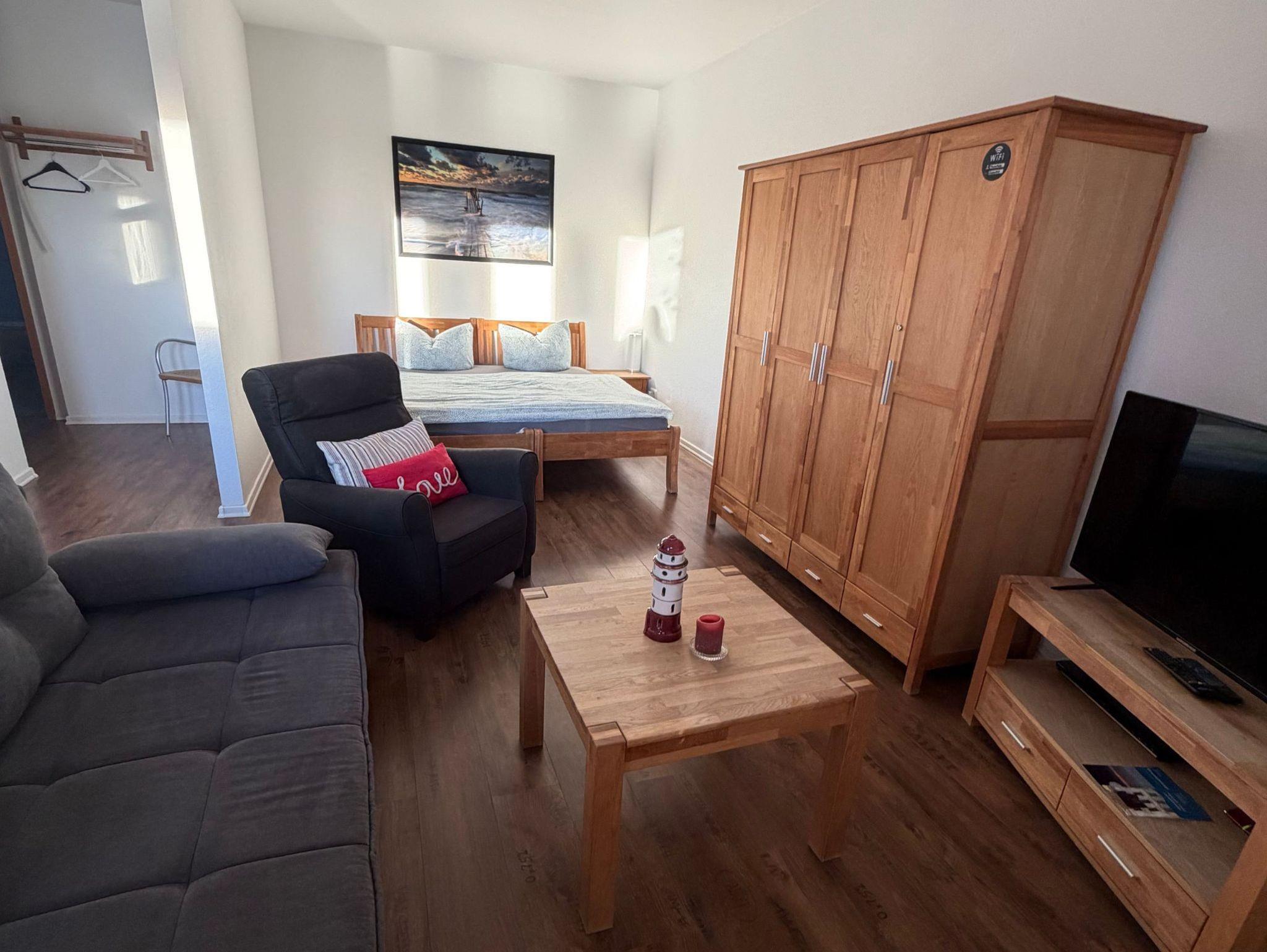 Die Studiowohnung hat eine Terrasse mit Blick aufs Wasser. Im der Wohnküche befindet sich eine neue Schlafcouch (Februar 2025) sowie ein 1,80m Bett, was man auch auseinander stellen kann.
