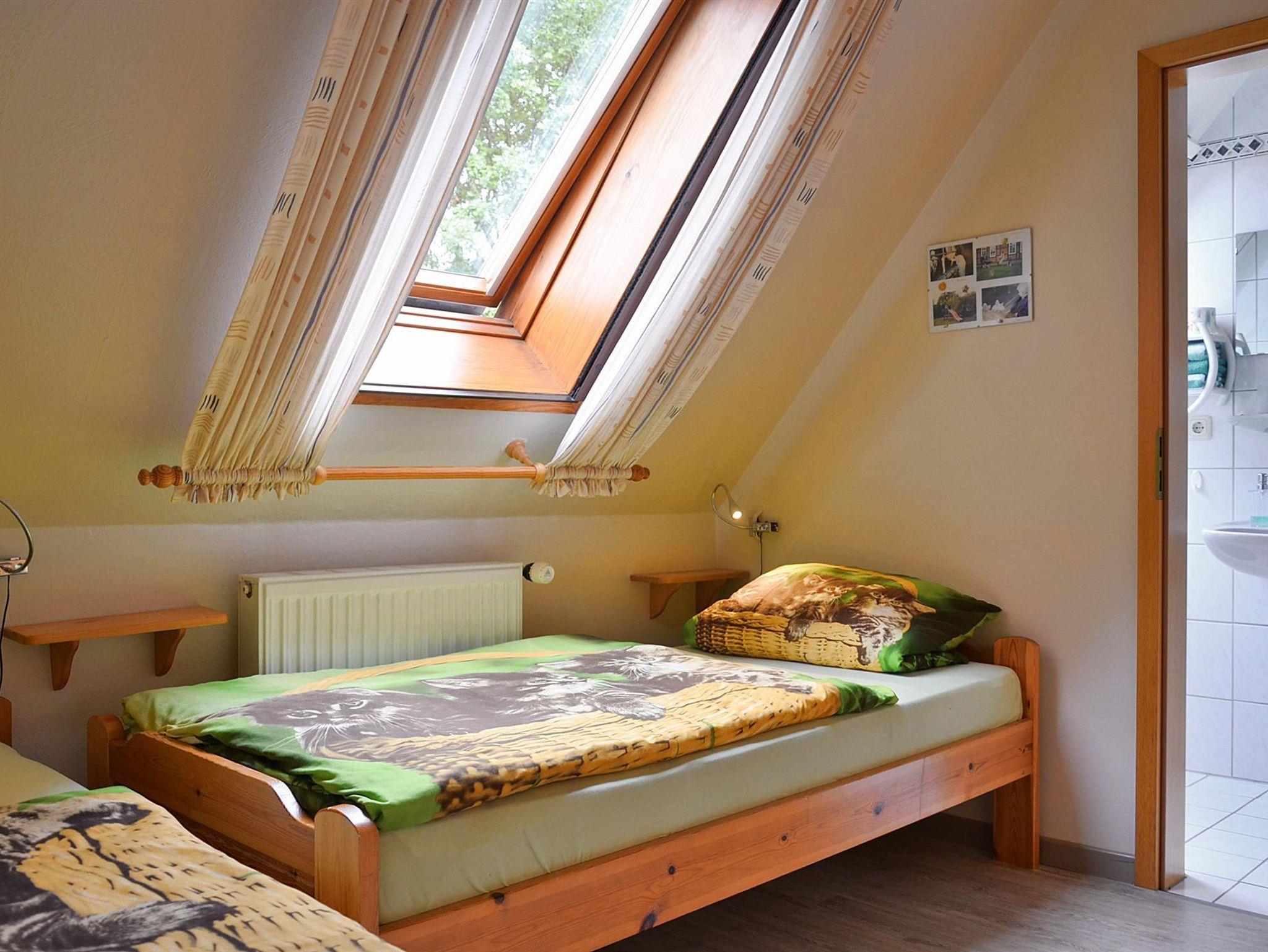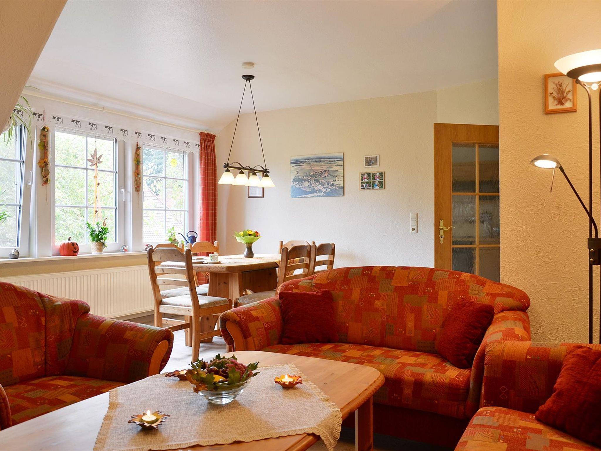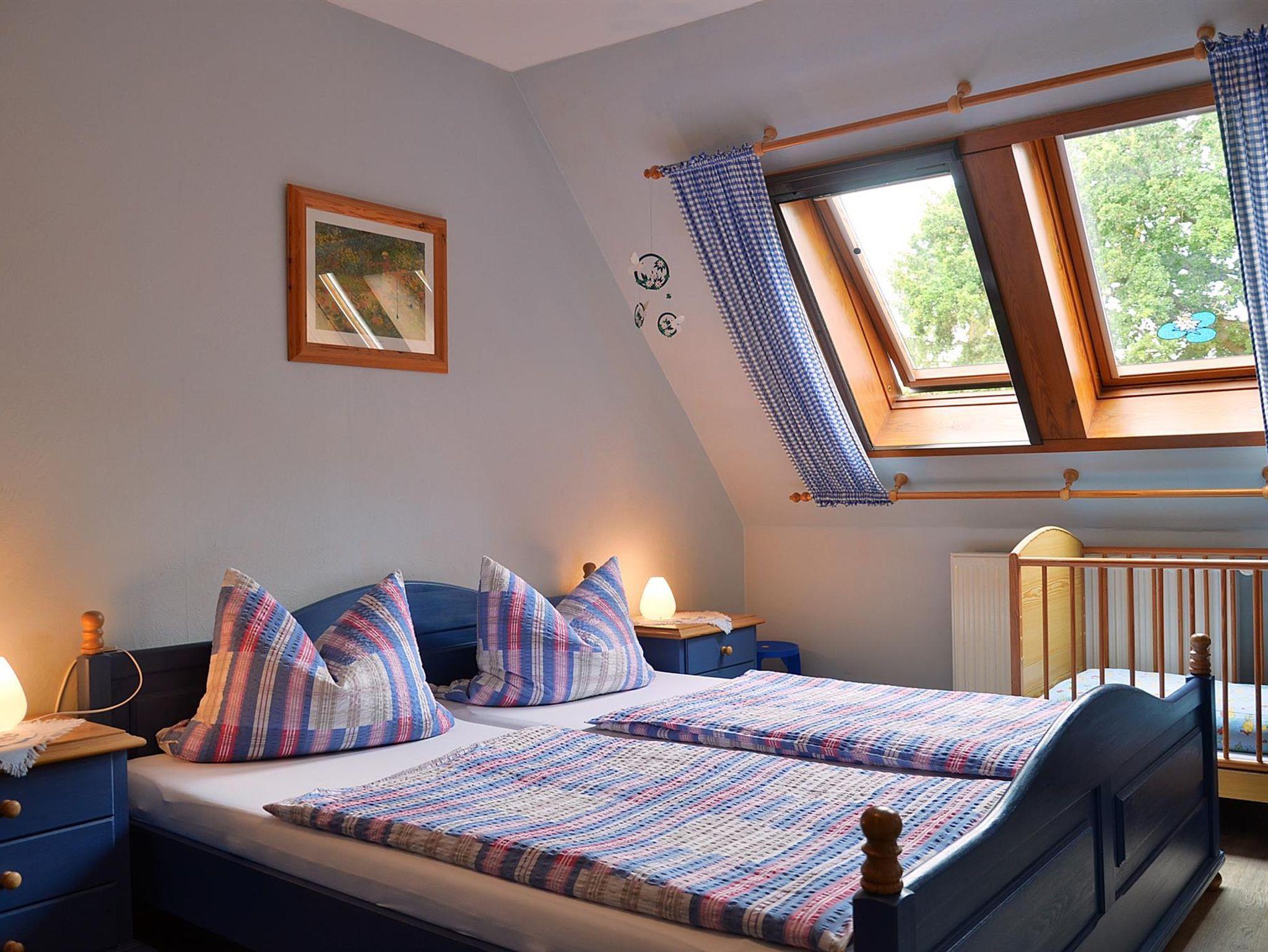 Gemütliche Ferienwohnung für 5 Personen im Obergeschoss (1 Wohnraum mit SAT/TV, Radio und Telefon, 1 kompl. eingerichtete Küche, 2 Schlafzimmer und 2 x DU/WC). Im 2. Schlafzimmer verfügen die Einzelbetten über eine Länge von 1,90 m. Kleinkinderausstattung vorhanden. Der Fußboden der Wohnung ist komplett mit Laminat ausgestattet. Check in: 15:00 Uhr, check out: 10:00 Uhr