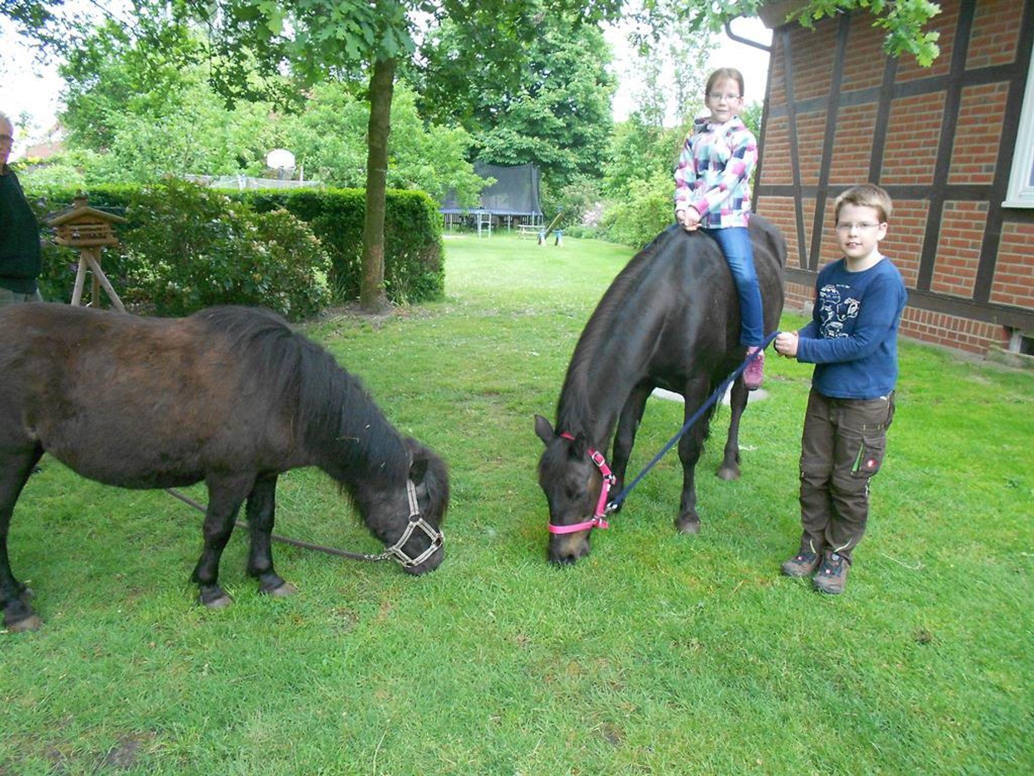 Im großen Garten finden Sie einen Spielplatz, überdachte Sitzecke mit Grill und Lagerfeuerplatz, sowie Liegewiese. Außerdem Tischtennis, Tischfußball und Fahrradverleih. Unser Tierbestand besteht aus, den Ponys Molli und Moppi und dem Jagdhund Ulk. Alle freuen sich auf ein paar Streicheleinheiten von den Gästen.