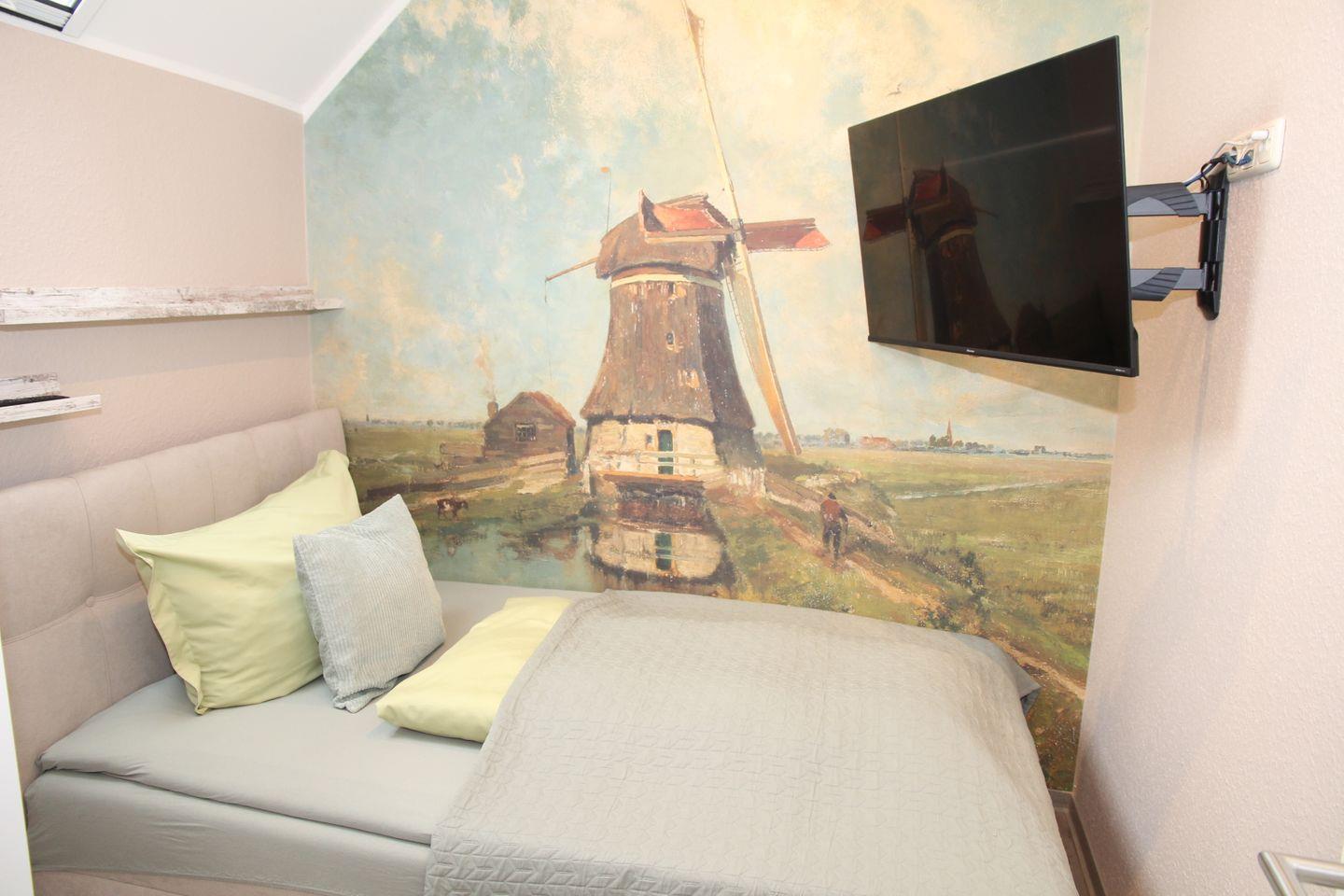 Die Wohnung 5 befindet sich mit ca. 60qm im Obergeschoss und bietet Platz für bis zu 5 Personen. Die Wohnung besteht aus einem Wohn-Essbereich mit gut ausgestatteter Küche (keine Spülmaschine!), Essplatz, sowie einem L-Sofa (Schlafsofa für die 5. Person) mit Fernseher. Angrenzend befindet sich ein neuwertiges Badezimmer mit flacher Dusche, Waschbecken und Toilette. Im angrenzenden Abstellraum befindet sich eine Waschmaschine. Auf dieser Etage befinden sich ebenfalls zwei Schlafzimmer, jeweils mit 1,20 m breitem Einzelbett und Kleiderschrank eingerichtet. Das dritte Schlafzimmer mit 1,60 m breitem Doppelbett befindet sich im ausgebauten Dachboden (steilere Treppe). Alle Fenster sind mit Fliegengittern versehen.