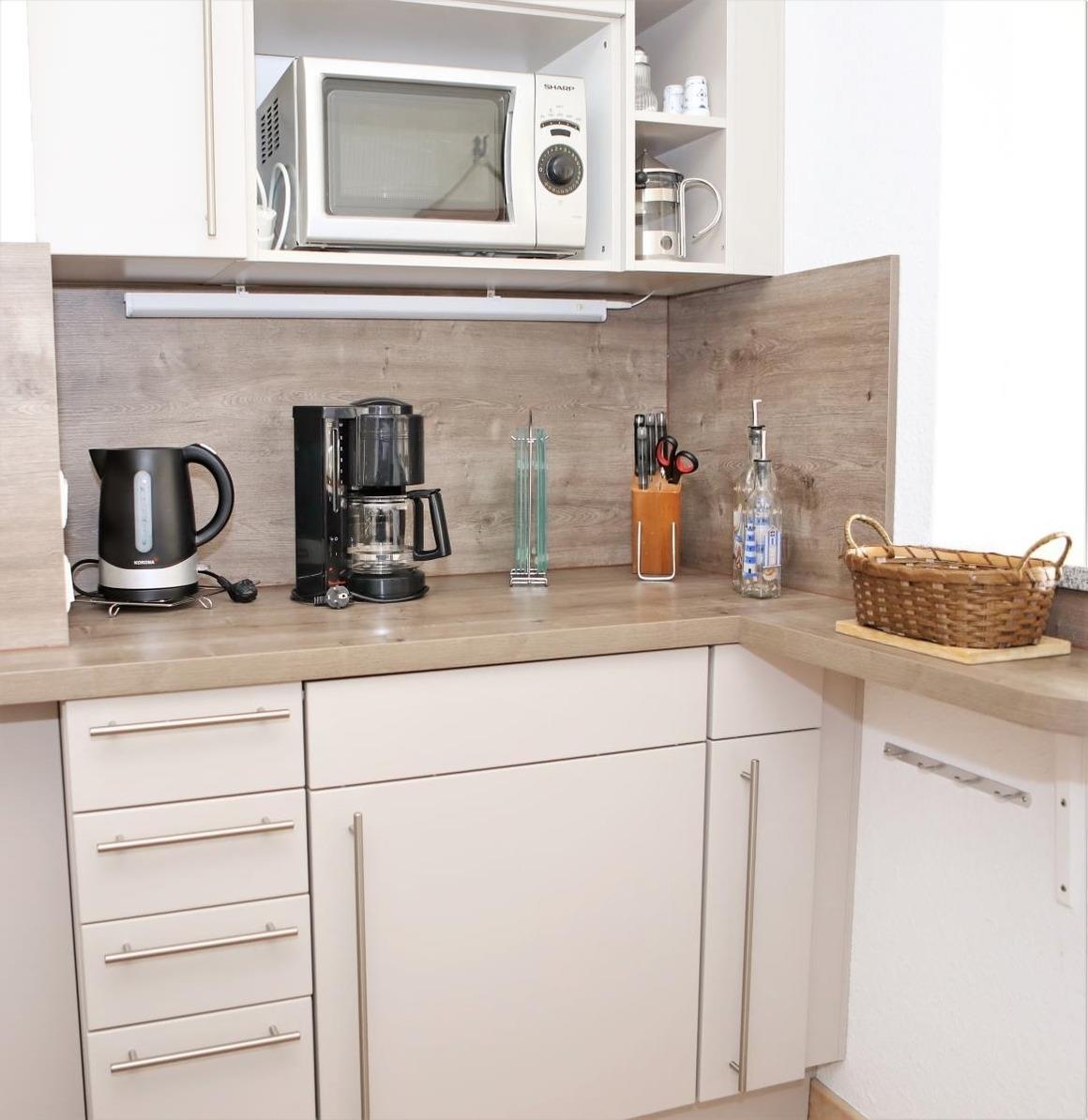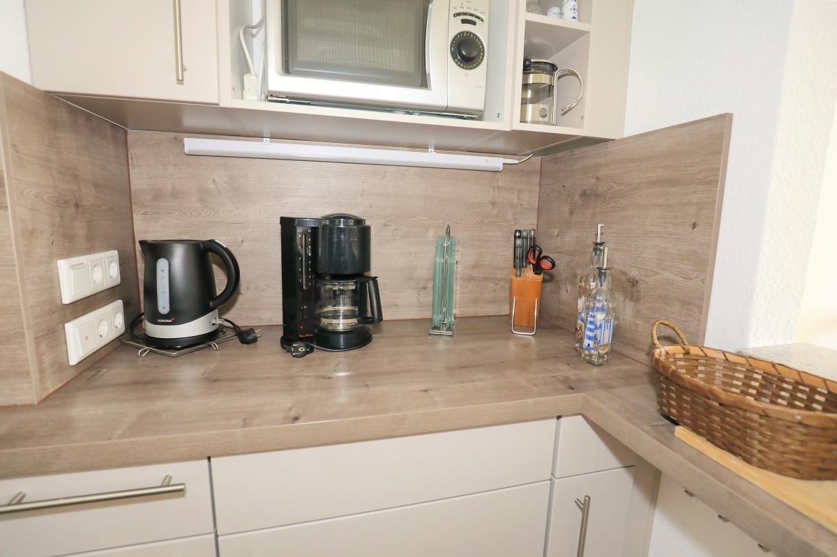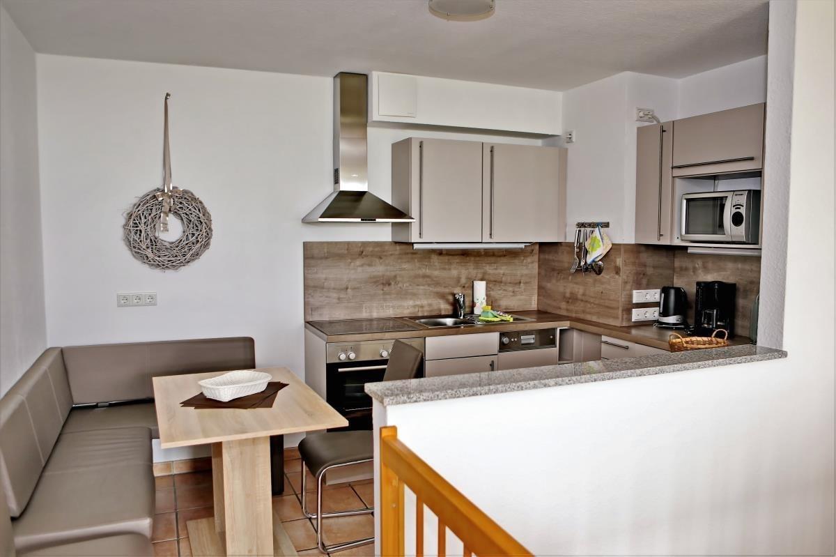 Die offene Küche ist voll ausgestattet mit Kühlschrank, Mikrowelle, Herd, Backofen und Geschirrspüler.