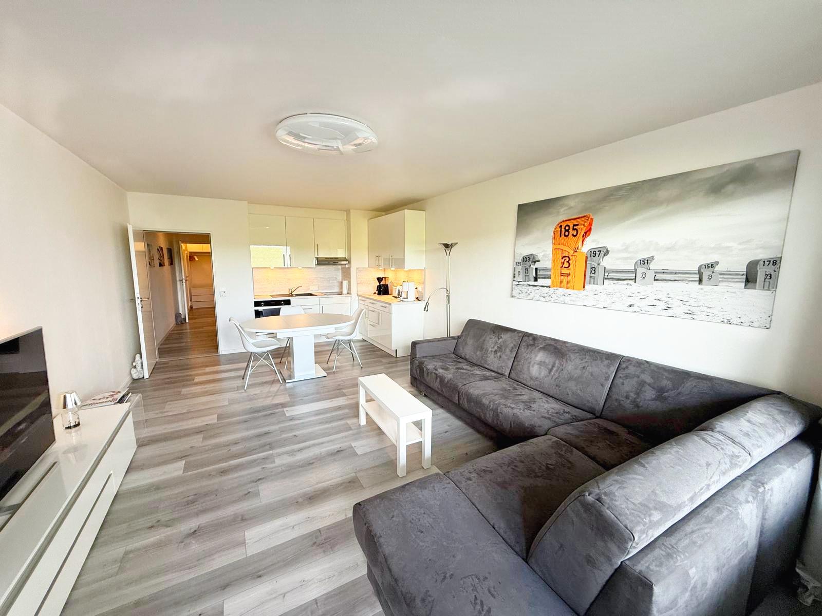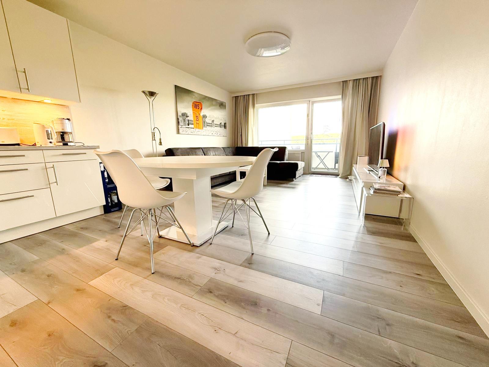 Im Apartment erwartet Sie ein heller Wohnbereich mit integrierter Küchenzeile, der der perfekte Ort ist, um sich nach einem erlebnisreichen Tag zu entspannen. Ob gemeinsames Kochen oder ein gemütlicher Abend – hier können Sie den Urlaub in Ruhe ausklingen lassen. Bitte beachten Sie, dass keine Spülmaschine vorhanden ist.