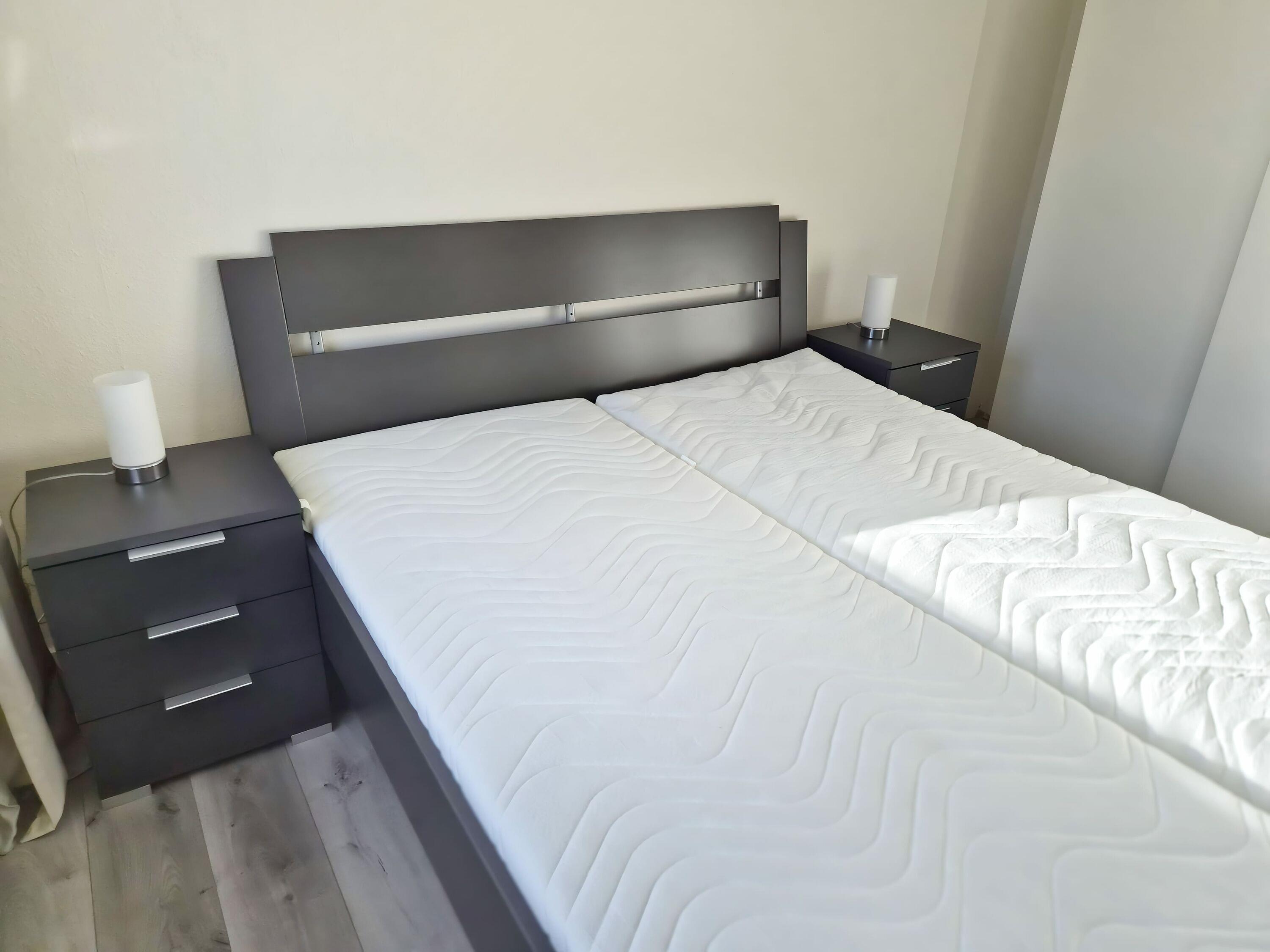 Das separate Schlafzimmer sorgt für erholsame Nächte und ist mit einem Doppelbett (180 x 200 cm) mit getrennten Matratzen, zwei geräumigen Kleiderschränken mit Hänge- und Ablageflächen sowie einer ruhigen Atmosphäre ohne TV ausgestattet. Hier können Sie zur Ruhe kommen und entspannen.