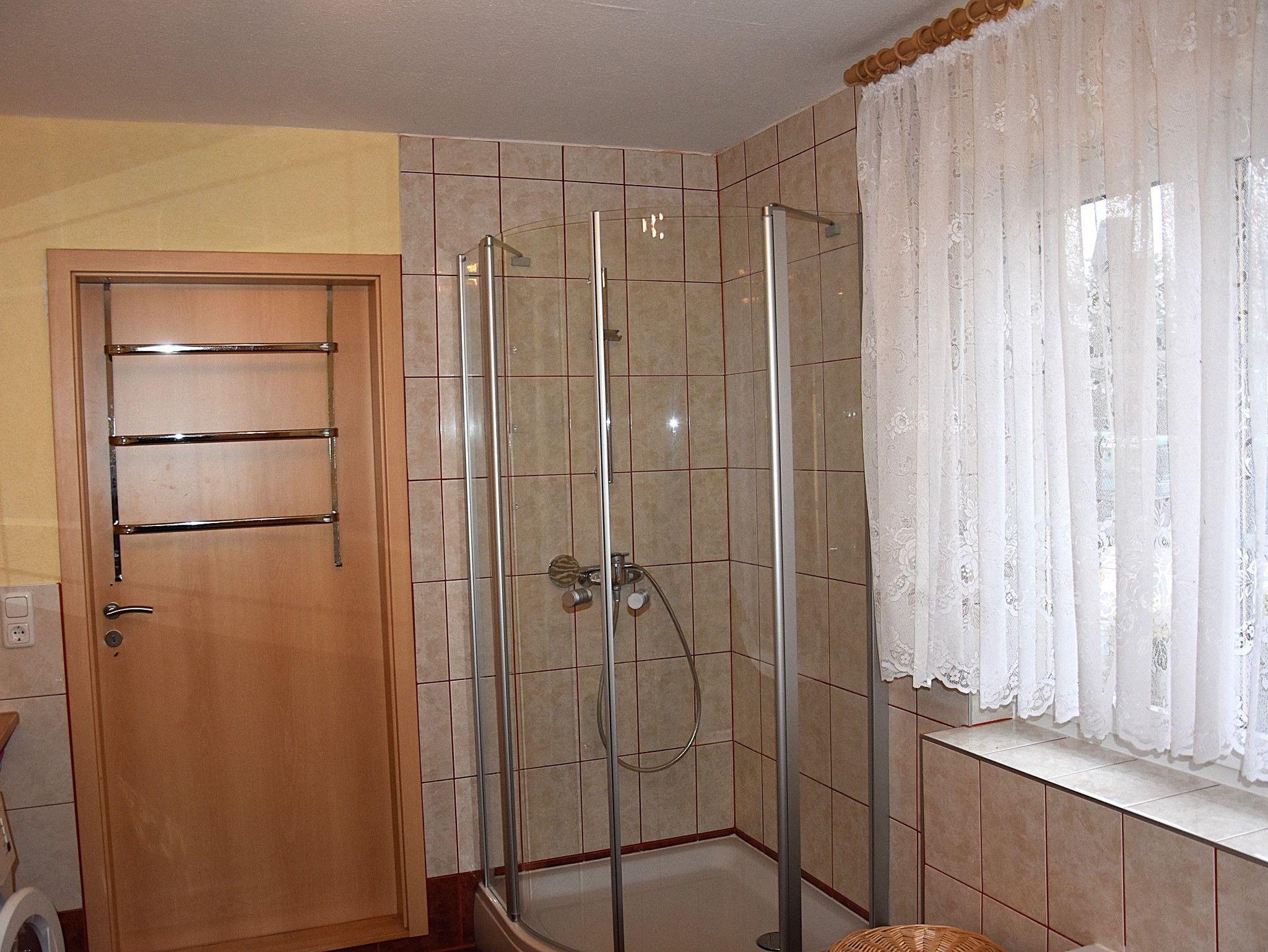 Das Badezimmer ist mit WC, Dusche und Badewanne ausgestattet und ist ein Durchgangszimmer zum zweiten Schlafzimmer.