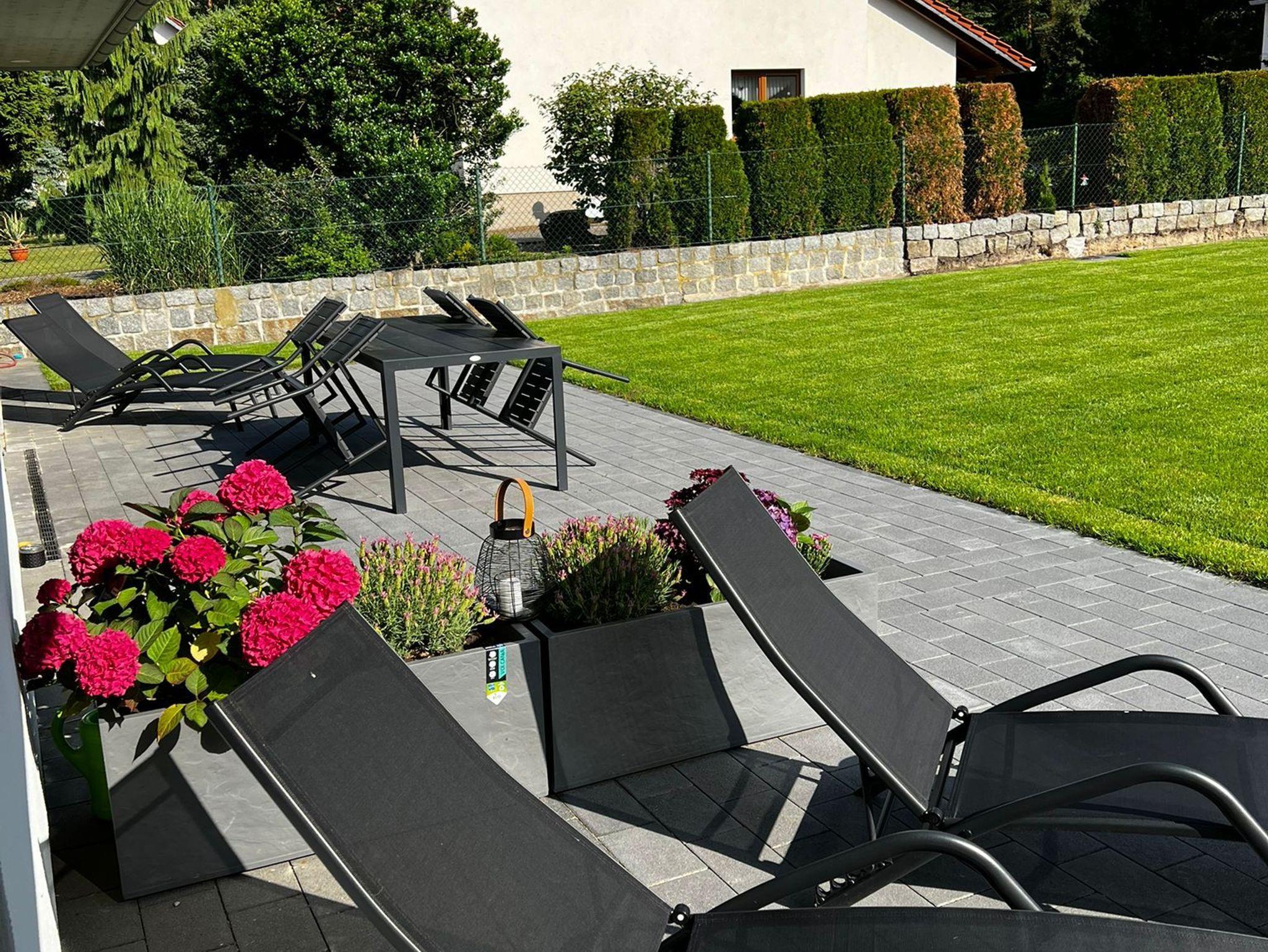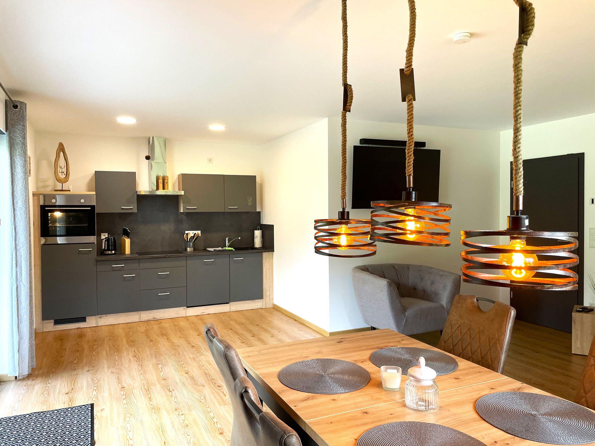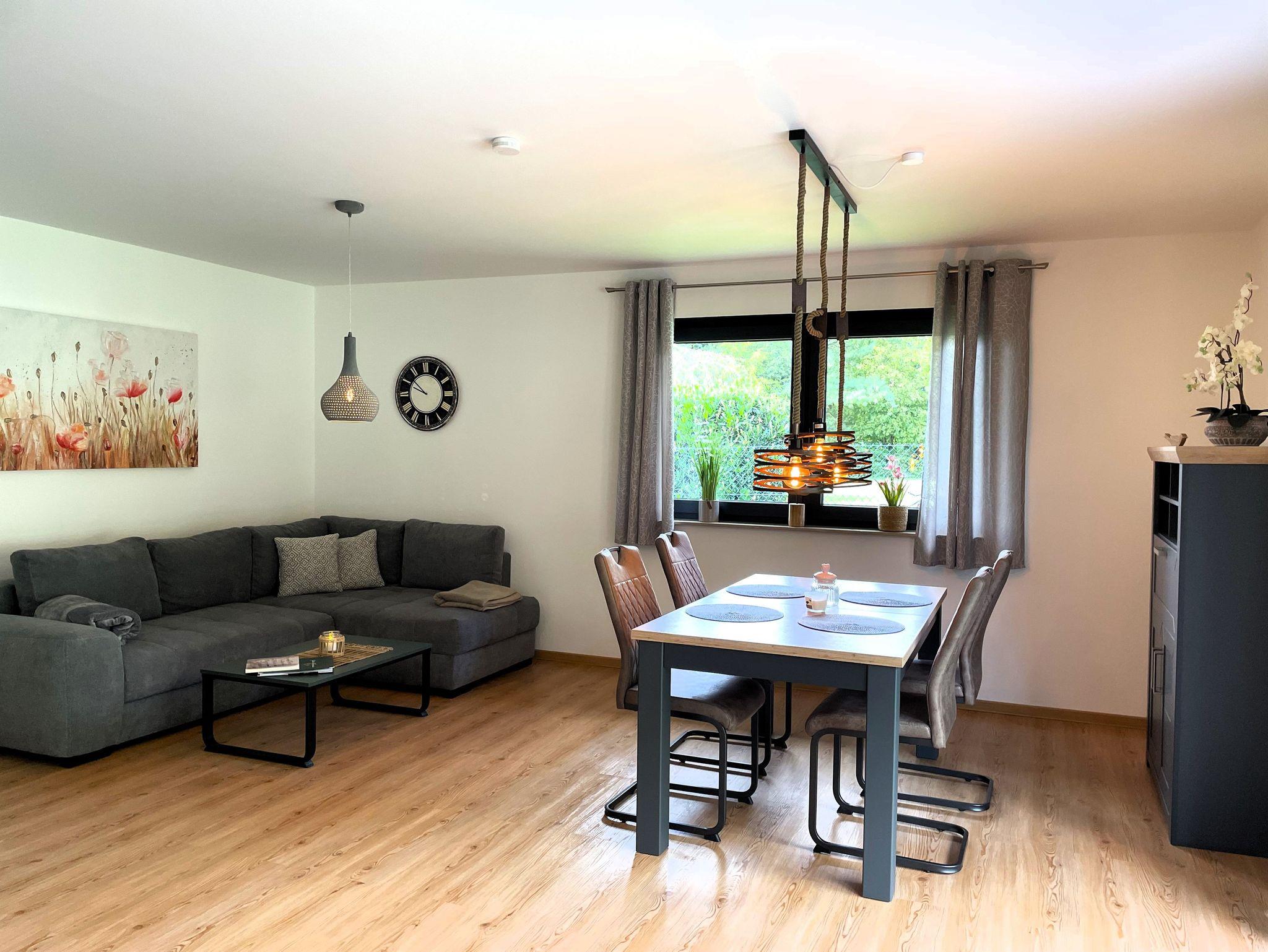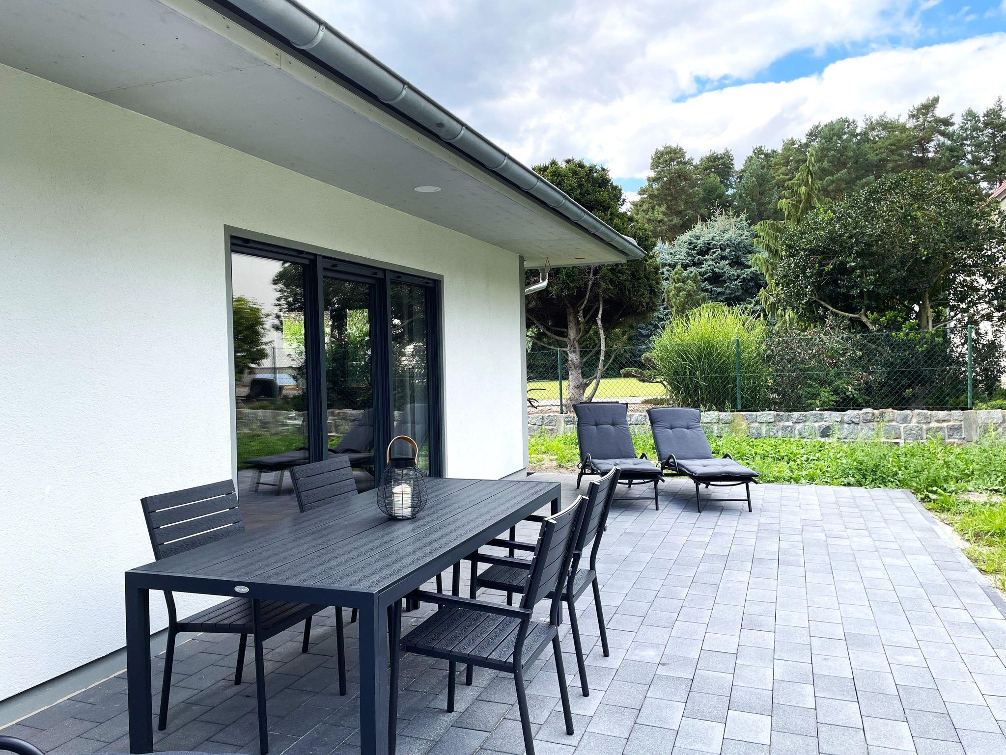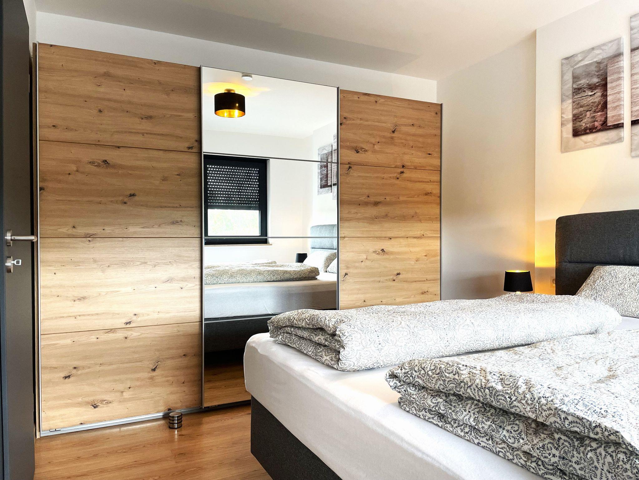 Die Ferienwohnung ist ebenerdig begehbar und verfügt über eine zeitgemäße, moderne Einrichtung. Der Wohnbereich ist mit einem Ecksofa ausgestattet und dient als Aufbettung für 1 Person. Ein großer Smart-TV sorgt für Unterhaltung. Weiterhin befindet sich hier eine offene Küche, die über einen Kühlschrank mit Gefriermöglichkeit, Backofen, Geschirrspüler, Kaffeezubereiter, Wasserkocher und weiteren Annehmlichkeiten verfügt. Direkt aus dem Wohnbereich betritt man eine große möblierte Terrasse, die zum gemeinsamen Essen, Spielen und Erholen einlädt. Das Schlafzimmer ist mit einem Boxspringbett sowie einem großen Kleiderschrank eingerichtet.