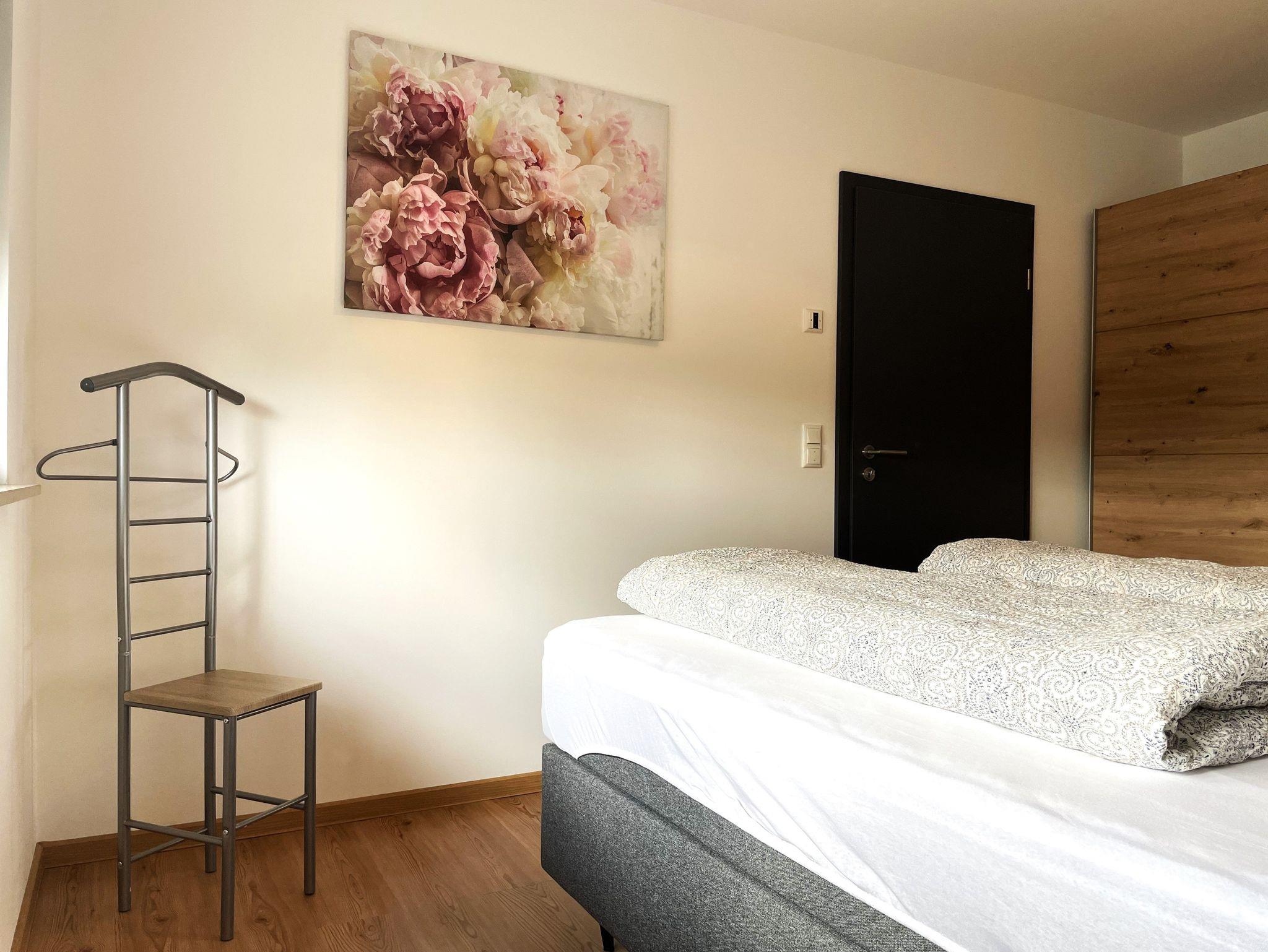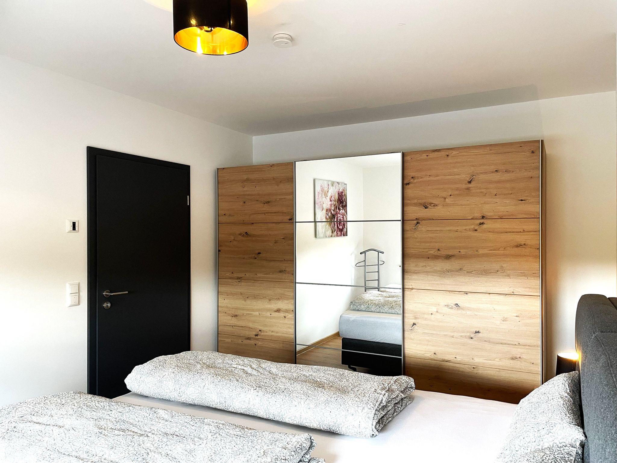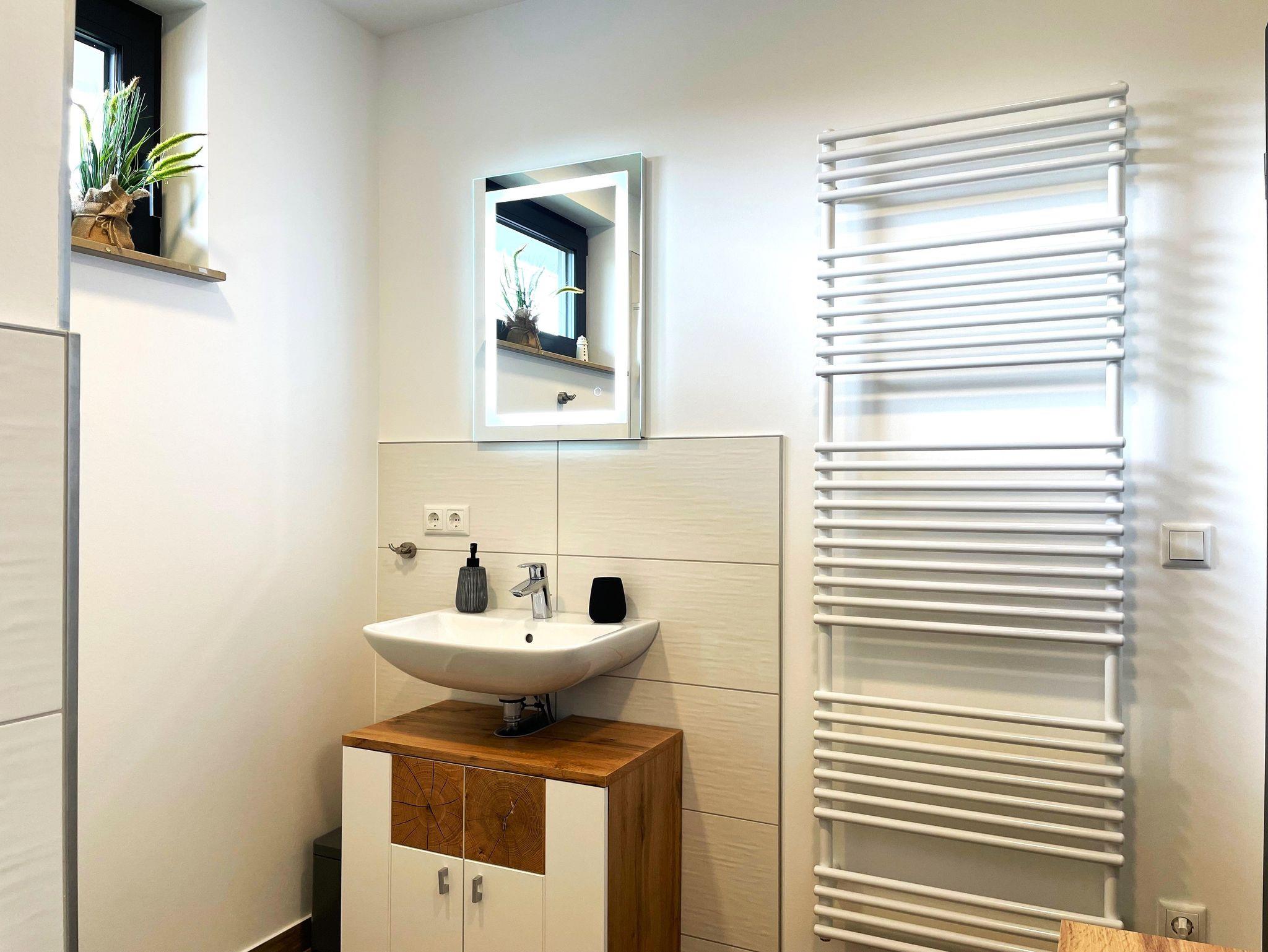 Im Bad finden Gäste eine ebenerdige Dusche, Waschbecken mit Spiegel, einen Handtuchheizkörper, Haartrockner und WC vor.