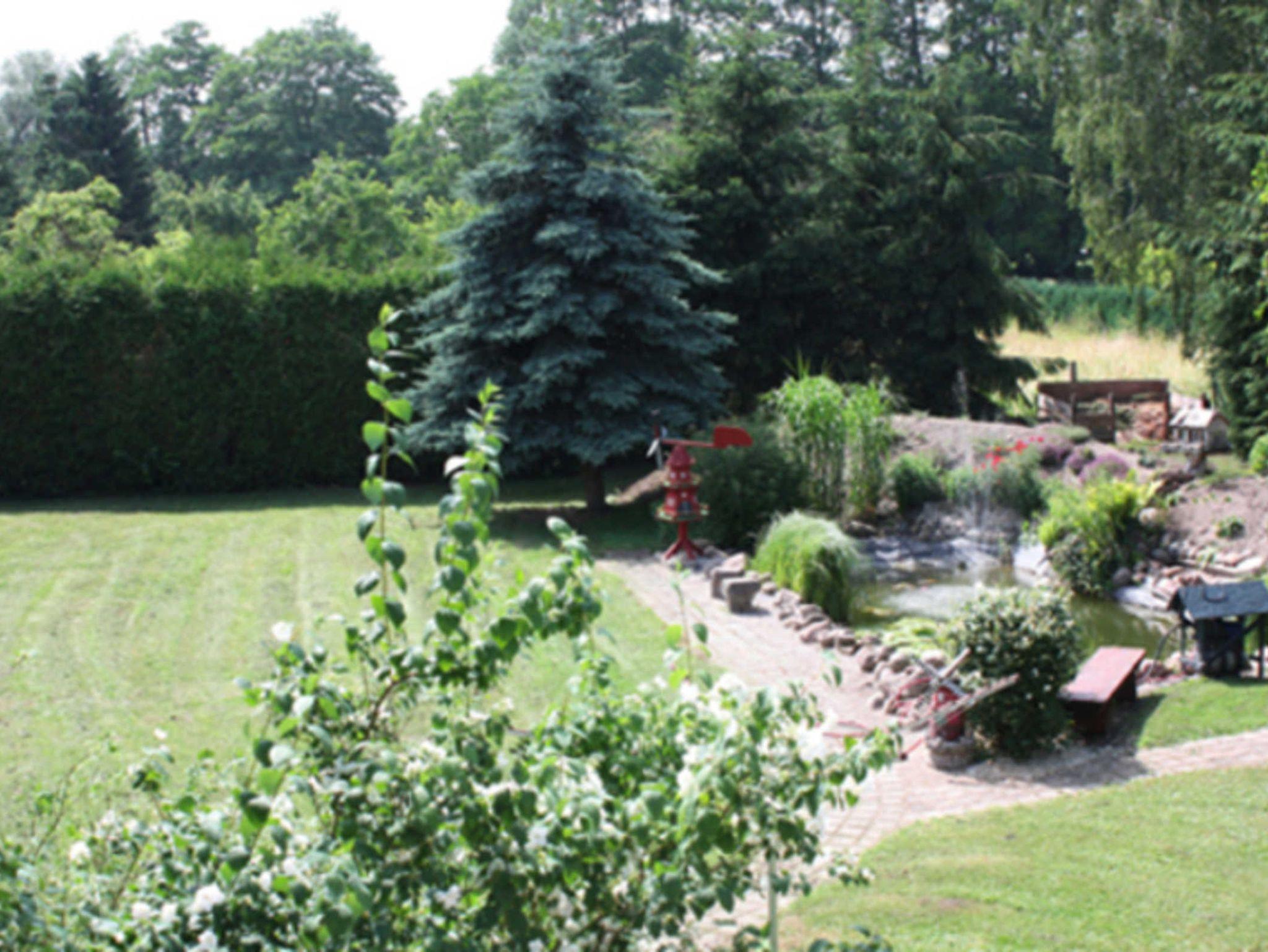 Die Ferienwohnung hat einen separaten Eingang ( ca 78 m²groß ). Die Terrasse mit Blick in den Garten ist komplett überdacht .Man schaut direkt in den Garten mit angelegtem Teich.