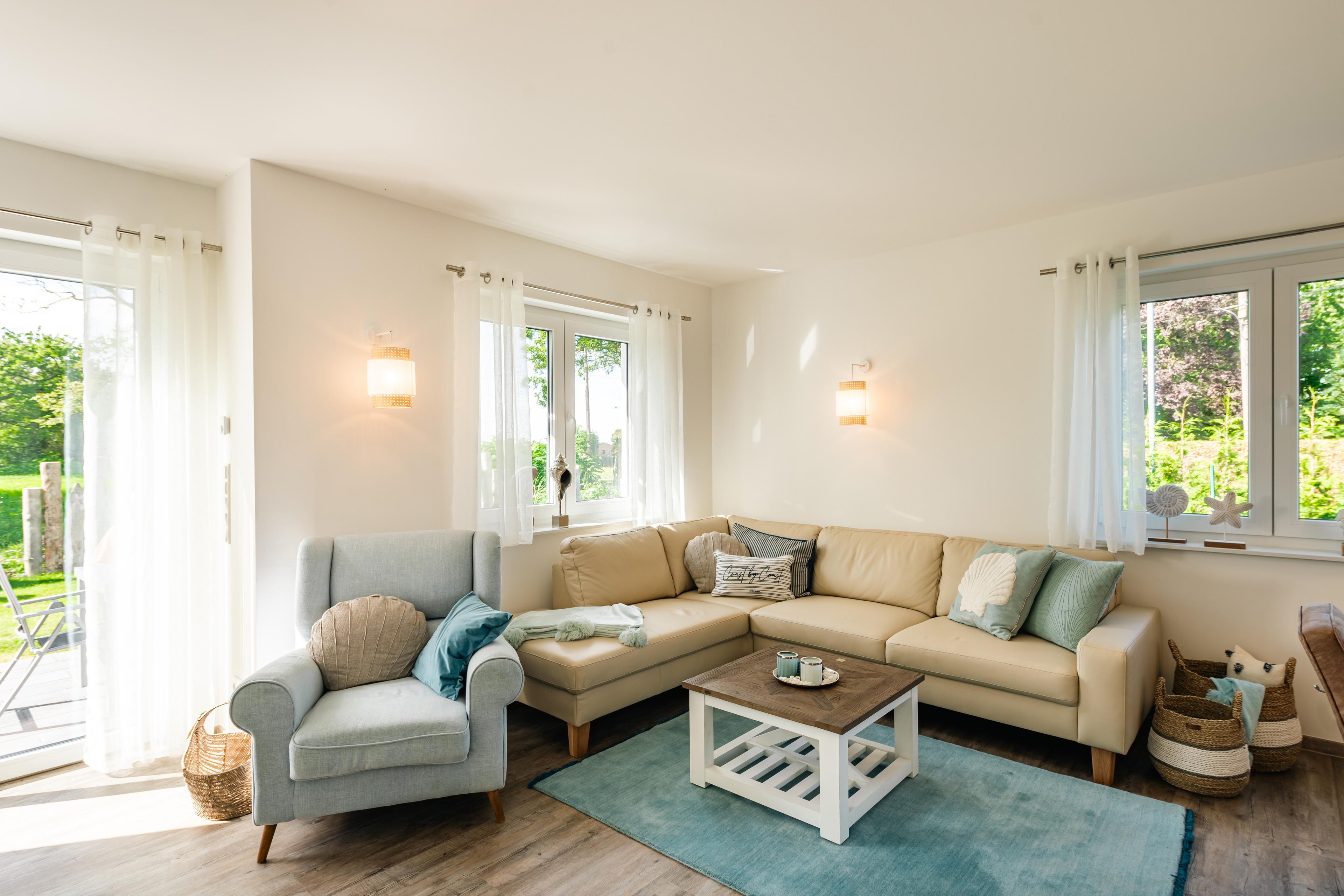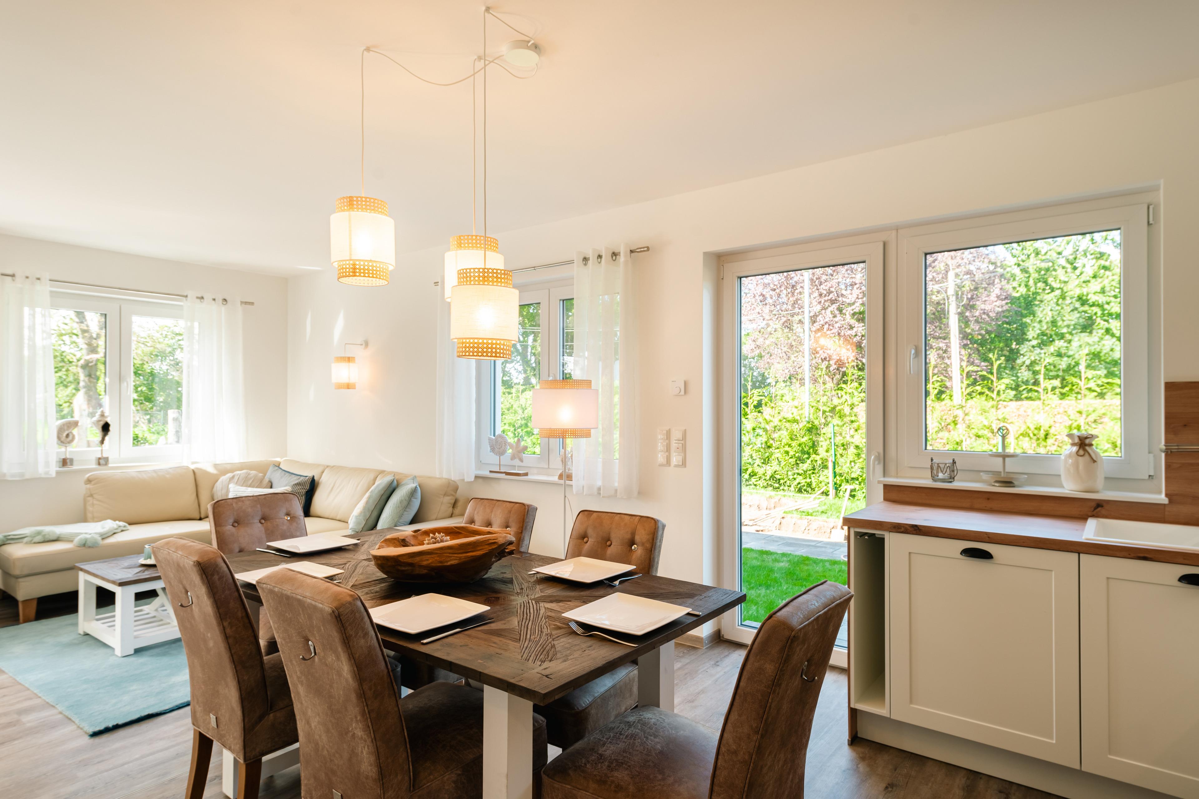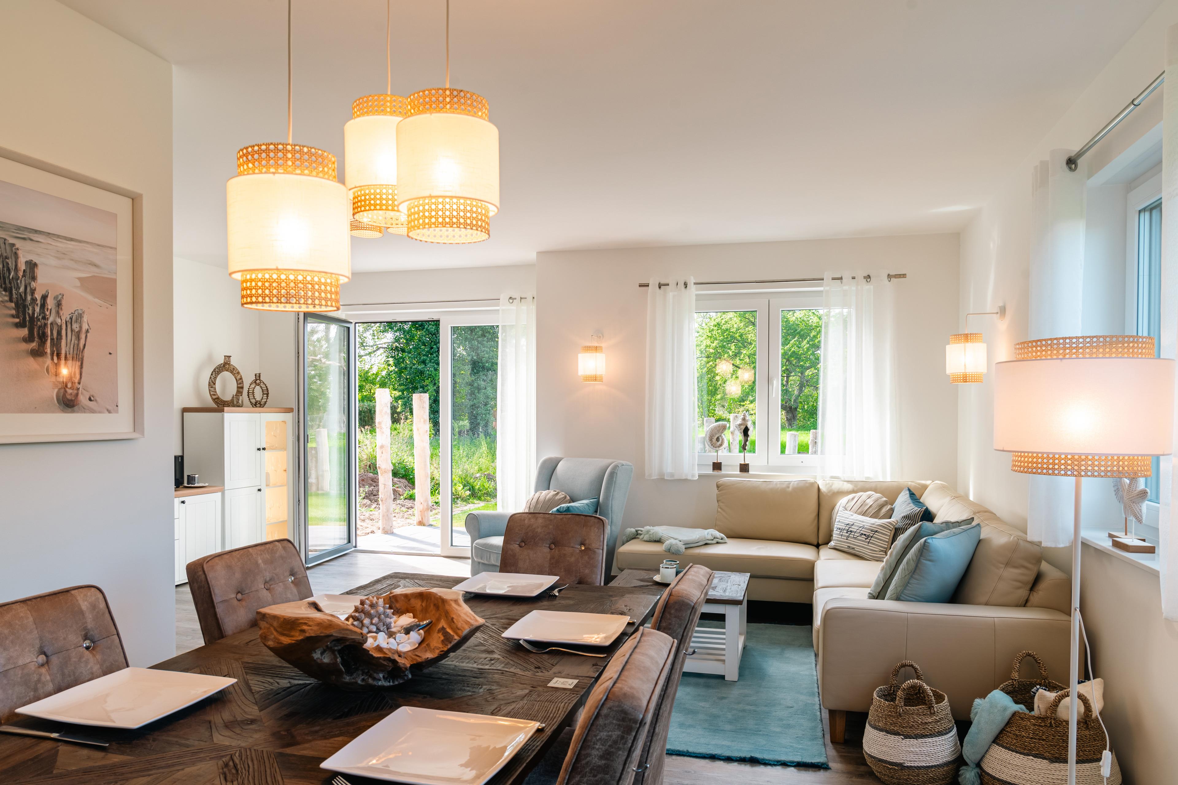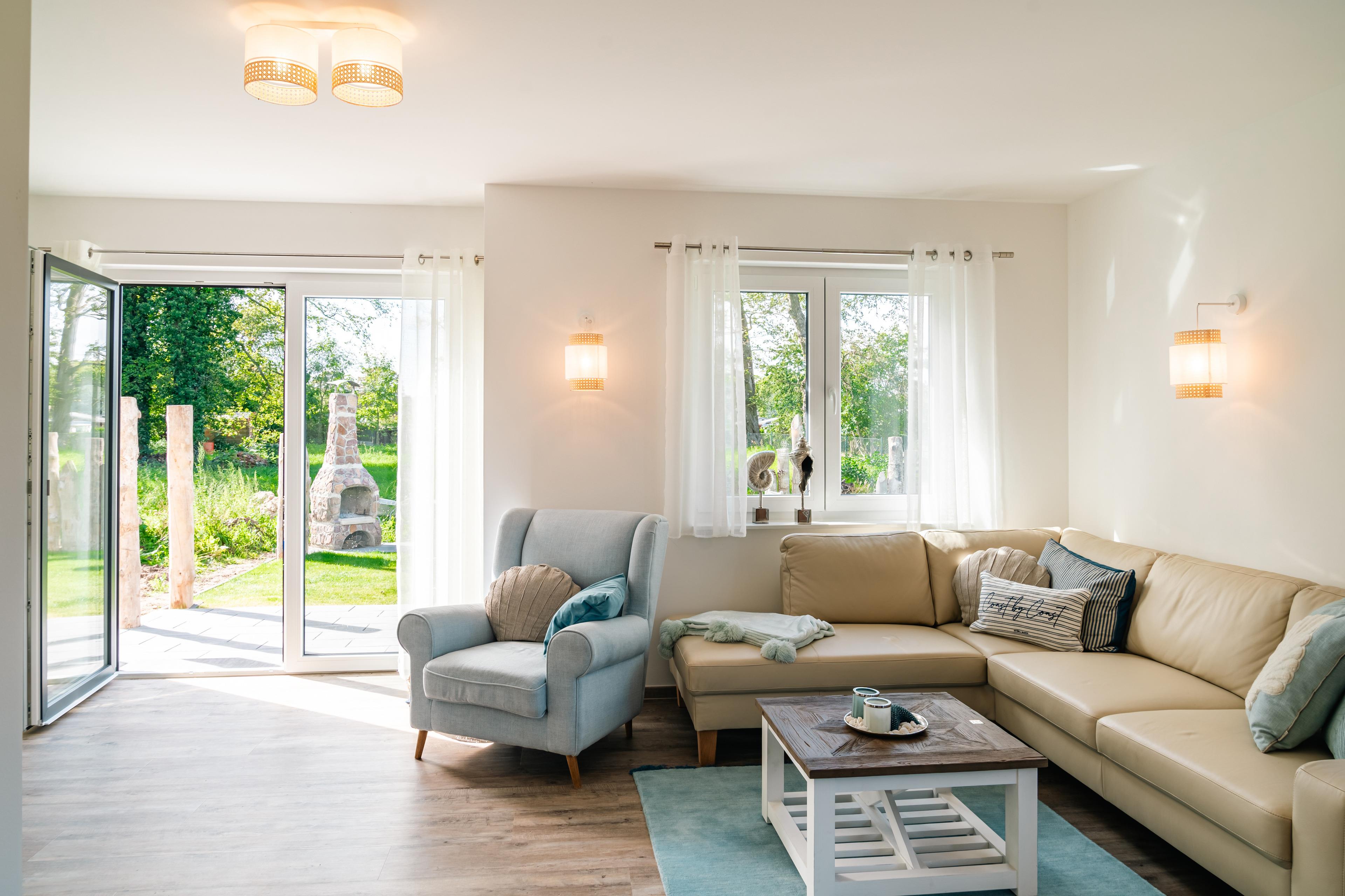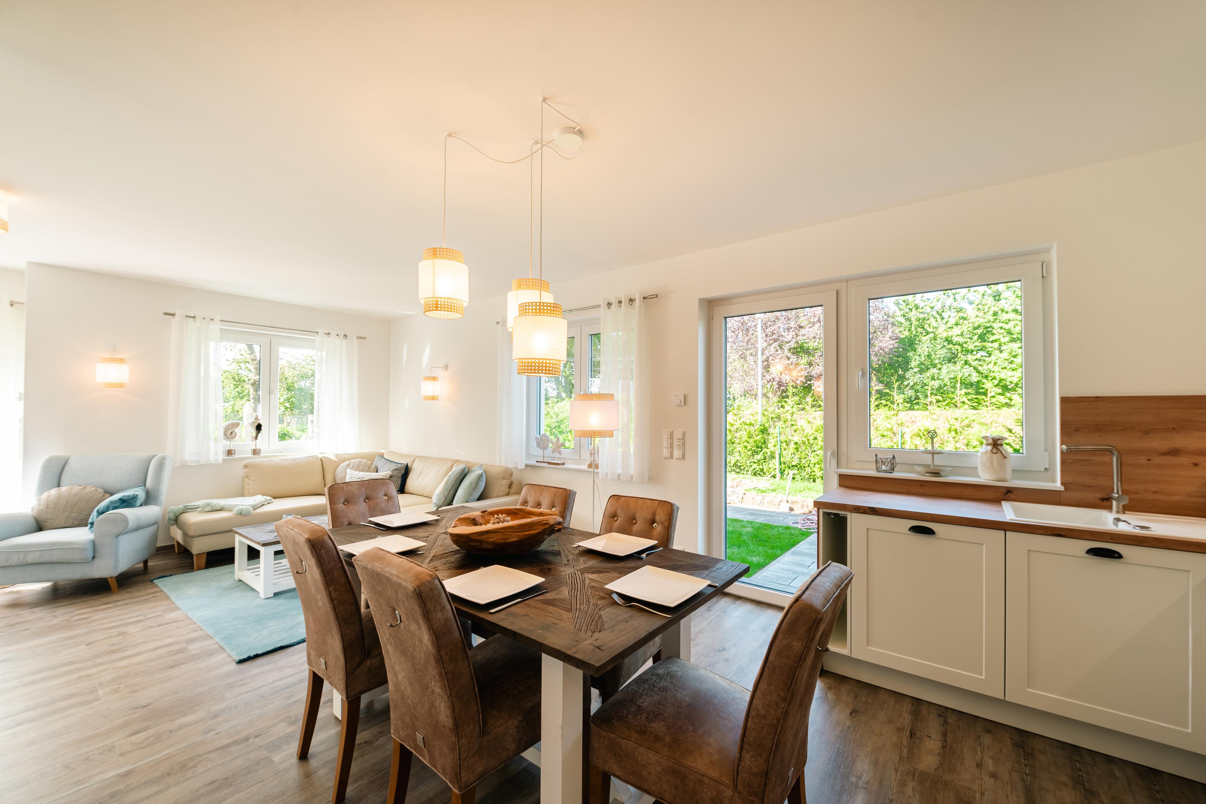 2022/23 neu gebaute zweietagige Doppelhaushälfte (andere Hälfte noch im Bau, derzeit keine Bautätigkeit, Fertigstellung voraussichtlich Frühjahr 2024) für bis zu 6 Personen. Nichtraucherhaus. Das Ferienhaus „Inselblick“ verfügt über eine gehobene Ausstattung mit gemütlicher Einrichtung im modernen maritimen Landhausstil. Es gibt unter anderem 3 Schlafzimmer mit Blick auf den Bodden, Fußbodenheizung und einen Kaminofen. Ein Fenster in jedem Raum der oberen Etage ist mit Insektenschutzgittern ausgestattet, außerdem Insektenschutztür im Terrassenbereich im Wohnzimmer. Für ein gemütliches Beisammensein gibt es im Garten eine Sauna, Liegewiese, möblierte Terrasse und einen Holkohle- Kamin- Grill. 3 PKW- Stellplätze am Haus, Urlaub mit Baby und Kindern möglich, kleiner Hund auf Anfrage, Grundstück nicht eingezäunt.
