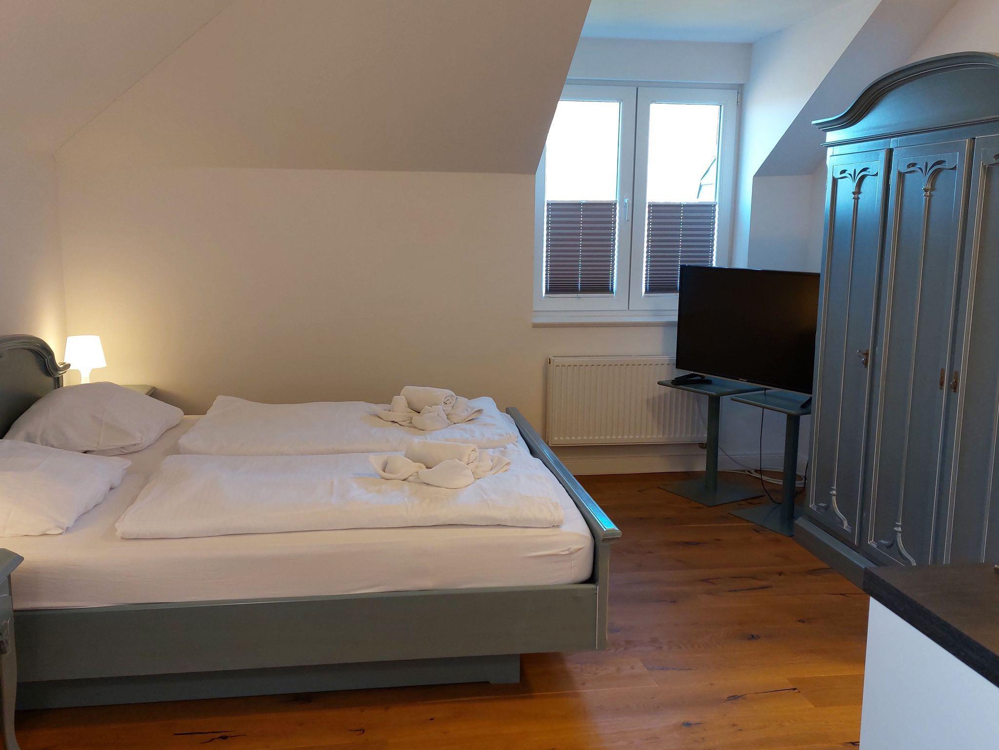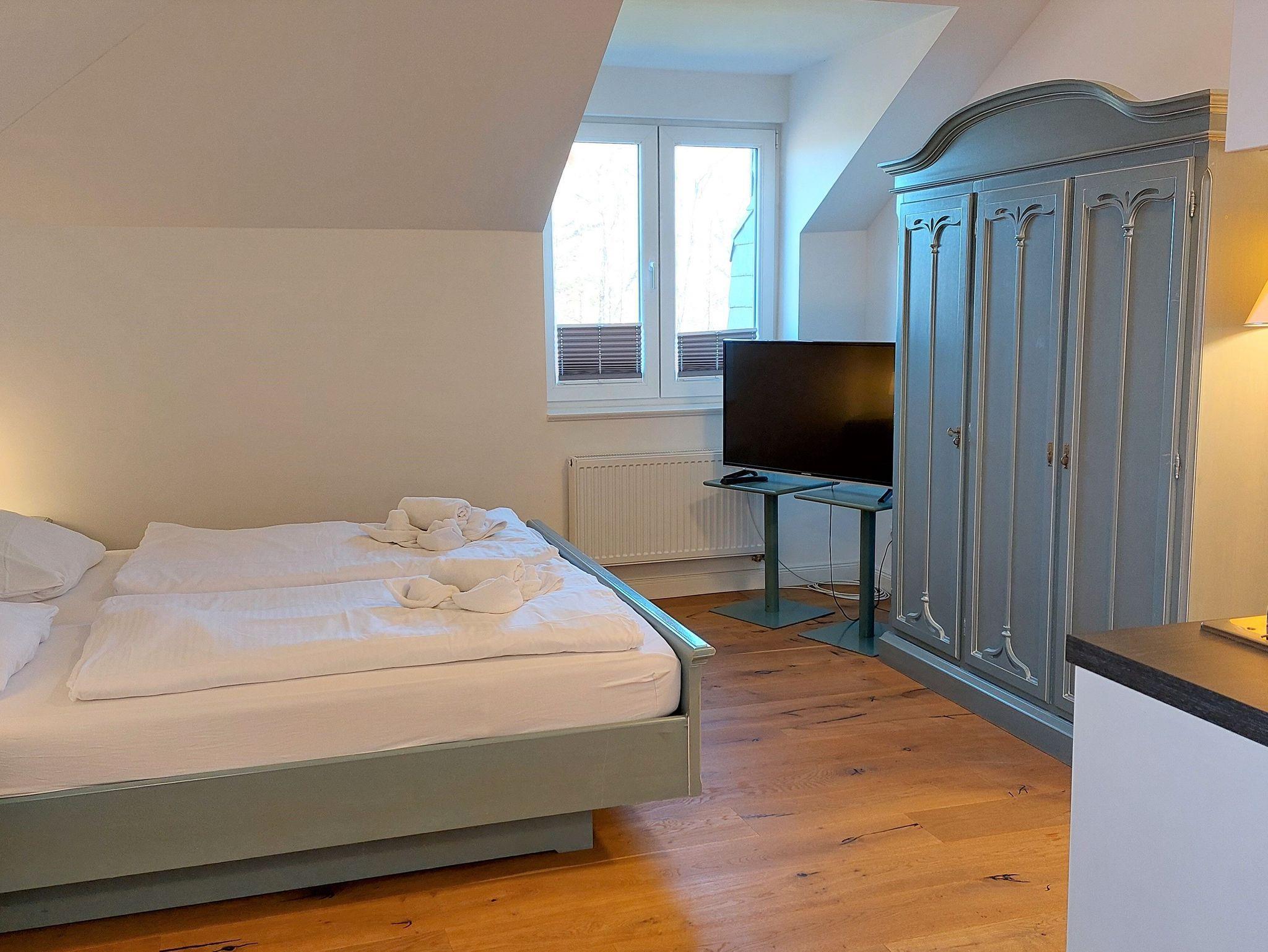 Die Schloss Studios liegen im 1. Stock oder im Dachgeschoss mit Blick in den vorderen oder hinteren Park. Alle Apartments sind mit dem Aufzug zu erreichen. Sie sind modern-minimal oder klassisch ausgestattet und verfügen über eine moderne Küche mit Nespresso Kapselkaffeemaschine und weiteren Küchenutensilien ..