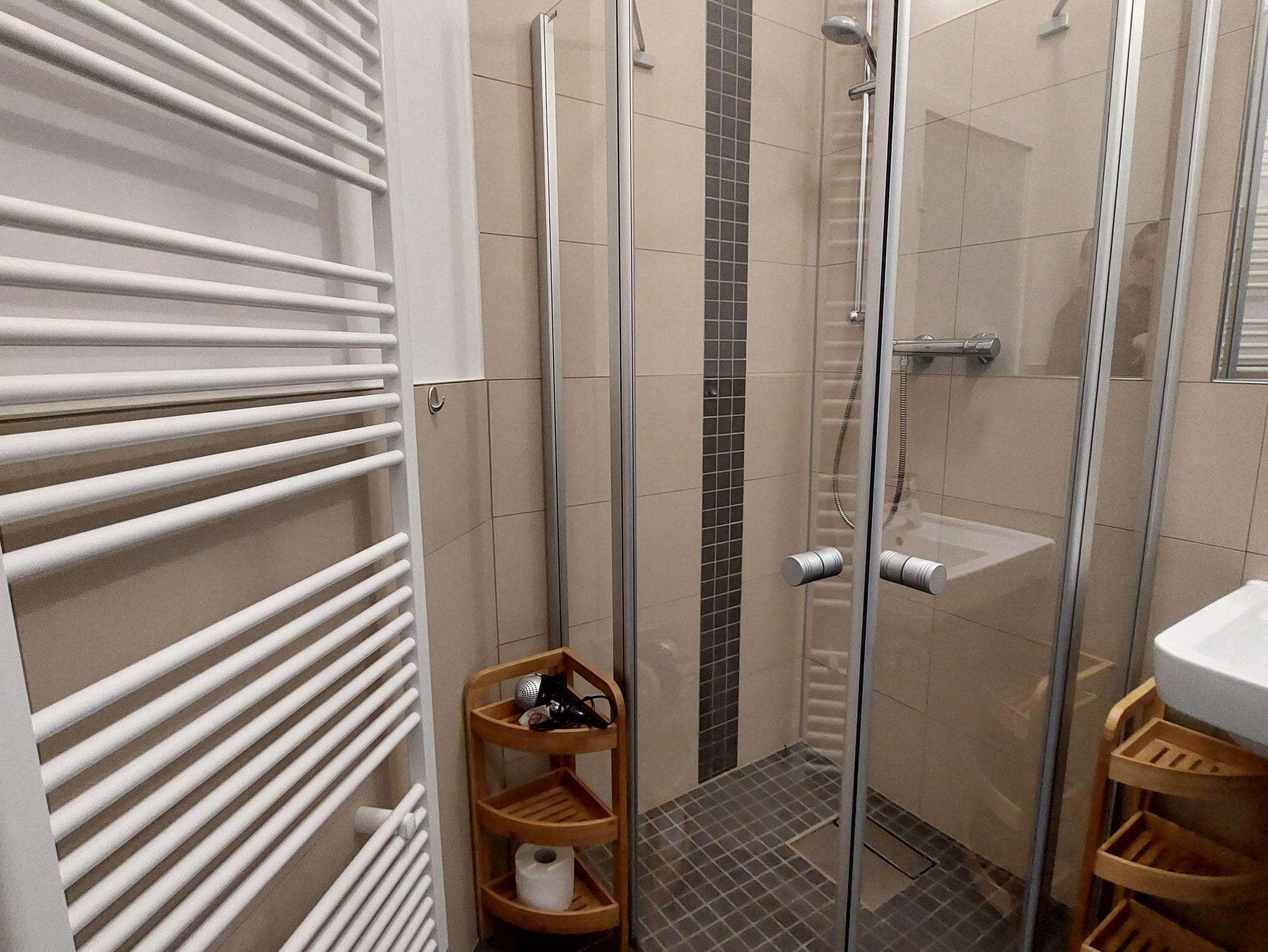 ist vom Vorflur aus durch eine Glastür erreichbar. Ein kleines Bad mit Dusche befindet sich neben der