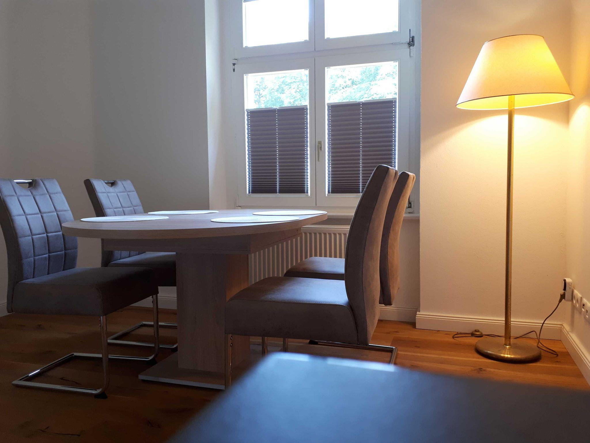 Turmzimmer befindet sich das kleine Wohnzimmer mit Schlafcouch (1,60 Meter breit) für die 3. und 4. Person. Das Turmzimmer verfügt über bodentiefe Fenster und hat Zugang zu der wohnungseigenen Terrasse.