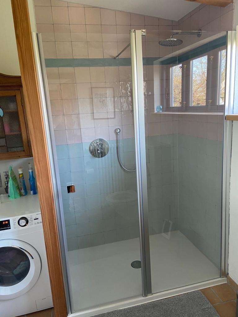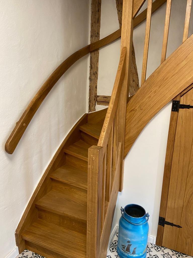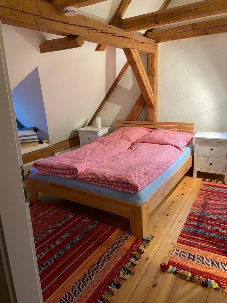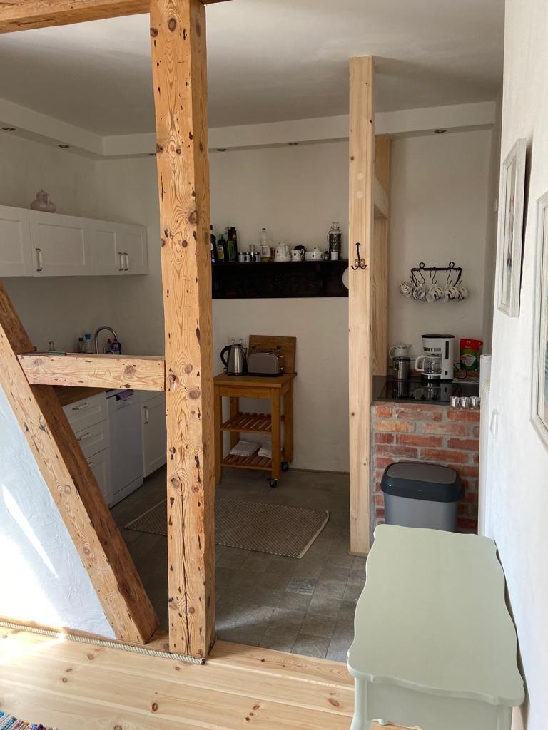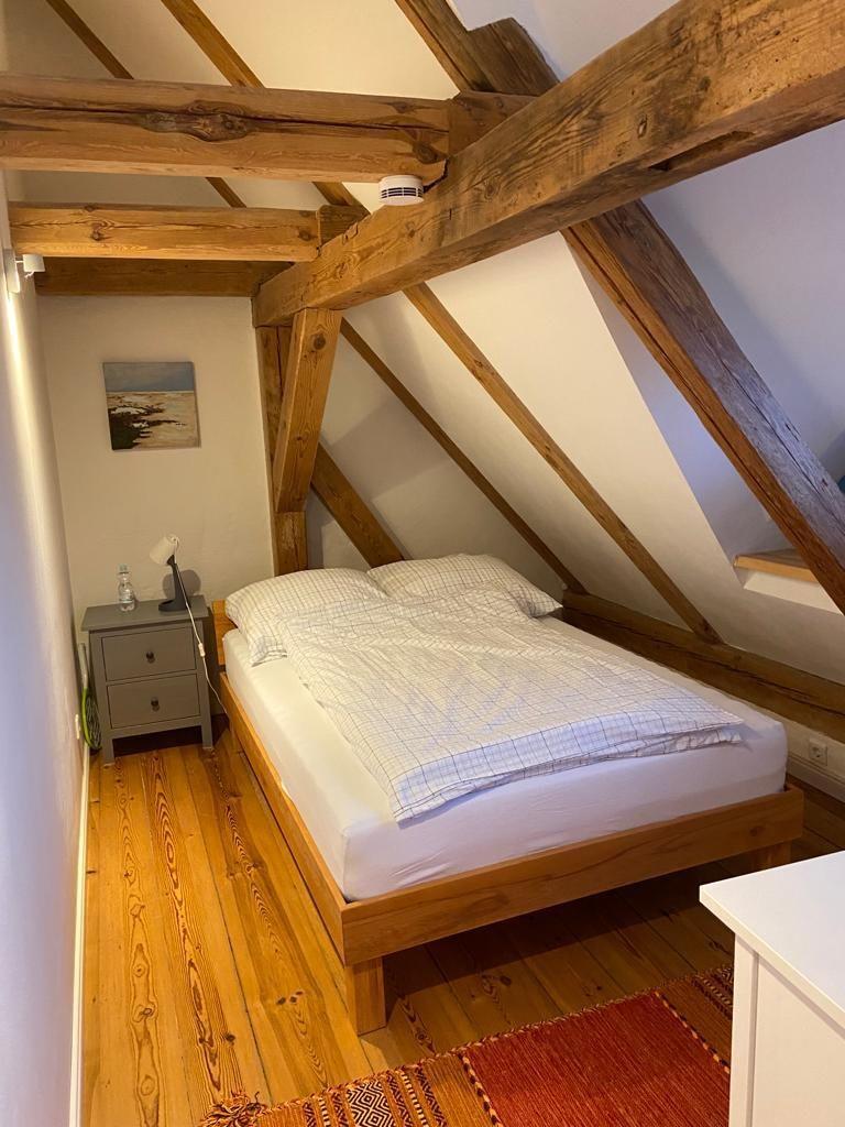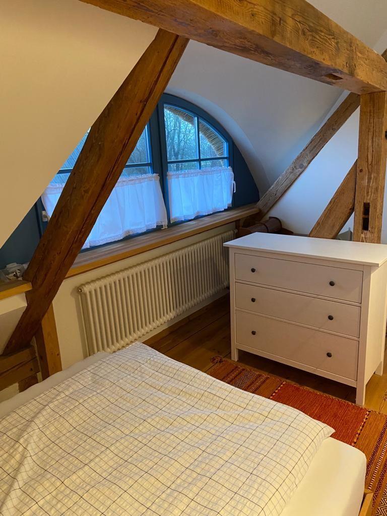 Im Obergeschoss befinden sich beide Schlafzimmer: Ein größeres mit einem 1,60 m breiten Bett und einem Kinderbett, ein weiteres mit 1,40 m Bett. Für Kinder gibt es eine kleine Spielhöhle in einer Dachschräge, ein Ort voller Fantasie und Versteckmöglichkeiten. Außerdem gibt es ein separates WC auf dieser Etage. Das Tageslichtbad mit Dusche im Erdgeschoss bringt zusätzlichen Komfort. Für Internet steht kostenfreies WLAN über einen Gigacube zur Verfügung.