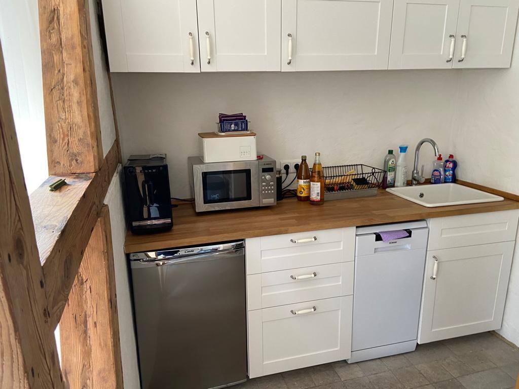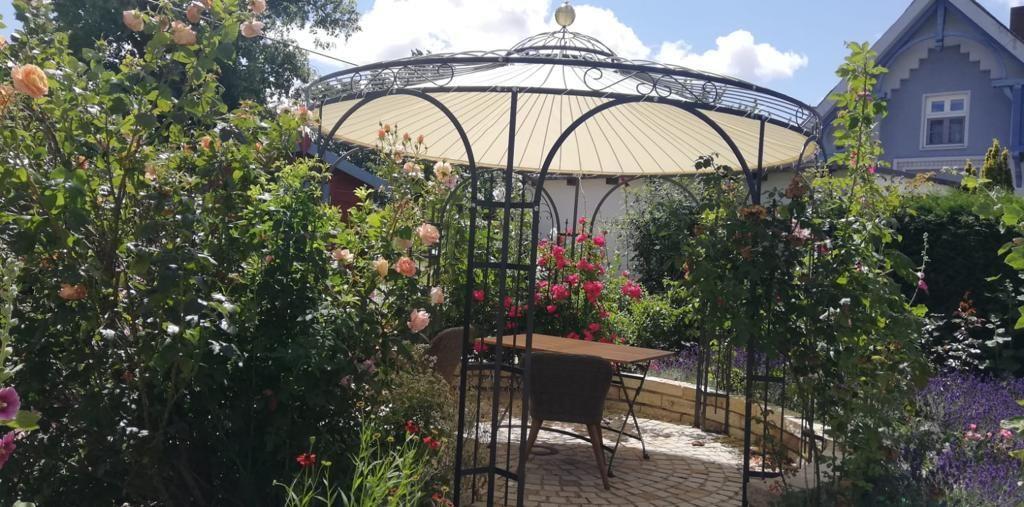 Im Erdgeschoss erwartet Sie ein behaglicher Wohnbereich mit Kaminofen, Sat-TV und Schlafsofa, der zum Verweilen und Entspannen einlädt. Direkt an das Wohnzimmer grenzt der Essbereich mit offener, voll ausgestatteter Küche. Von hier aus gelangen Sie hinaus in den herrlich angelegten, kleinen Garten, der mit bunten Blumen, duftenden Sträuchern und einem romantischen Pavillon ein kleines Naturparadies darstellt. Hier können Sie Ihre Mahlzeiten geschützt unter freiem Himmel genießen und den Tag in Ruhe ausklingen lassen.