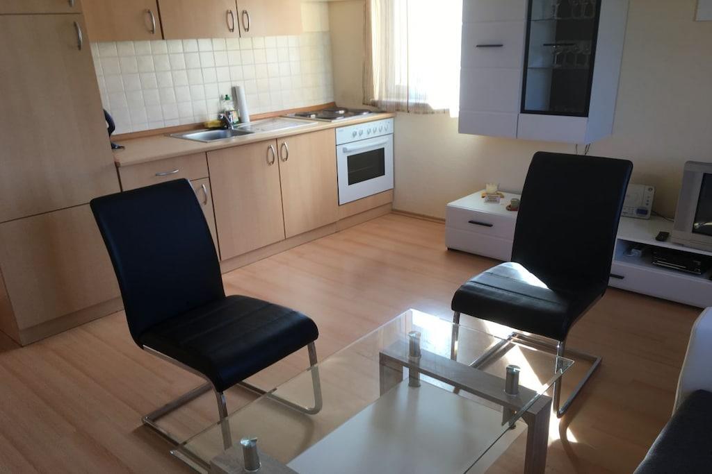 Mellemetage: (Køkken(mikrobølgeovn), stue / spisestue(Fjernsyn), badeværelse(, toilet, bruser, håndvask)) , , soveværelse(, dobbeltseng), Internetadgang, varme, terrasse(, havemøbler),