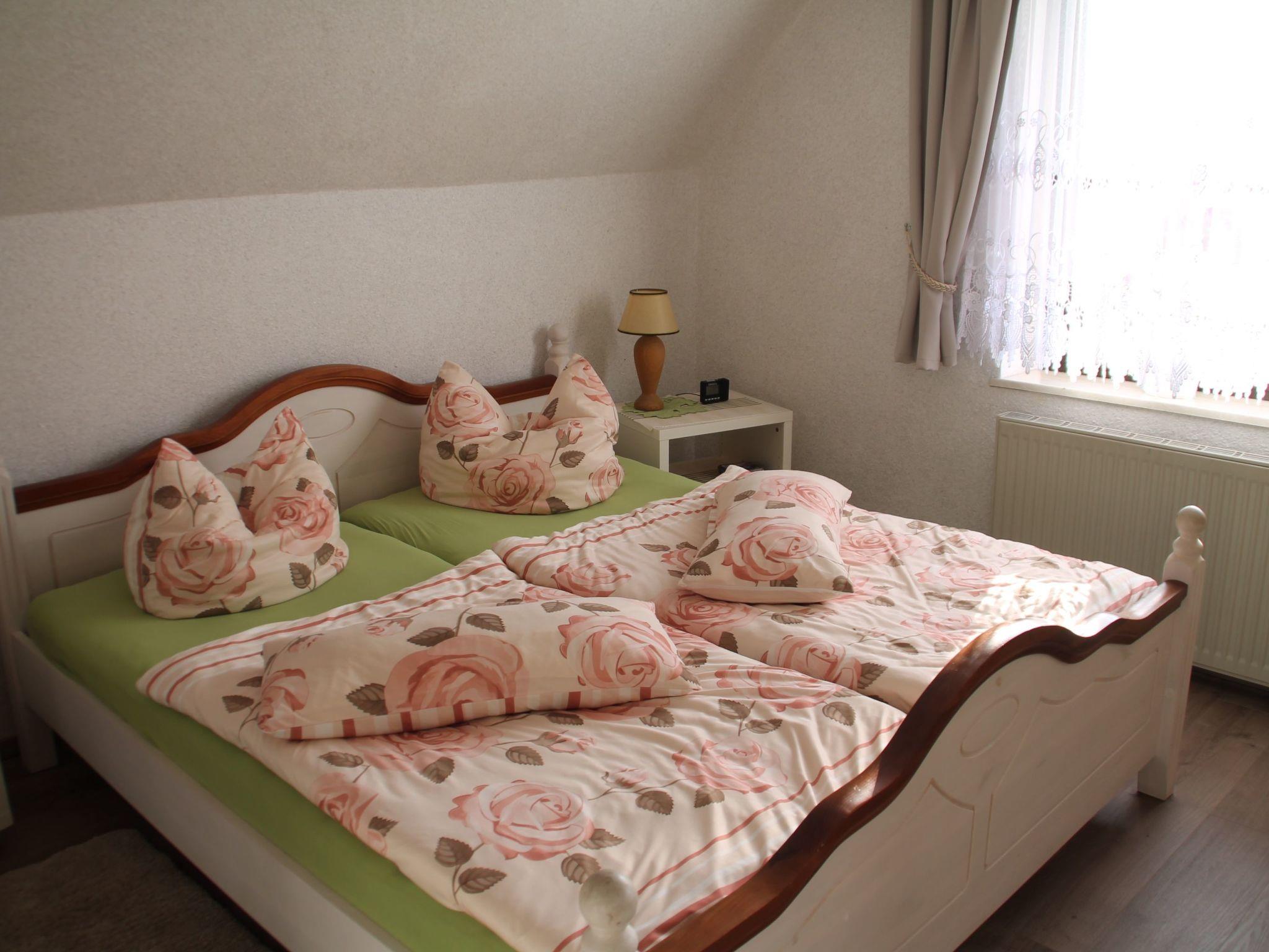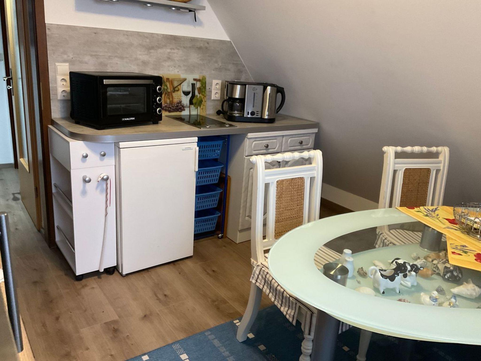Your holiday property: The holiday flat is surrounded by a 500 m² enclosed garden plot with meadow, trees, flowers and shrubs. The property is enclosed by a fence. The landlord lives permanently in the house. The holiday flat Fewo I (3 persons) with separate entrance is located in the basement of the house. The flat that can be booked here is on the top floor. Available for use: parasol, garden furniture and barbecue. your holiday flat: 3 rooms (including 1 bedroom), 50 sqm, max. 3 persons. Central heating. Entrance in the attic, via an internal staircase into the hallway with cloakroom. Kitchen with dining table, ceramic hob (2 hotplates), fridge with freezer compartment, coffee machine, toaster, electric kettle and microwave. Living room with cosy sofa seating area, TV and radio. Bedroom with 1 double bed. Bathroom with shower, 1 washbasin, WC and window. TV reception via satellite. pet: not allowed. location: Putbus. The holiday flat (built in 1980, renovated in 2015) is located in a detached house on the outskirts of the village in a quiet and sunny location. Access is via a side road. Car park on the public road. Shop 500 m, restaurant 600 m, centre 1000 m. Railway station 800 m. In Sellin: indoor swimming pool and sauna 17 km. Indoor playground "Pirateninsel" 150 m, chalk cliffs Königsstuhl 22 km, Stralsund 30 km. in summer:Rügischer Bodden 2 km in Neuendorf (beach with meadow and sand). Golf in Karnitz. Minigolf in Sellin 10 km. Horse riding in Altkamp 3 km. Baltic Sea with sandy beach 12 km, Störtebeker Festival in Ralswiek from the end of June to the beginning of September 14 km. Brief descriptionOther : Non-smoking houseShort description 1Number of kitchens : 1SurroundingsSports facilities in the area : Football pitch, cycling tours, indoor riding arena, riding arena / riding facilities, sailing, sports centre, surfing, water skiingGarden and outdoor facilitiesGarden equipment : Garden furniture available, barbecue