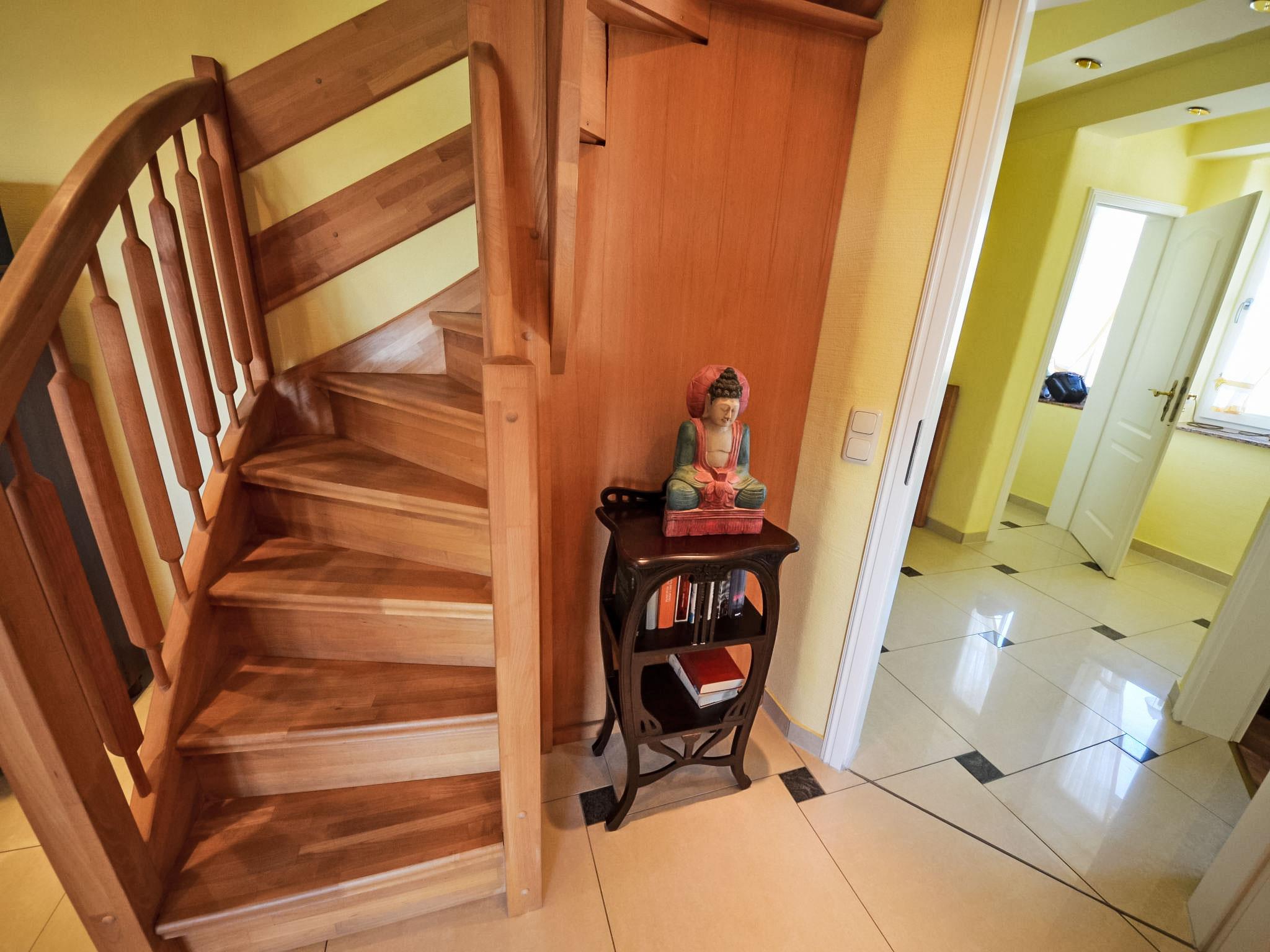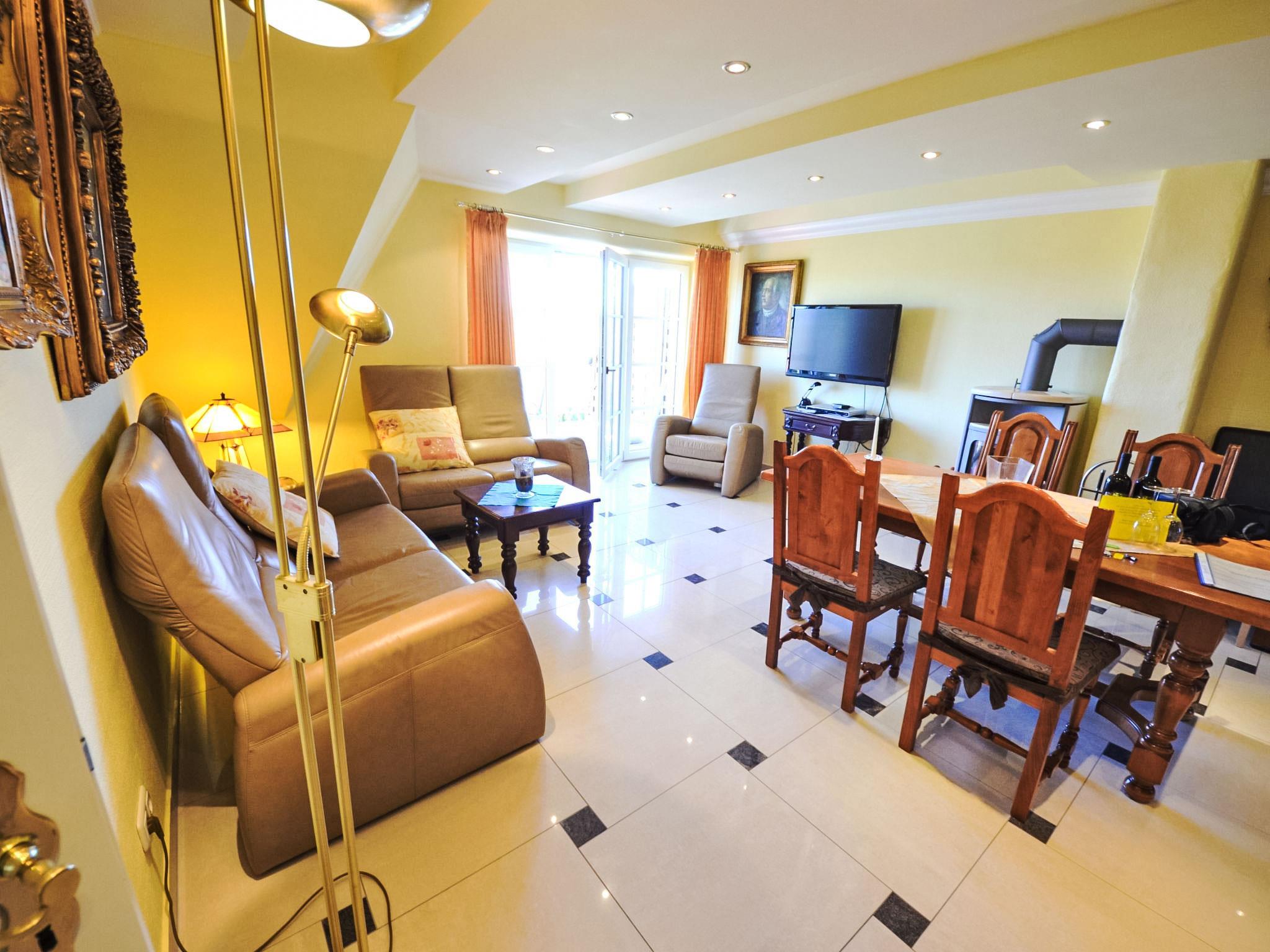 "Sonnenkliff", 4-room maisonette 86 m2 on 2 levels on 1st floor. Partly with sloping ceilings, comfortable and tasteful furnishings: living/dining room with Scandinavian wood stove, satellite TV, hi-fi system and DVD. Exit to the balcony, south facing position. 1 double bedroom with radio. Open kitchen (oven, dishwasher, microwave, freezer, electric coffee machine). Bath/bidet/WC. Top floor: 1 room with 1 double bed (160 cm, length 200 cm). 1 room with 1 double bed (160 cm, length 200 cm), satellite TV. Shower/WC. Balcony furniture. Facilities: washing machine, dryer, logs (free). Internet (WiFi, free). Parking (2 cars) at the house. Please note: non-smokers only. Maximum 1 pet/ dog allowed. Private entrance, smoke alarm. Two free parking spaces available. Additional parking spaces can be provided at a price of EUR 4.00 / day at a distance of 300 m, on request and after pre-order.
