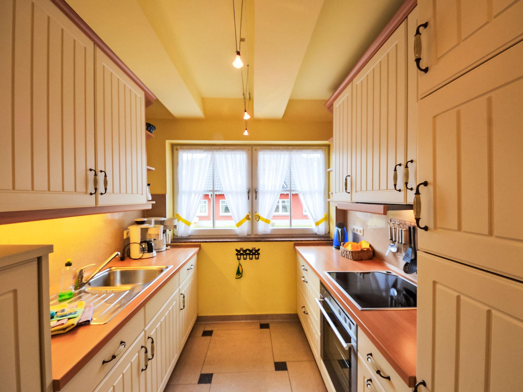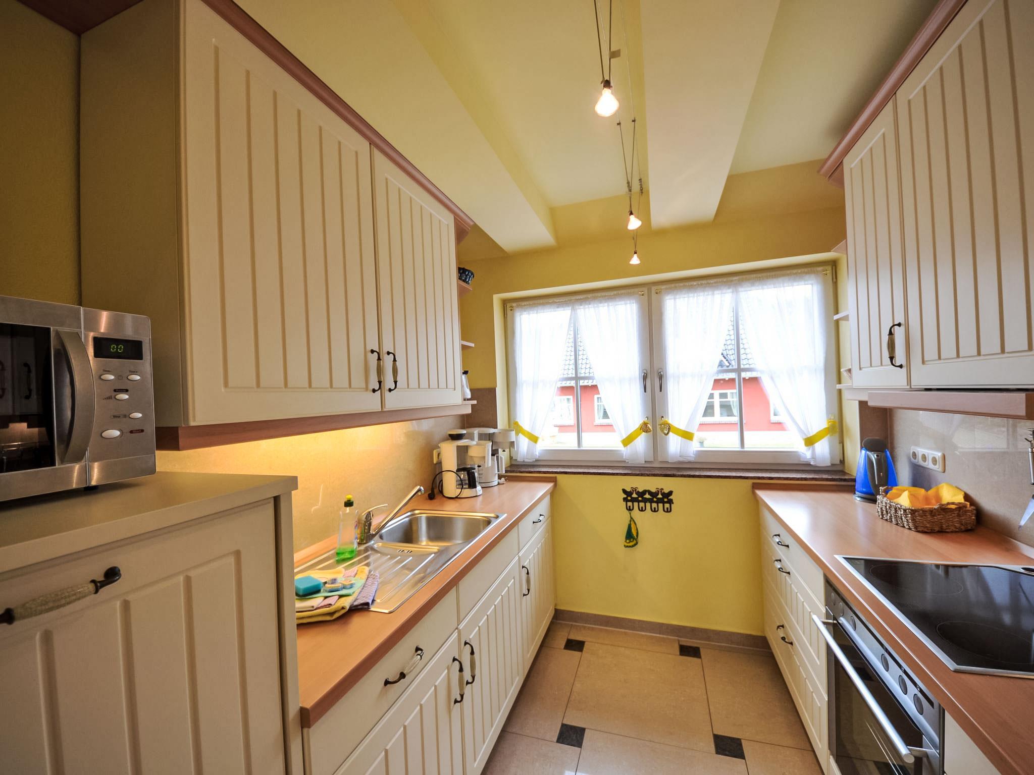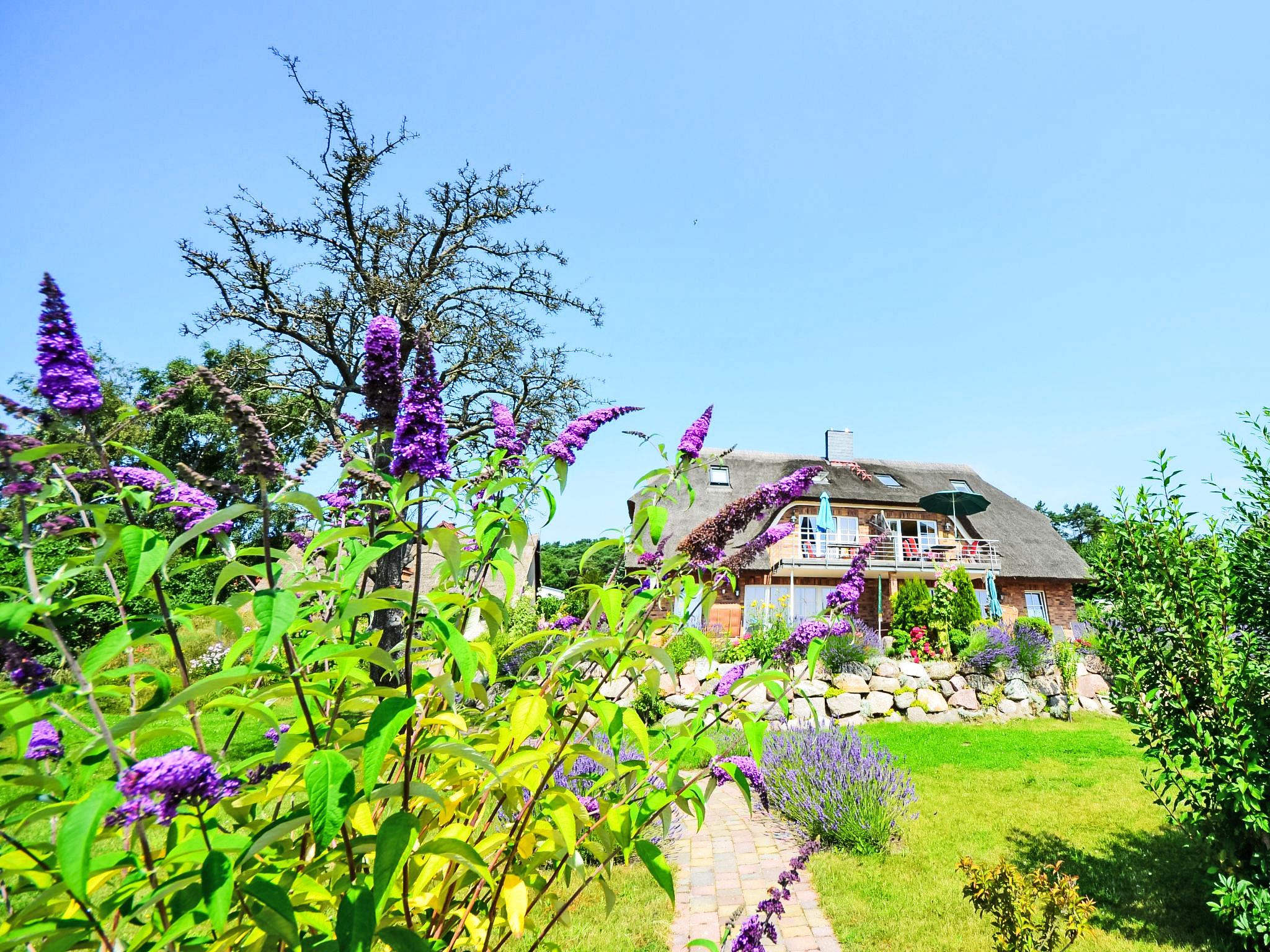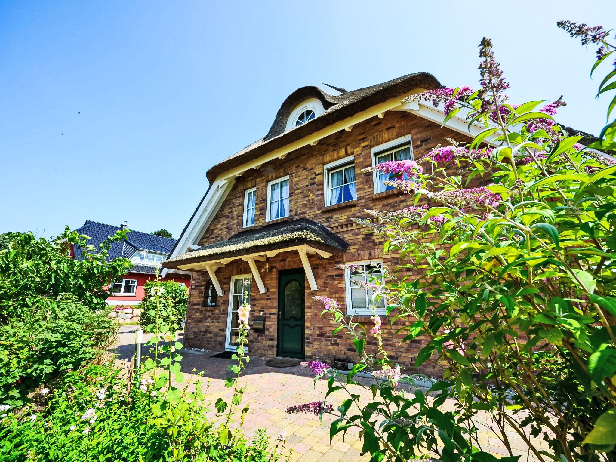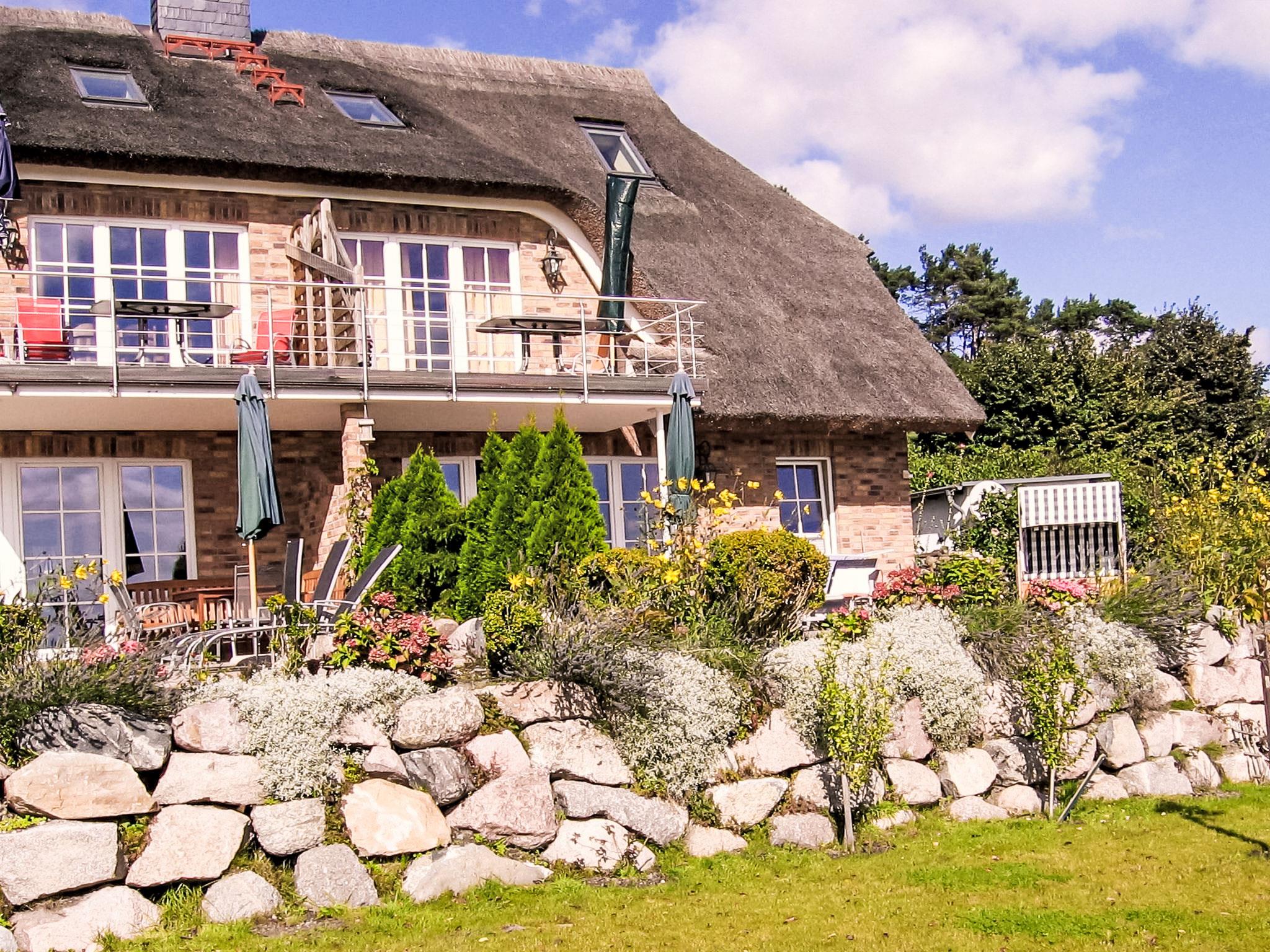 Semi-detached house. In the resort, 500 m from the sea, 2 km from the beach. For shared use: beautiful, well-kept garden. Barbecue, barbecue house. In the house: central heating system. Parking (limited number of spaces) at the house. Grocery 500 m, restaurant, bus stop 300 m, railway station 20 km, sandy beach 2 km, outdoor swimming pool 13 km, indoor swimming pool 13 km, swimming bay 2 km. Golf course (18 hole) 30 km, riding stable 5 km. The two reeded semi-detached houses including two apartments each are located in the first row facing the sea. All apartments offer direct views of the Baltic Sea, the small Gross Zicker harbour and the towns of Thissow and Klein Zicker situated opposite the bay. The holiday apartments have a high-quality and perfectly matching interior. Bicycles for hire.