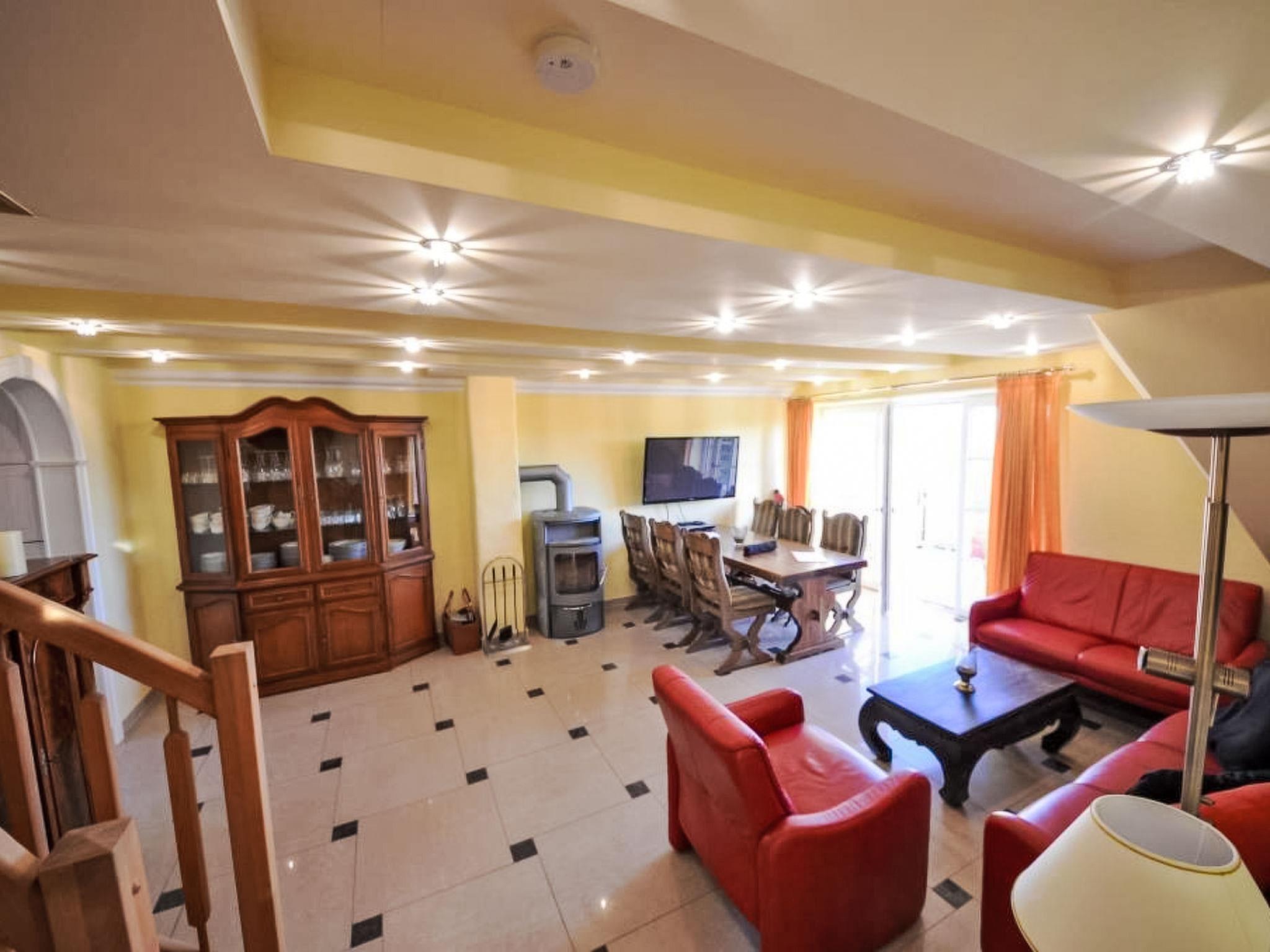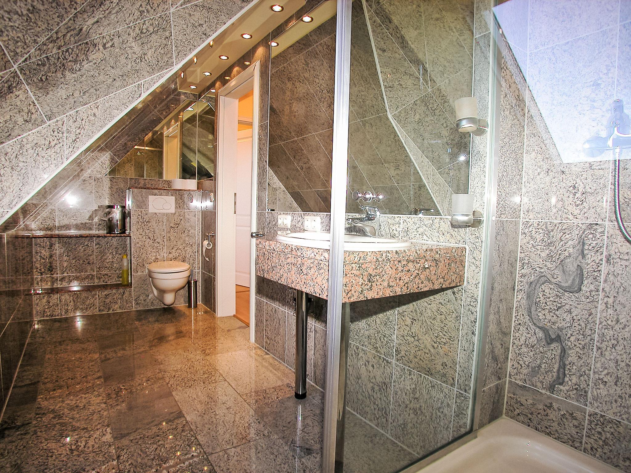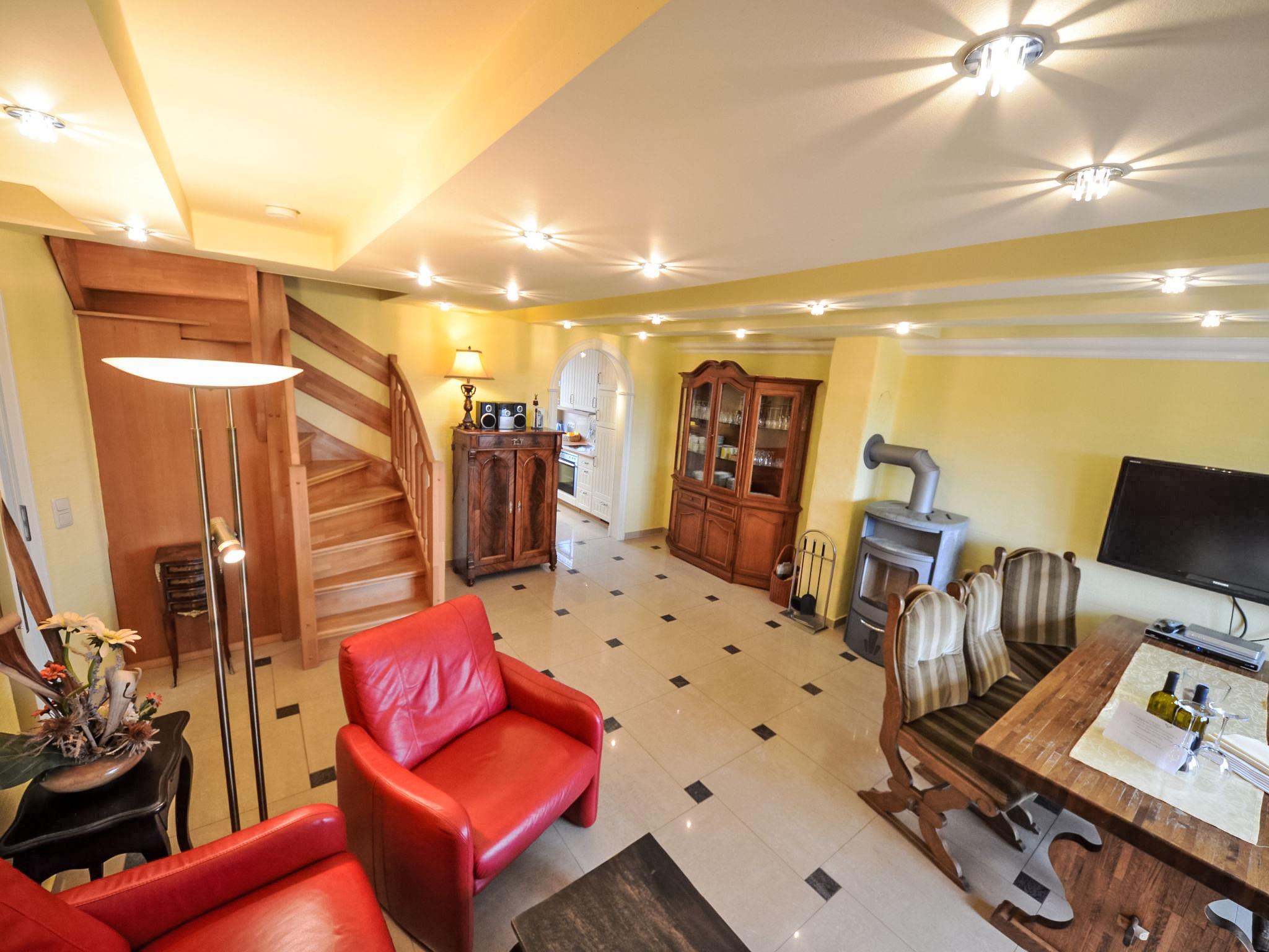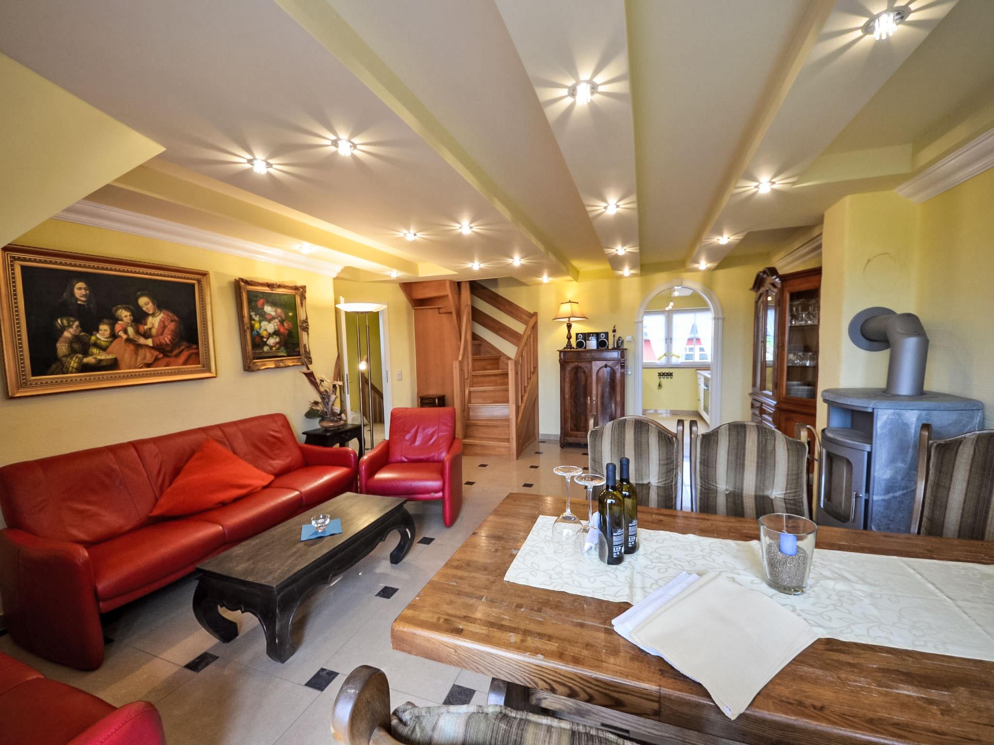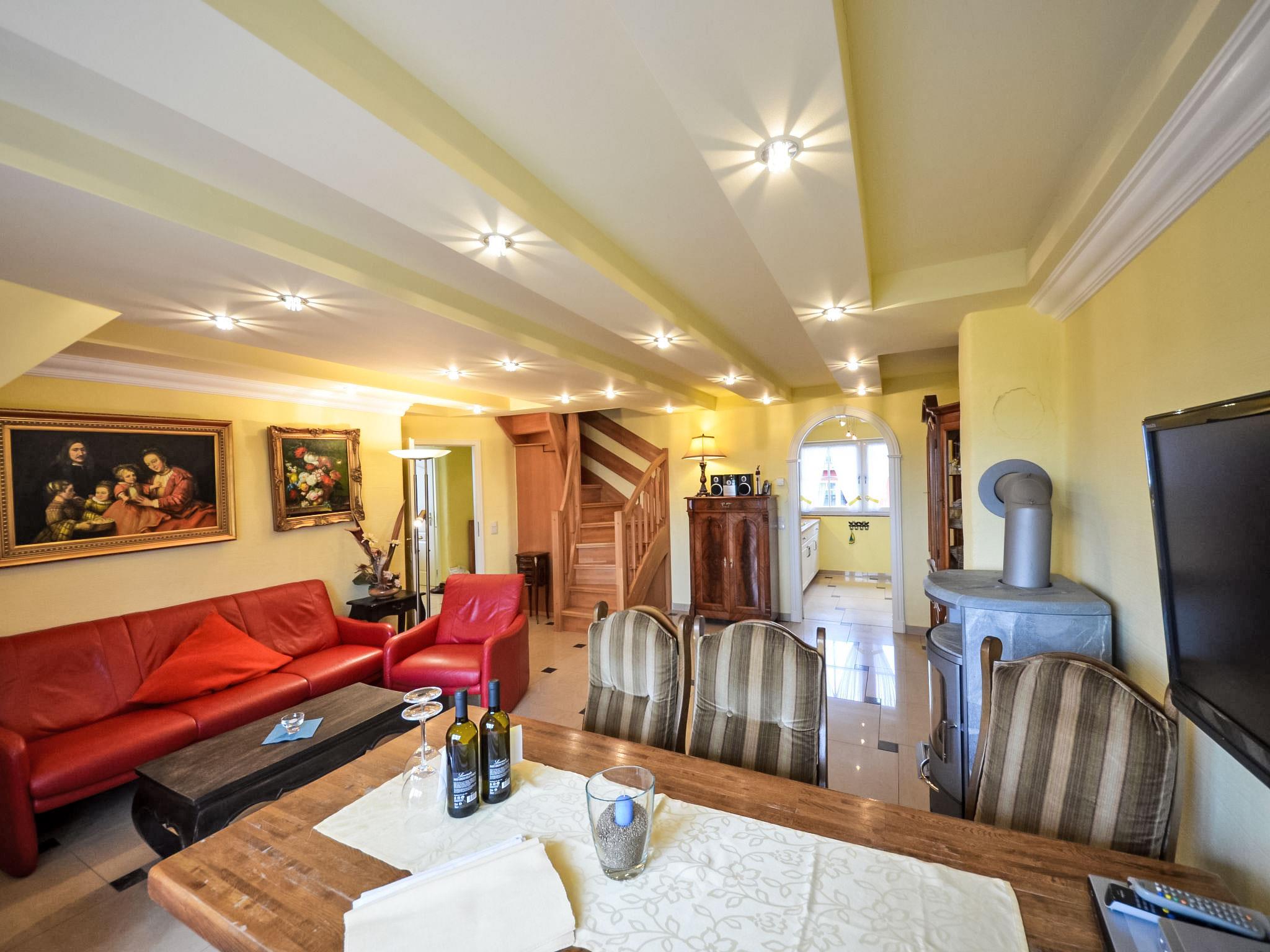 "Sonnenkamp", 4-room maisonette 86 m2 on 2 levels on 1st floor. Partly with sloping ceilings, comfortable and tasteful furnishings: living/dining room with Scandinavian wood stove, satellite TV, hi-fi system and DVD. Exit to the balcony, south facing position. 1 double bedroom with radio. Open kitchen (oven, dishwasher, microwave, freezer, electric coffee machine). Bath/bidet/WC. Top floor: 1 room with 1 double bed (160 cm, length 200 cm). 1 room with 1 double bed (160 cm, length 200 cm), satellite TV. Shower/WC. Balcony furniture. Facilities: washing machine, dryer, logs (free). Internet (WiFi, free). Parking (2 cars) at the house. Please note: non-smokers only. Maximum 1 pet/ dog allowed. Private entrance, smoke alarm. Two free parking spaces available. Additional parking spaces can be provided at a price of EUR 4.00 / day at a distance of 300 m, on request and after pre-order.