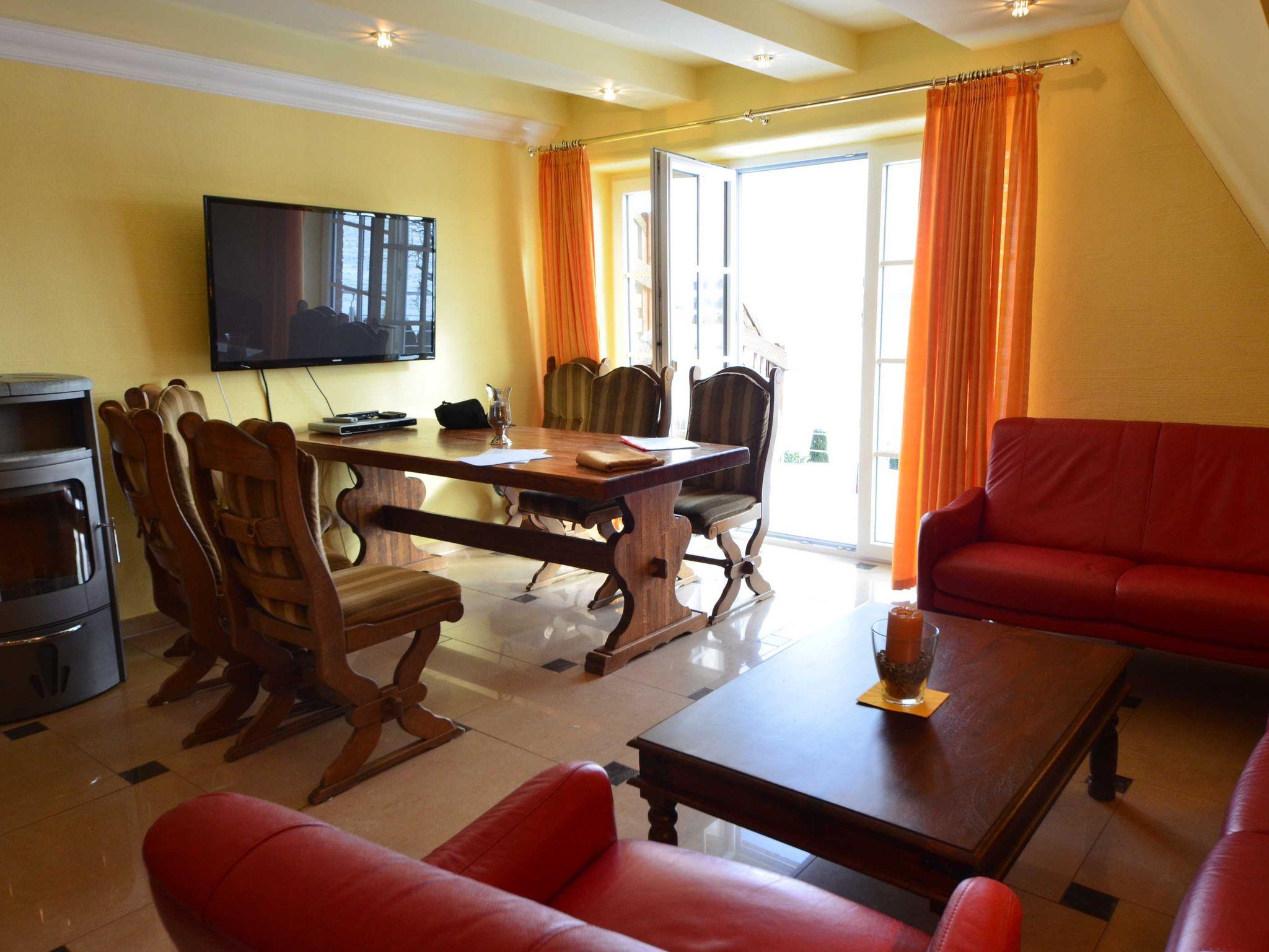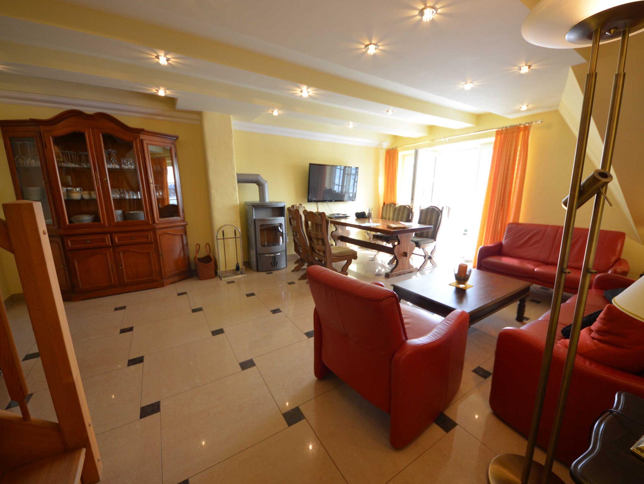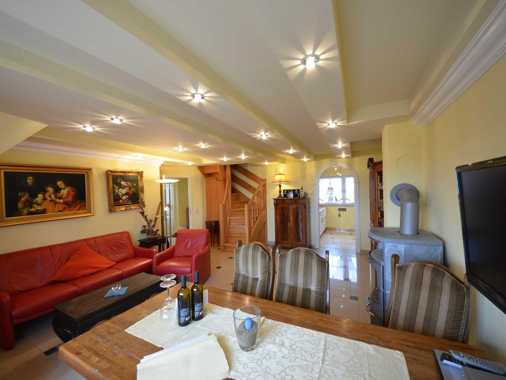 Hark-Kaminofen, antike Vitrinen, kleine Bücherauswahl, Plasma-TV mit 125 cm Großbild, Fußbodenheizung, DVD-Recorder, Stereoanlage, CD-Player, Kinderhochstuhl, Wände dekoriert mit Spiegeln und Gemälden, sehr ansprechende