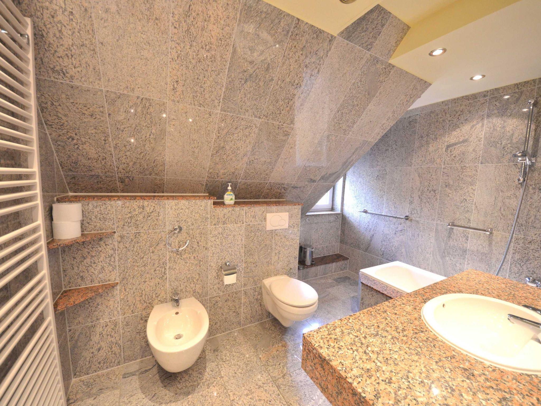 Ein Bad mit Badewanne (mit Glas-Duschabtrennung), Toilette und Bidet. Zweites Bad mit Duschbad, Granitverkleidung, Fußbodenheizung, Granit - Abdeckungen, große Spiegel, schöne Sanitärausstattung, Einbau-Waschbecken, beheizbarer Handtuchhalter, Fön, Schminkspiegel, dekorative Beleuchtung.