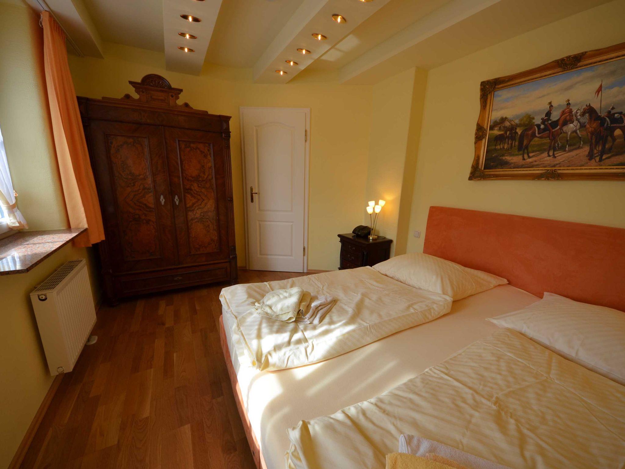 Ein Schlafzimmer mit 1,80 x 2,00 m Bett und zwei Schlafzimmer mit jeweils 1,60 x 2,00 m Bett, Radiowecker, Wände mit Bildern dekoriert, antiker Gründerzeit-Wäsche-/Kleiderschrank, elektrische Rolläden, Fenster mit Mückenschutz. Nach Voranmeldung: ein Babyreisebett (kostenlos) mit Bettwäsche.