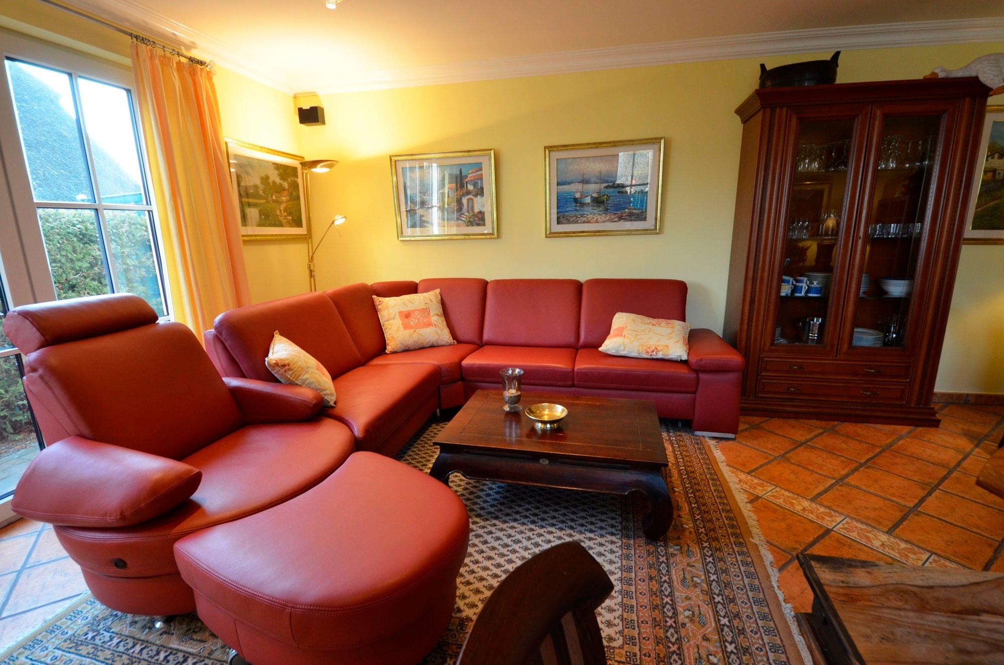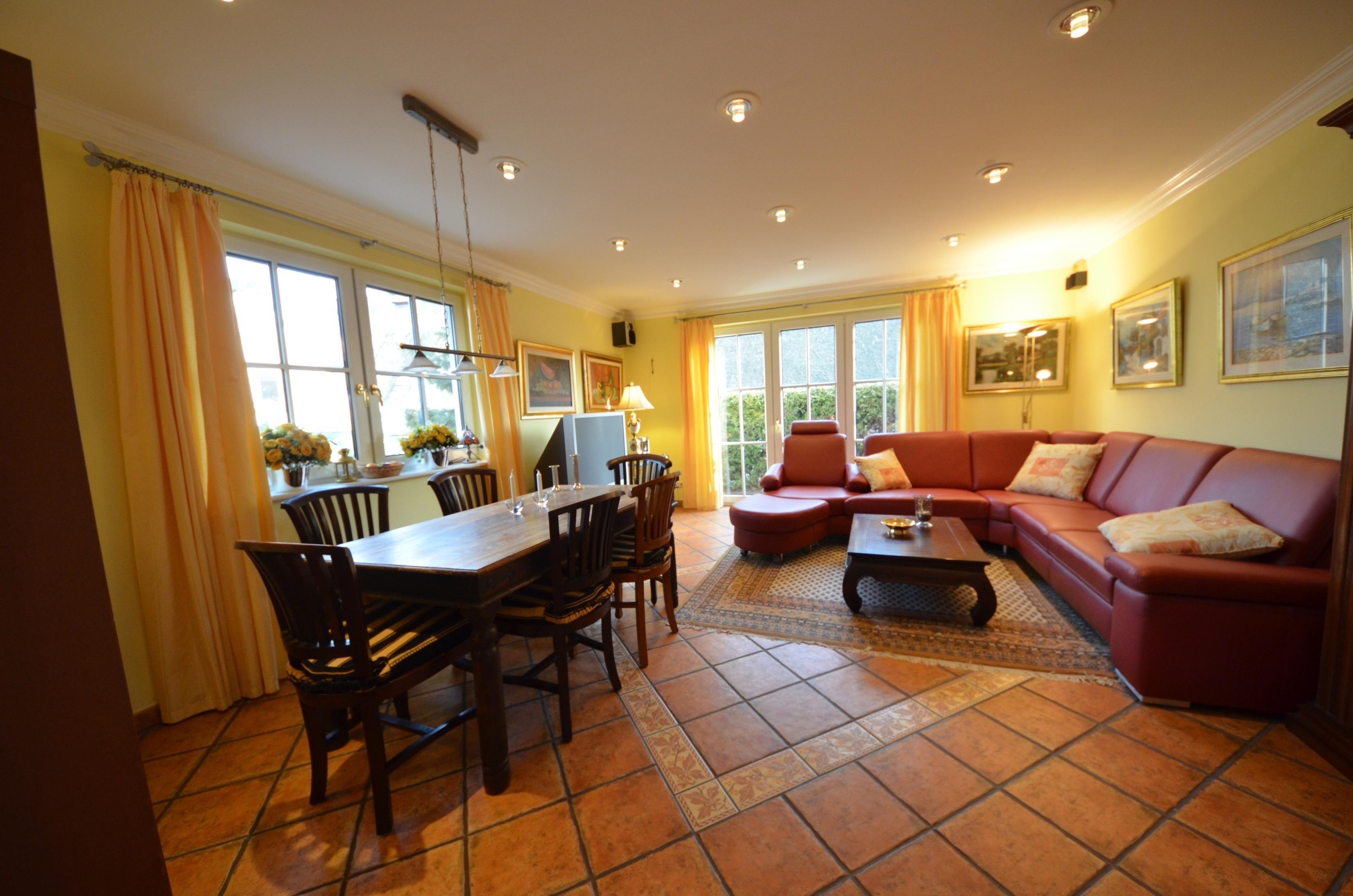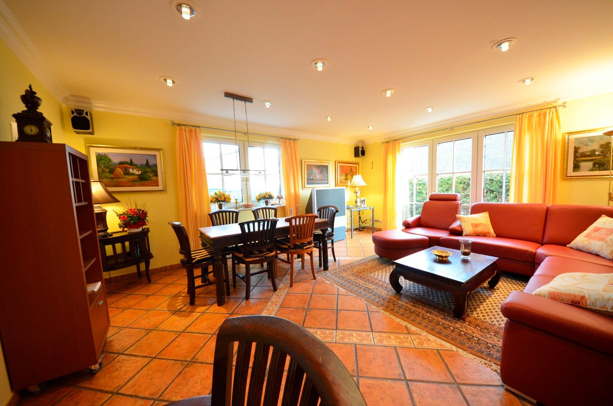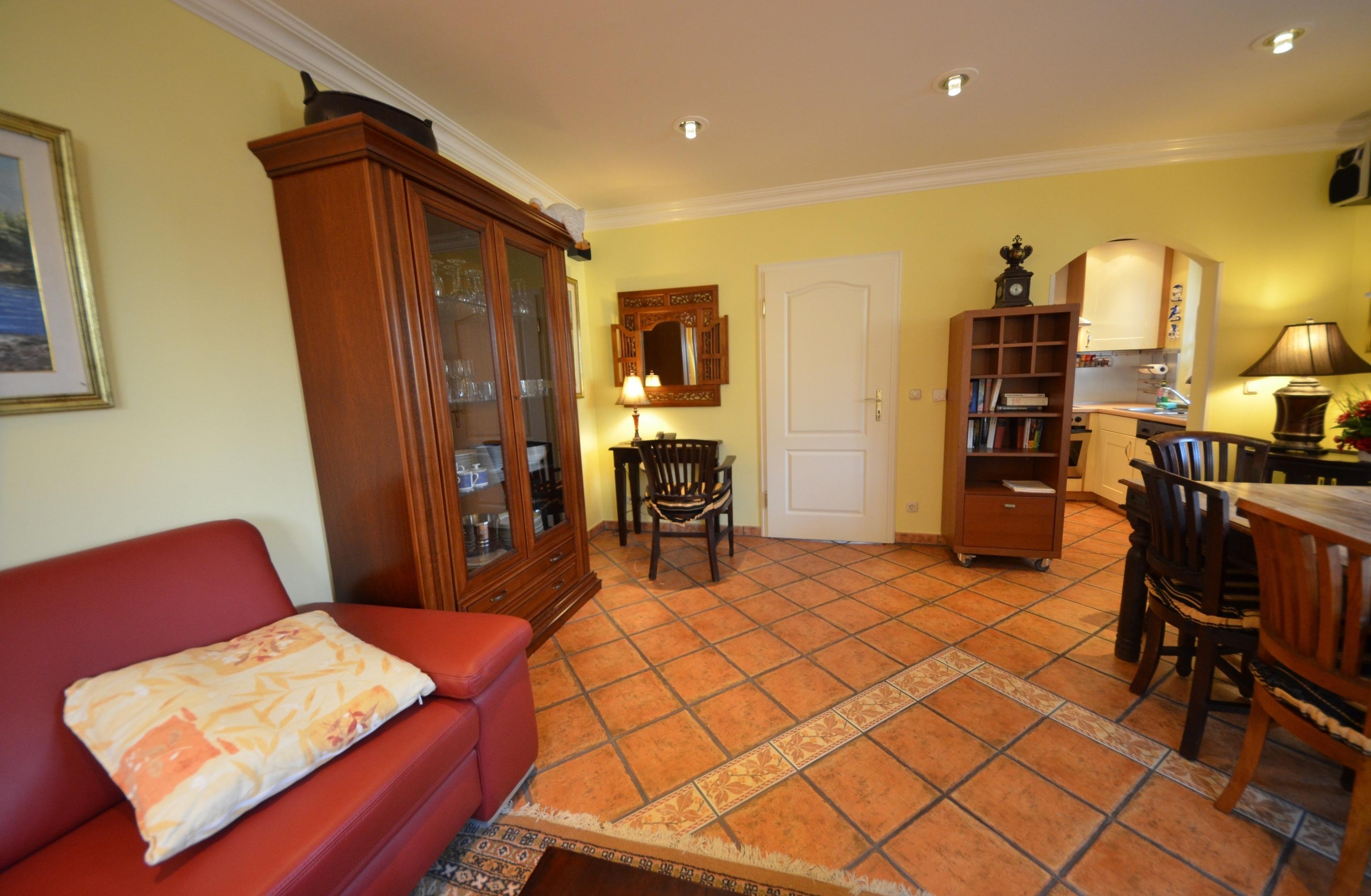 Wohn- Esszimmer mit Fußbodenheizung, Ausgang zur Terrasse. Schöne Couch-Garnitur und Opiumtisch, Telefon, 150cm - Flachbild - TV mit ca. 40Programmen, Stereo / CD, Speisetafel mit 6 Stühlen, Geschirrschrank, Telefontisch mit balinesischem Spiegel, Kinderhochstuhl, Wände dekoriert mit Bildern, dekorative Beleuchtung, Garten mit Terrasse und Gartenmöbeln, Liegen, Gartengrill.